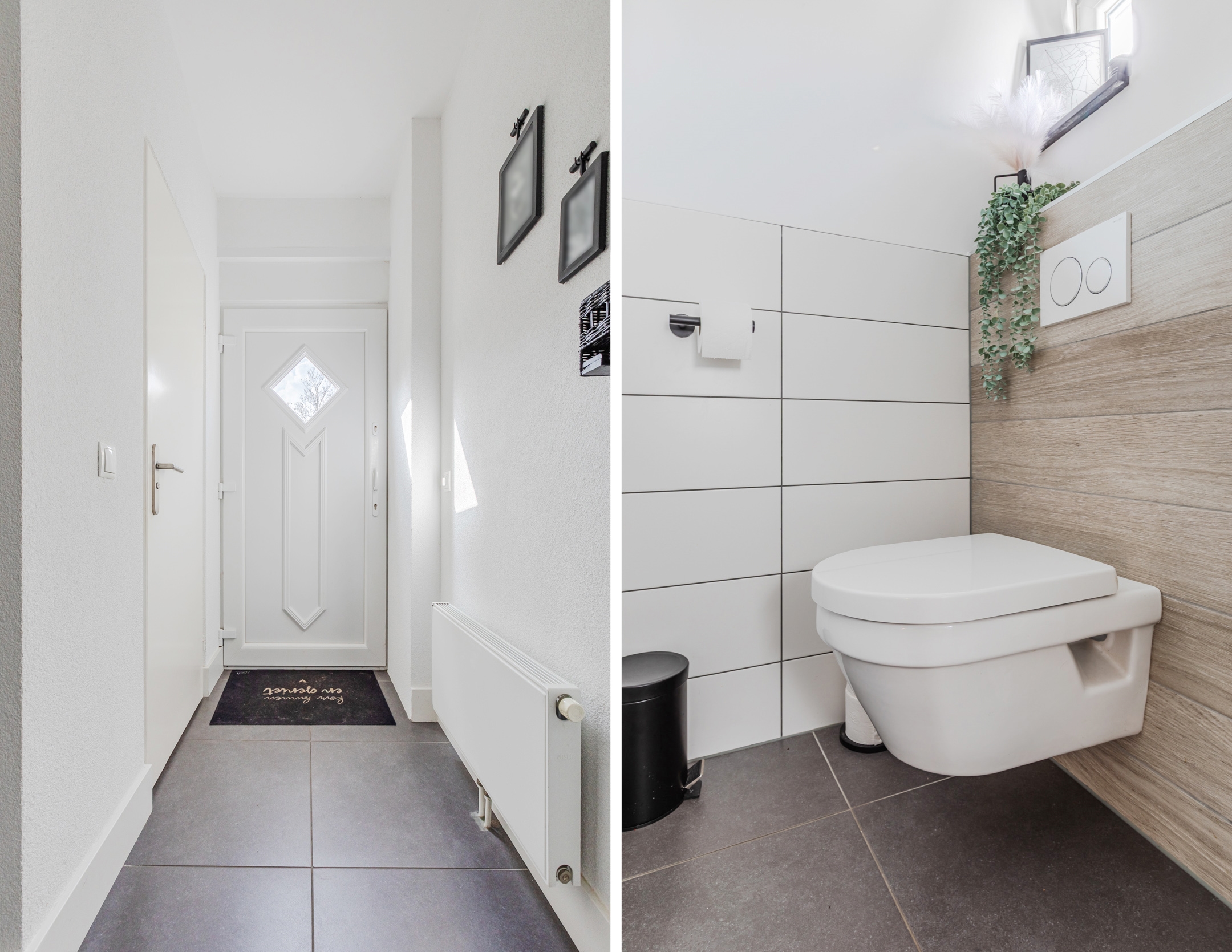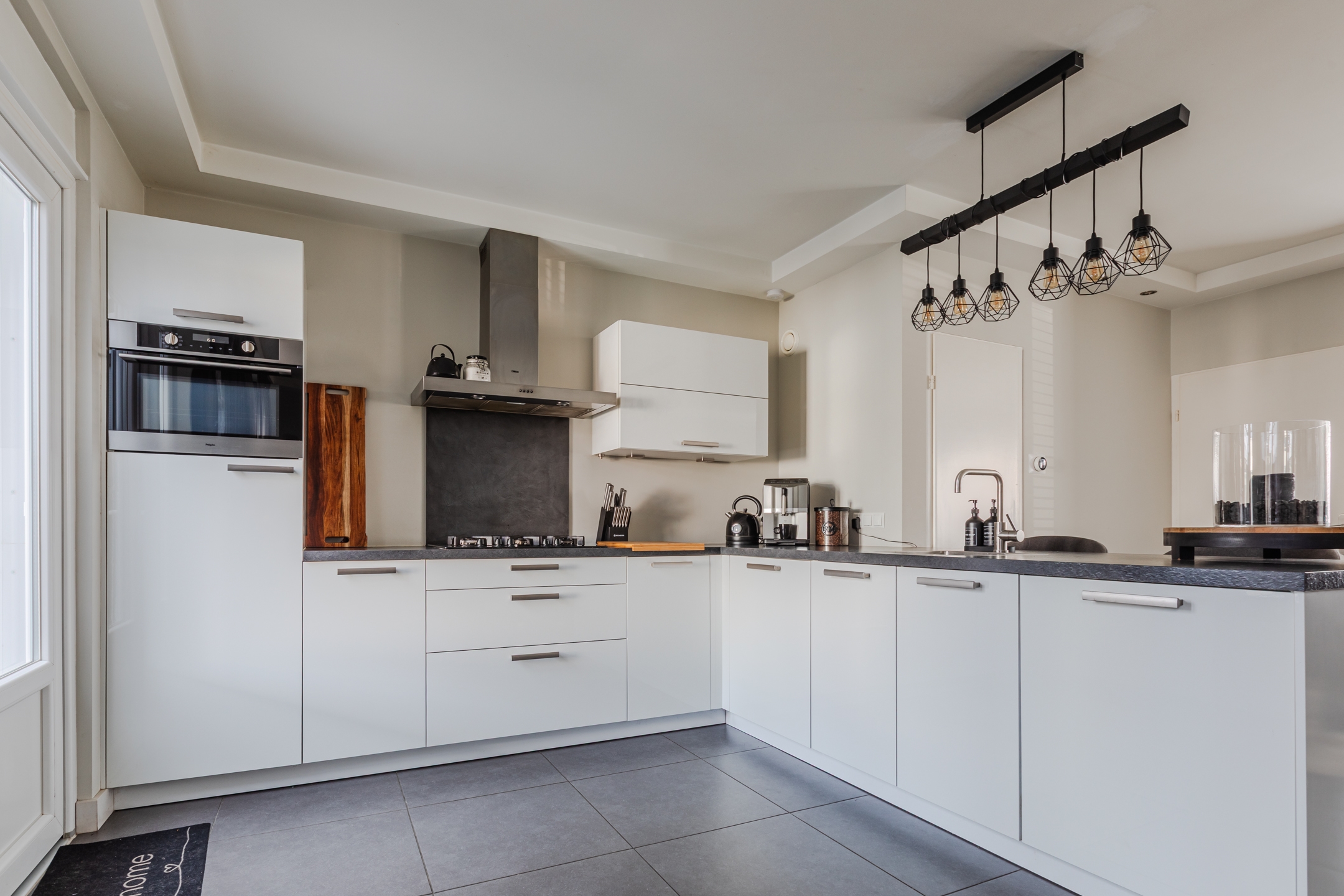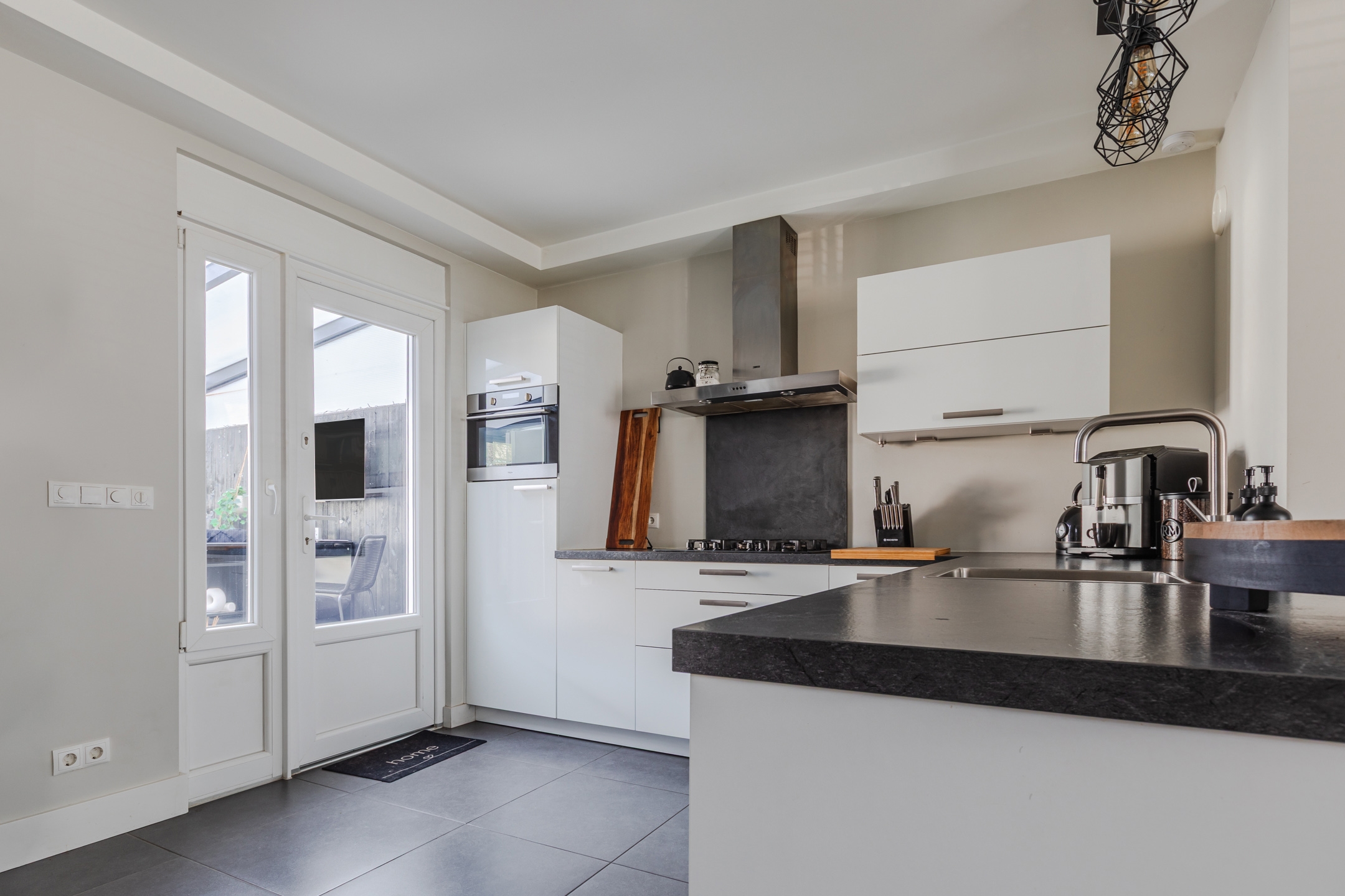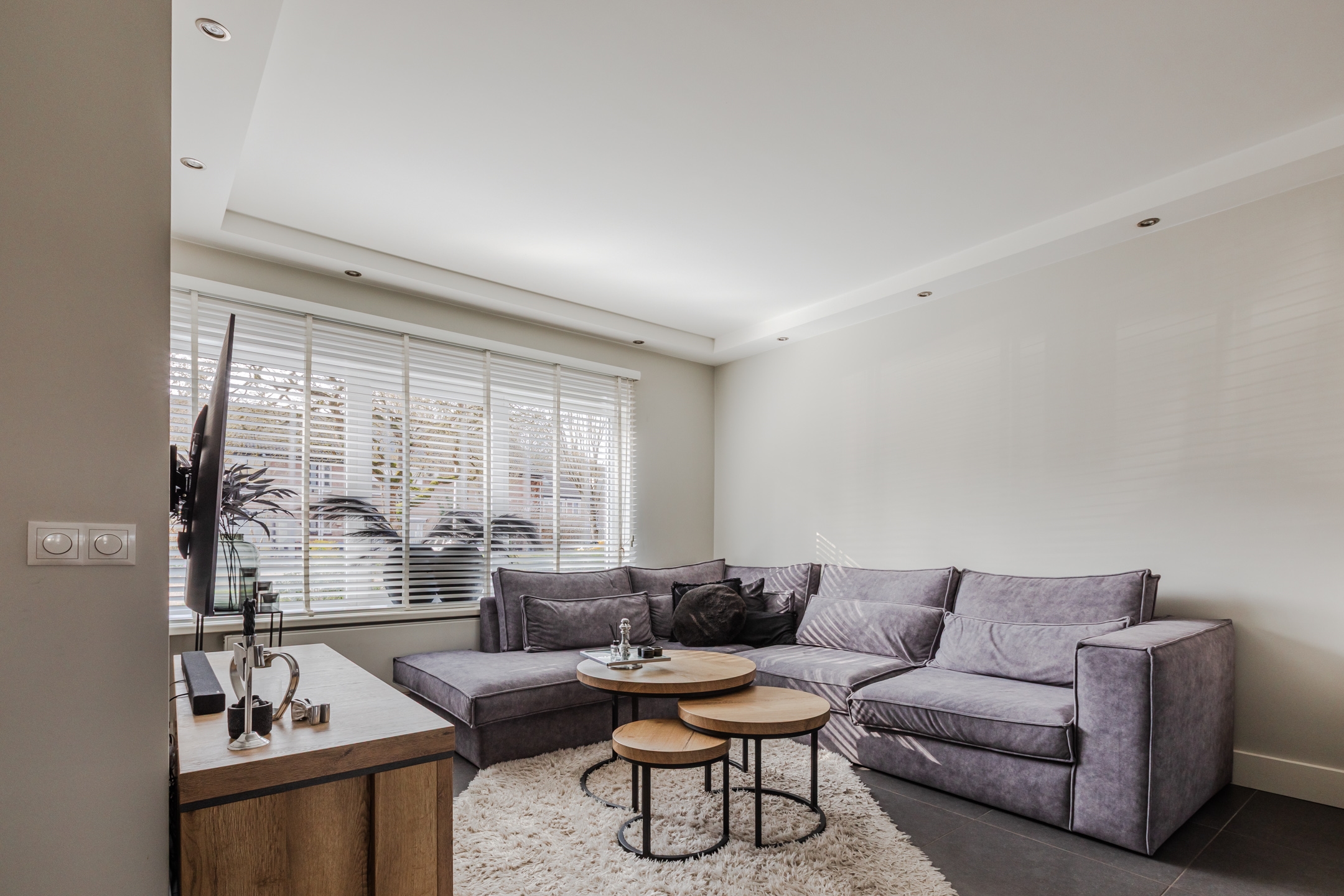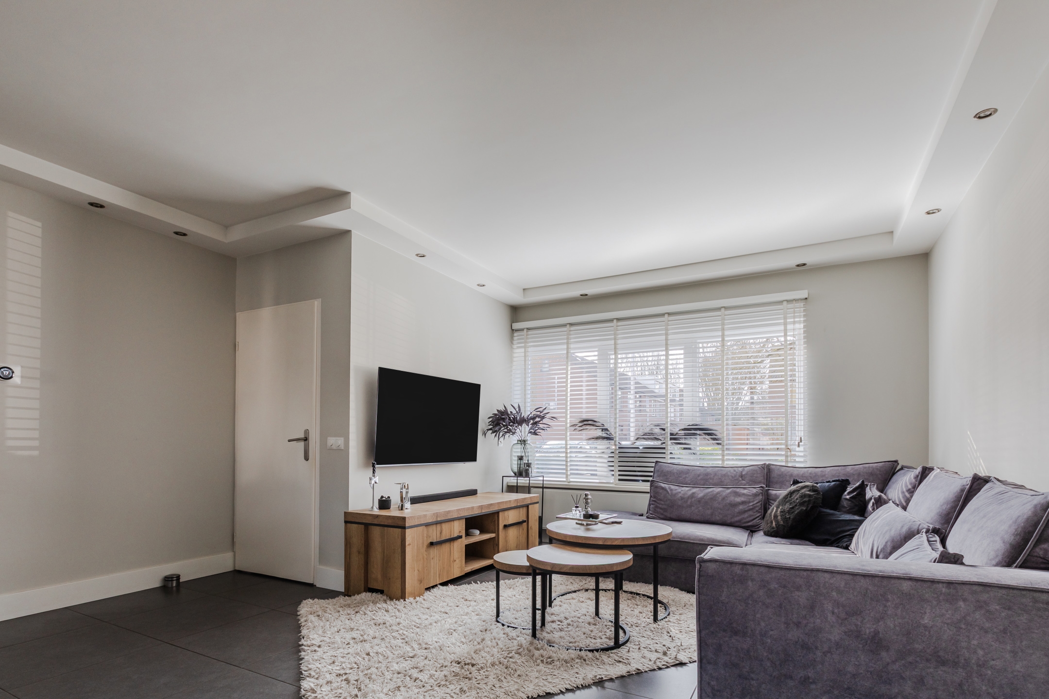 De strak gestucte muren, de moderne tegelvloer en de inbouwspots in het plafond geven de woning een hoogwaardige uitstraling.