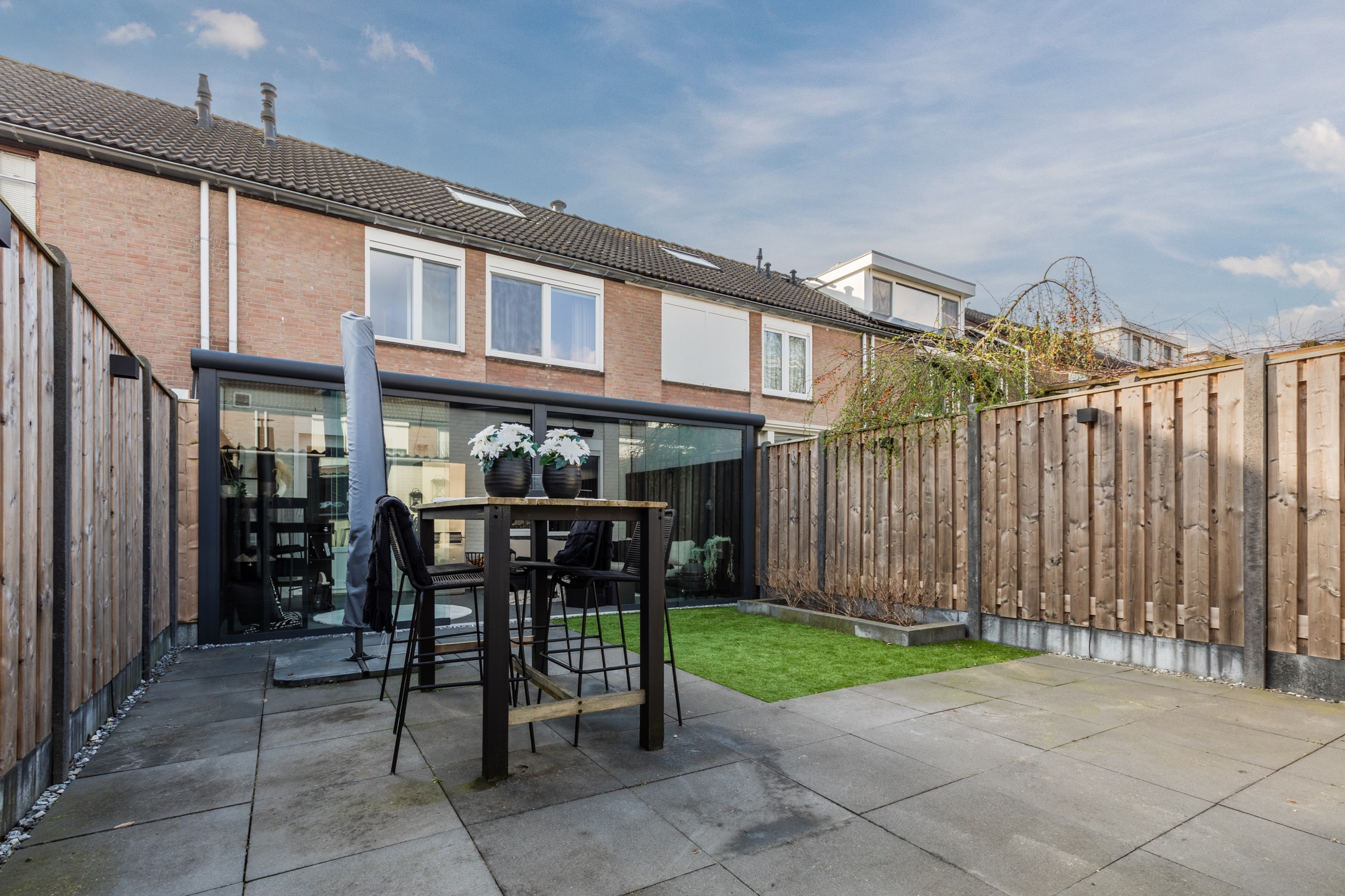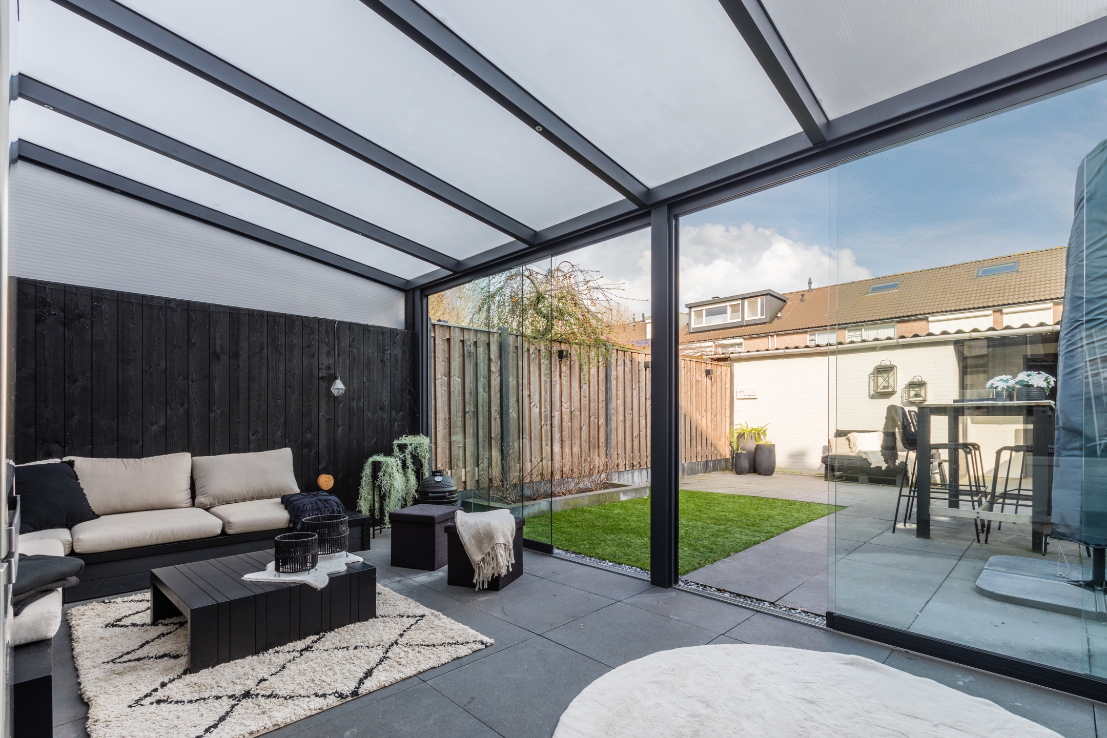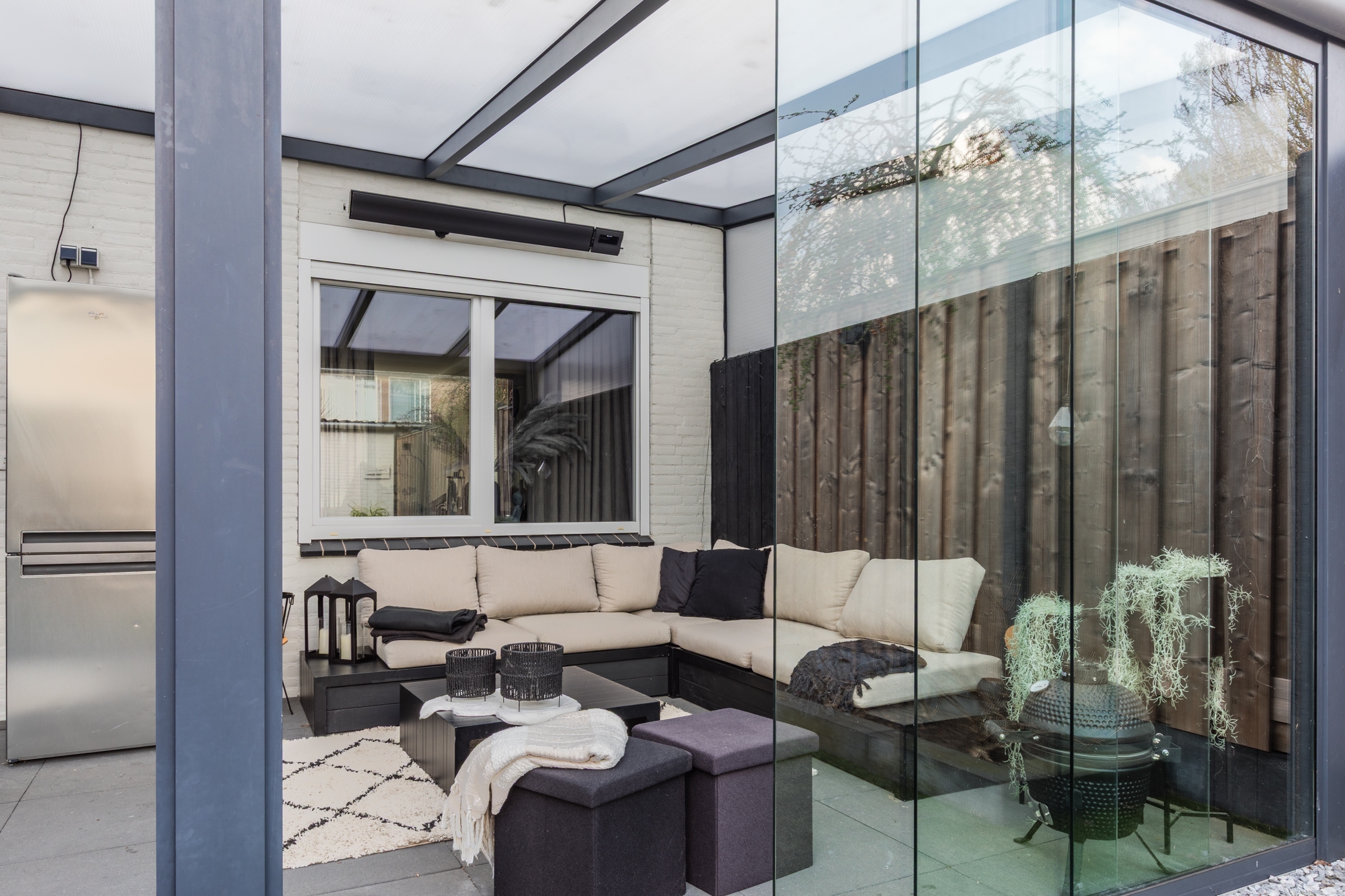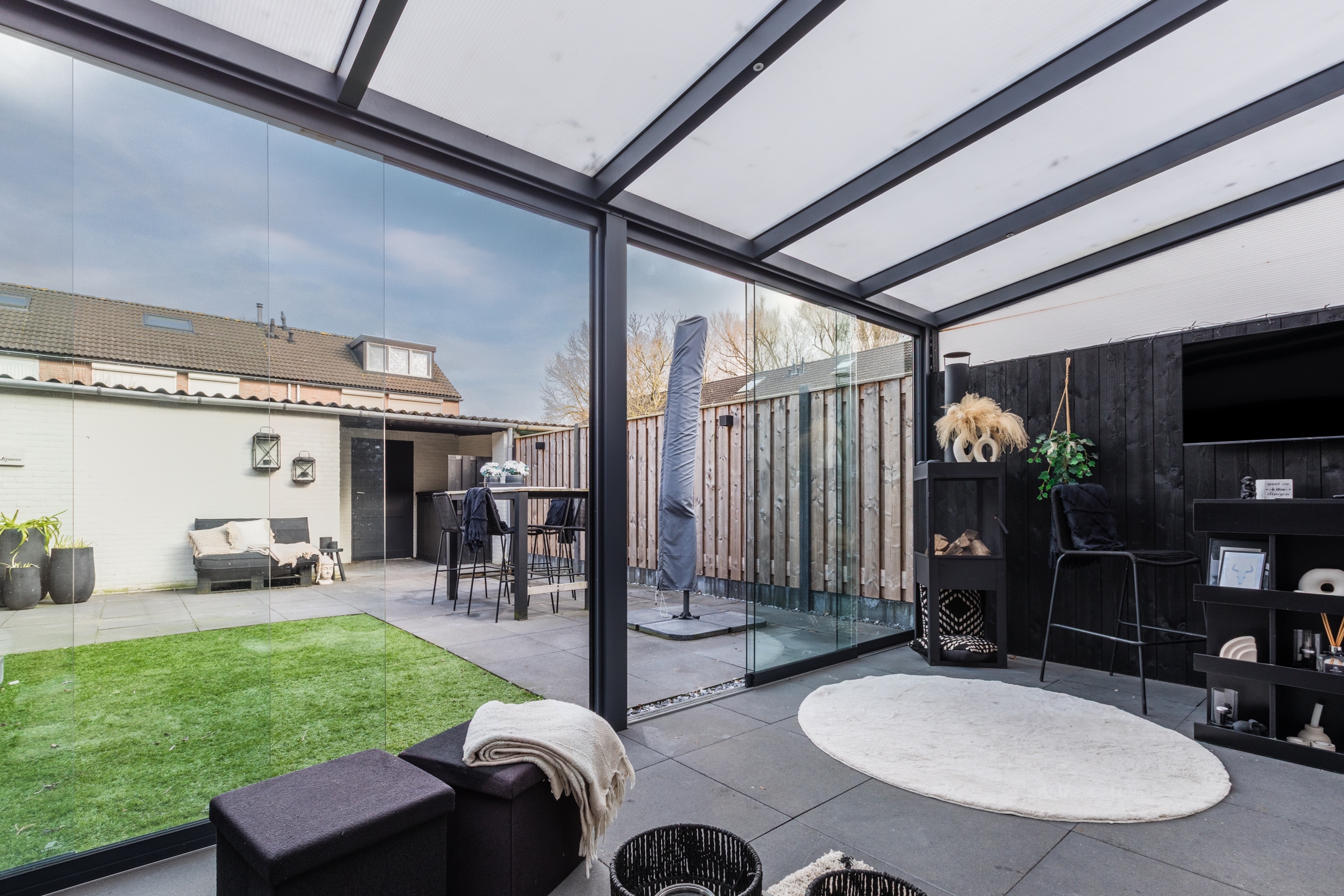 De serre is volledig af te sluiten met een glazen schuifpui en voorzien van verlichting en TV-aansluiting.
