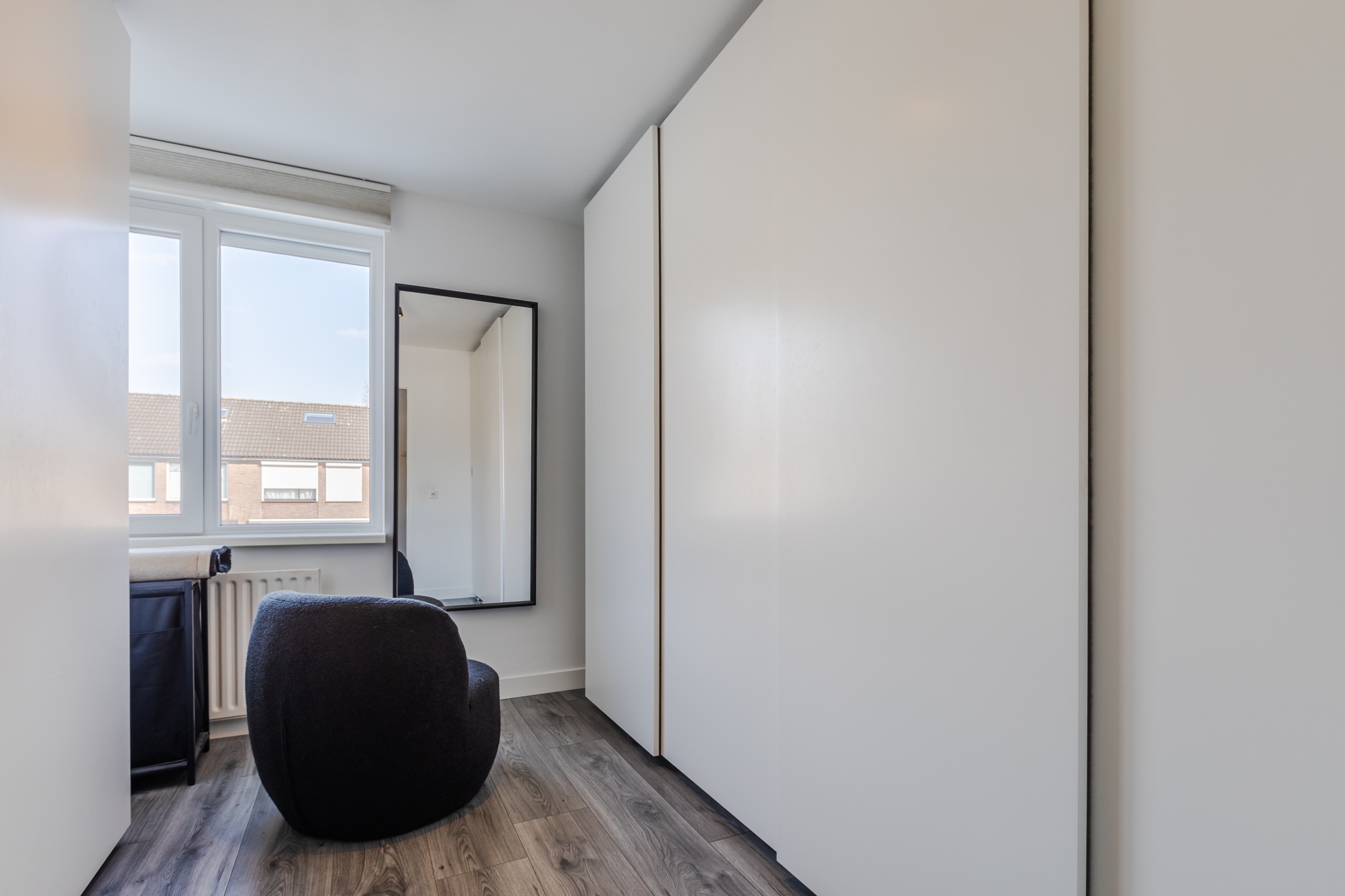 Op de eerste verdieping kom je via de overloop bij drie volwaardige slaapkamers, allemaal voorzien van een mooie grijze laminaatvloer, strak stucwerk en inbouwrolluiken.
