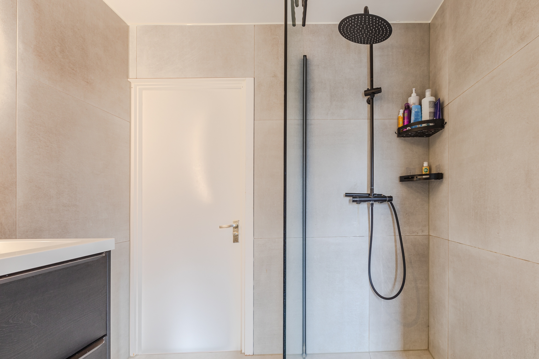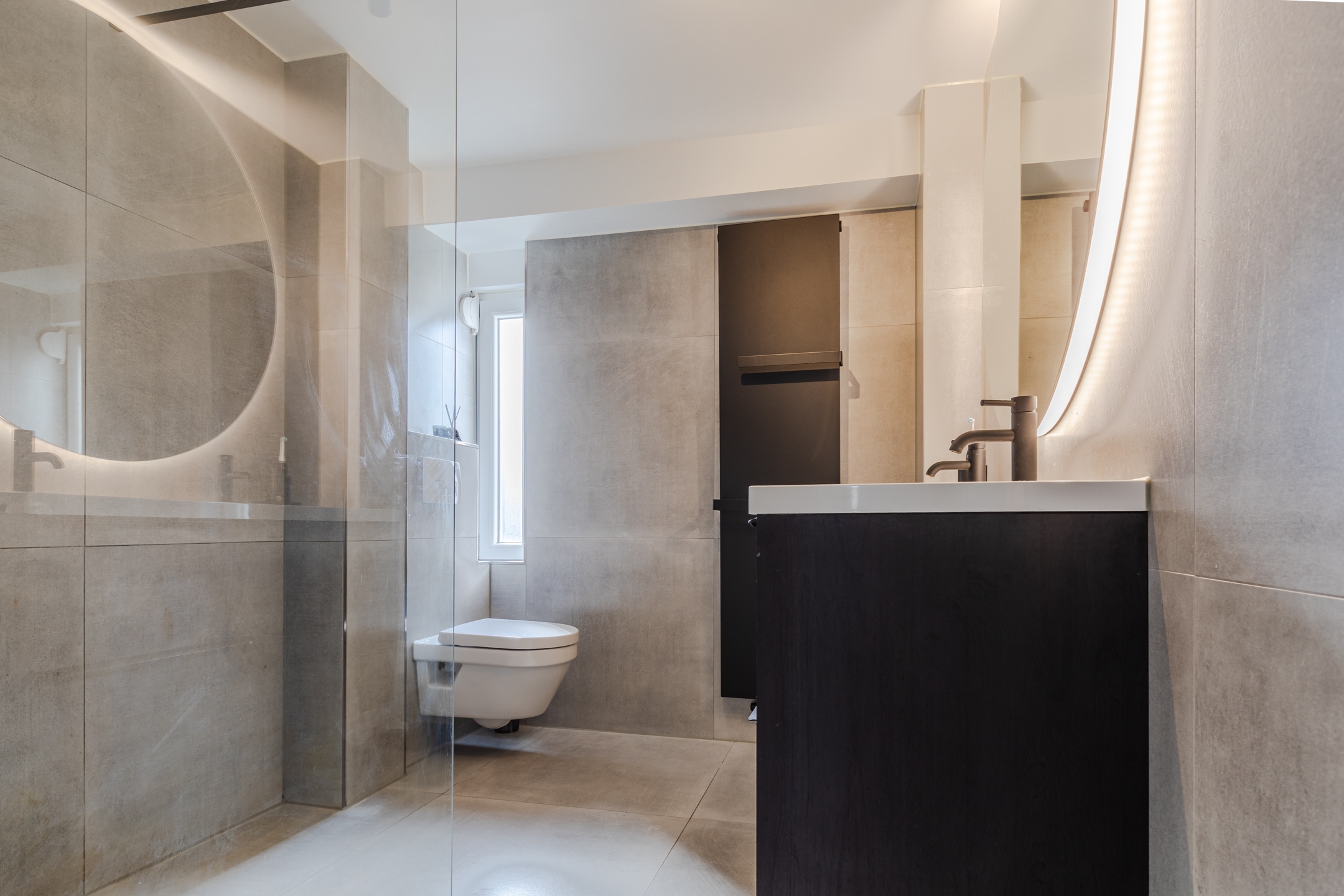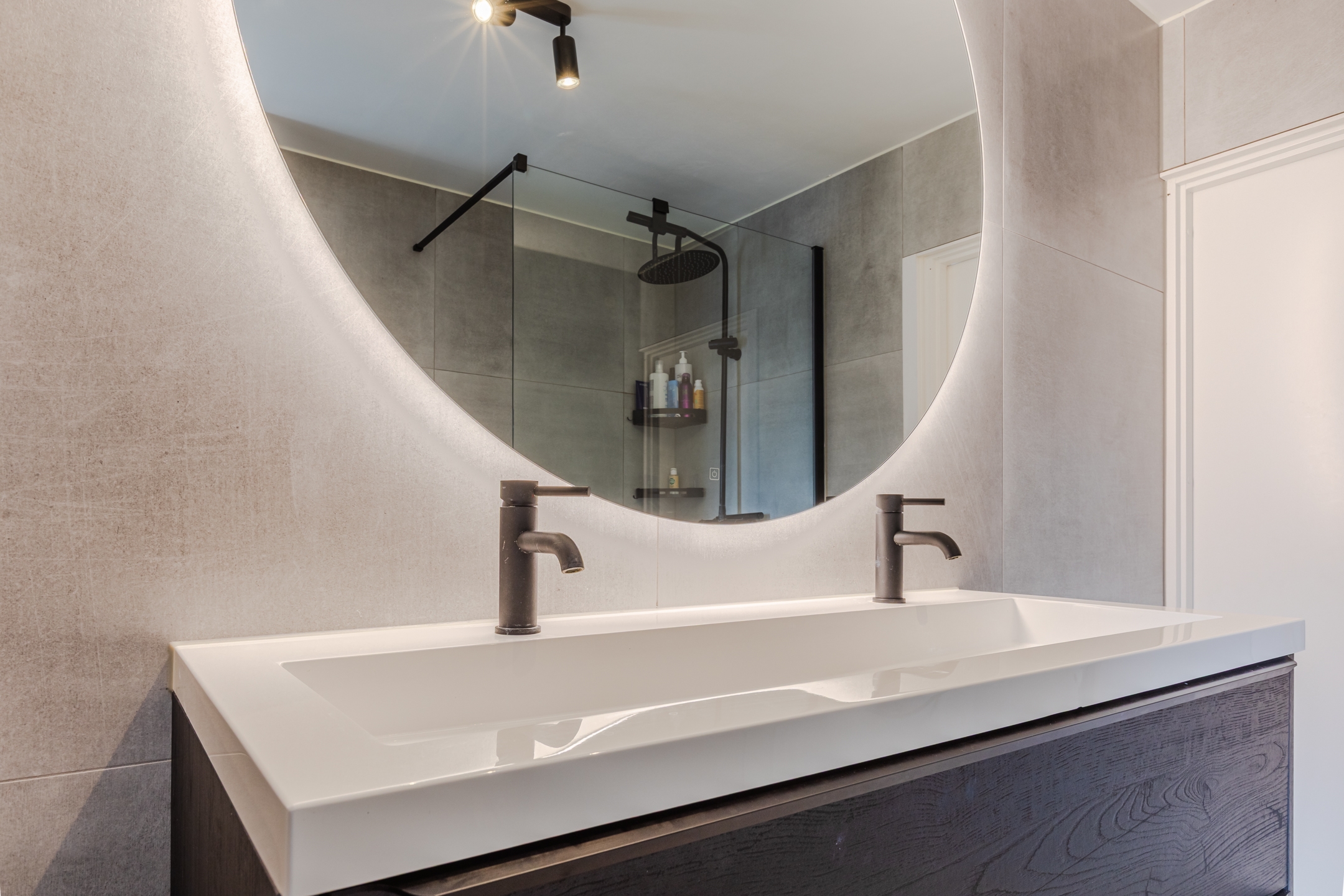 De badkamer, volledig vernieuwd in 2022, is luxe en stijlvol met een inloopdouche, hangend toilet en dubbele wastafel met meubel.