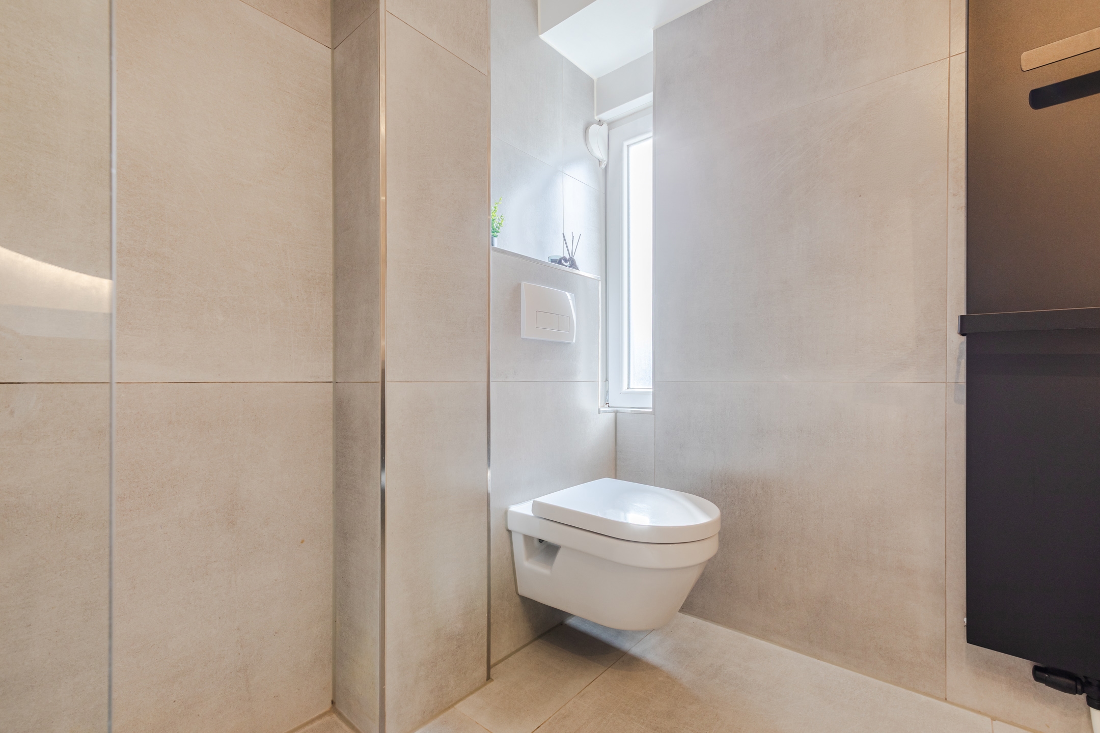 De toiletruimte is modern en strak afgewerkt.