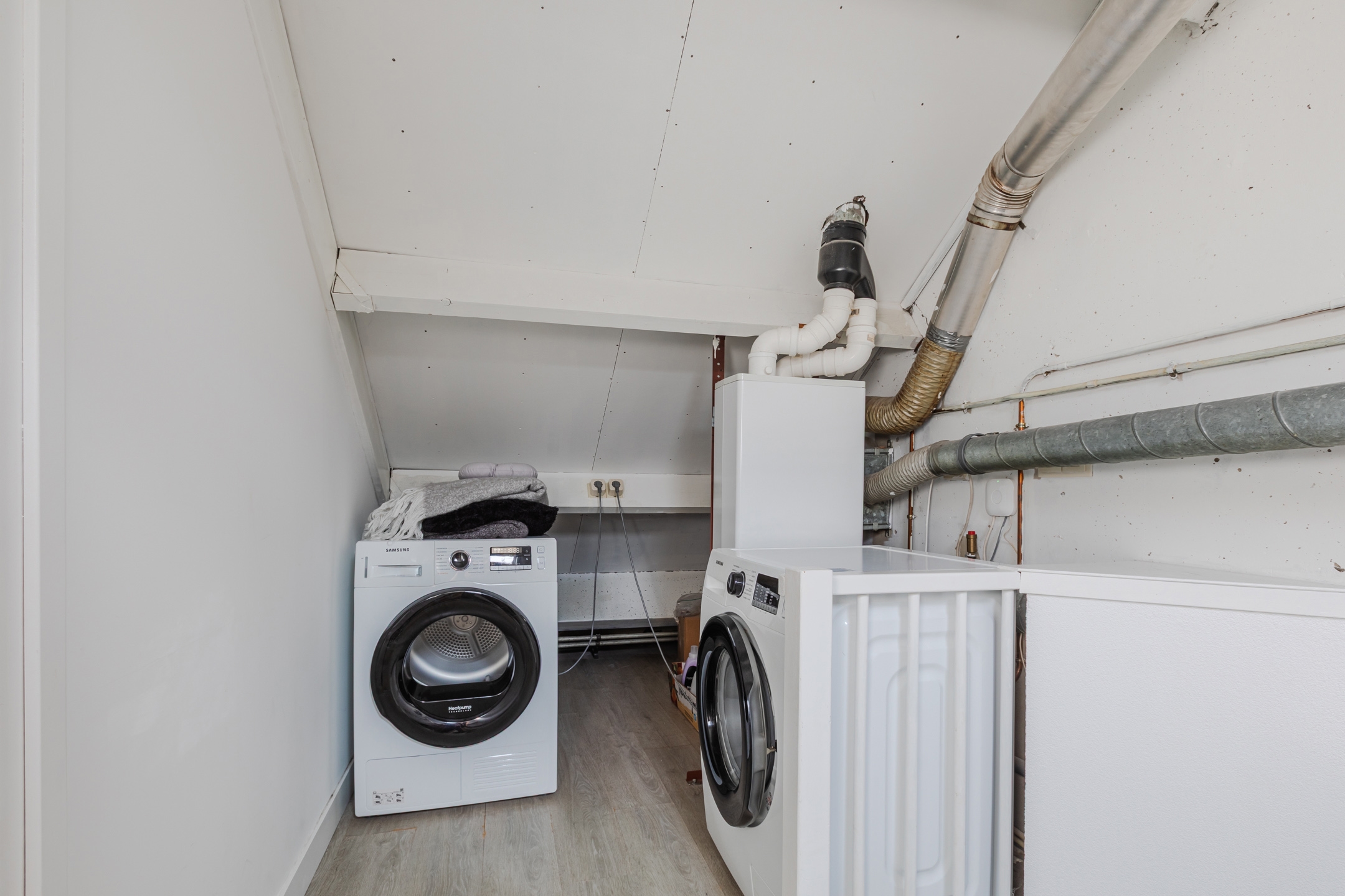 De overloop biedt ruimte voor de wasmachine, de cv-ketel en extra opbergruimte achter de knieschotten.