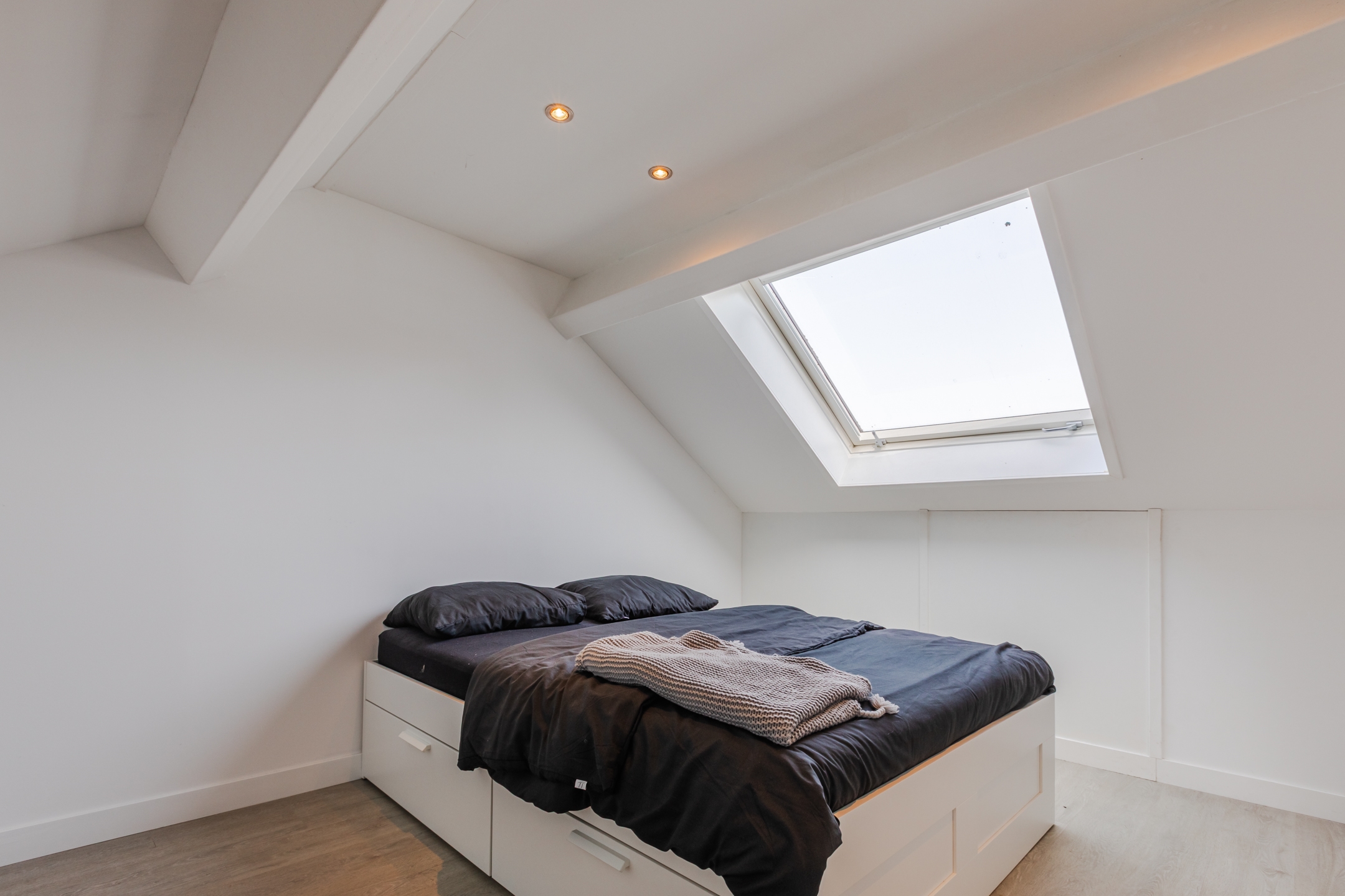 Vanuit de overloop kom je bij de vierde slaapkamer met laminaatvloer en inbouwspots, met de mogelijkheid tot een dakkapel