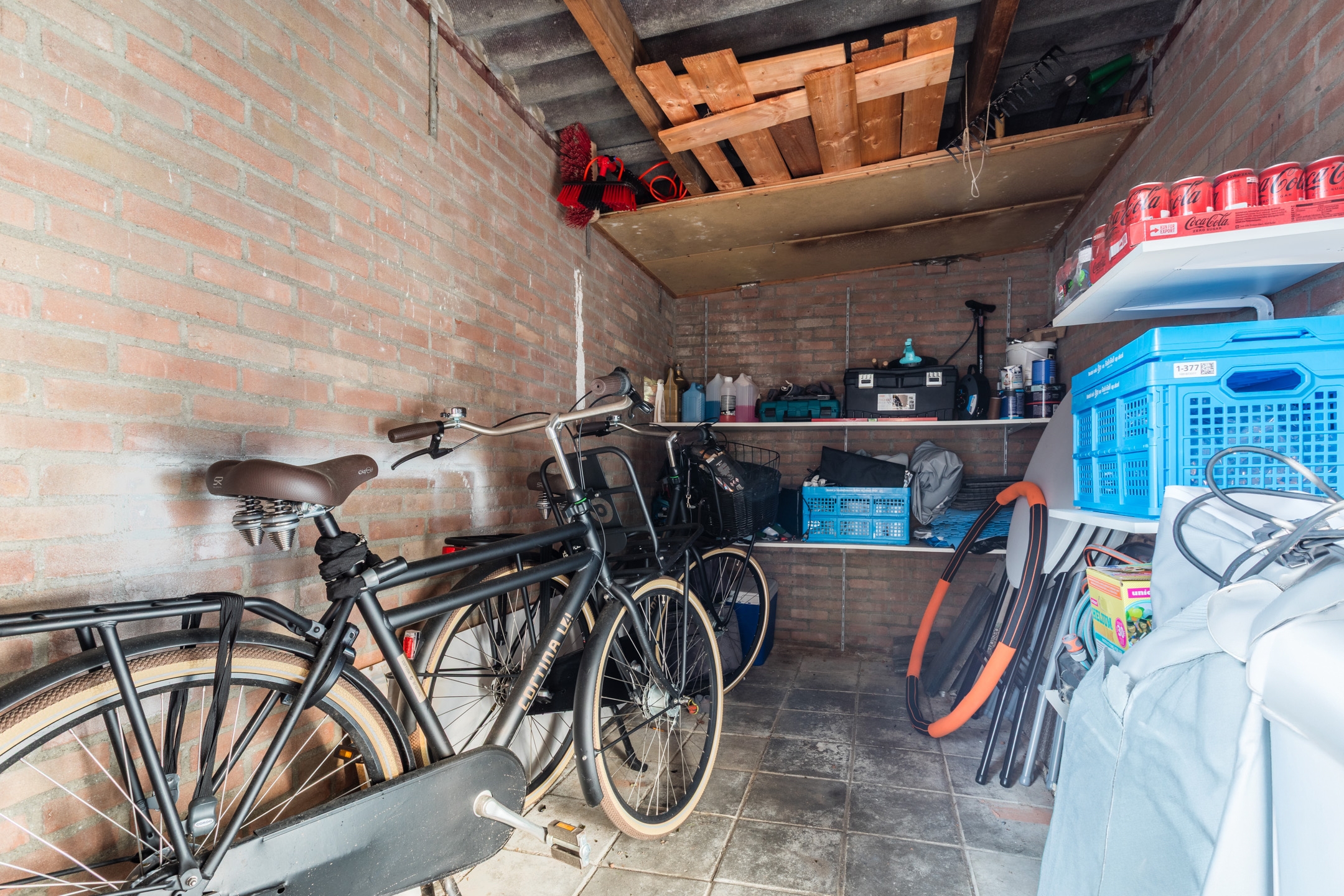 De onderhoudsvriendelijke tuin met grasveldje voor de kinderen heeft ook een ruime vrijstaande stenen berging met een eigen achterom.