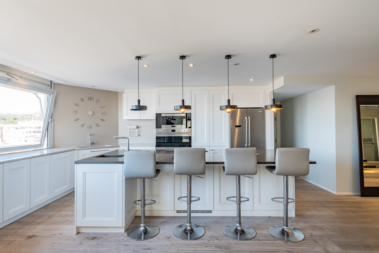 Verder is het uitgerust met een 'Bora' ingebouwde afzuigkap, een quooker voor direct kokend water, een elektrische wok, een bakplaat en een wijnkoeler.