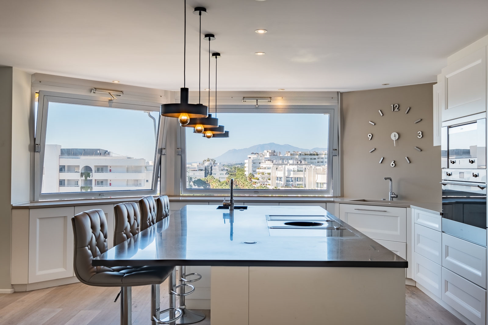 Er is een groot kookeiland van 3 meter lang met een bar om te dineren met vrienden en familie.