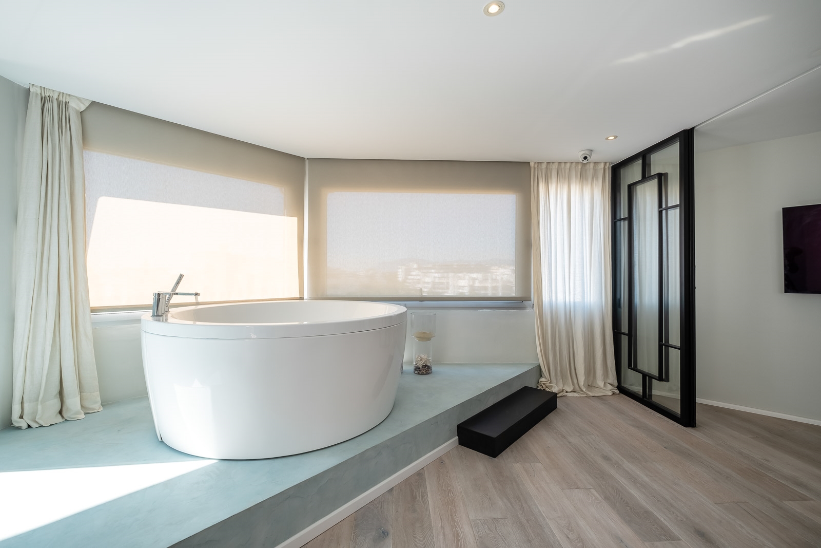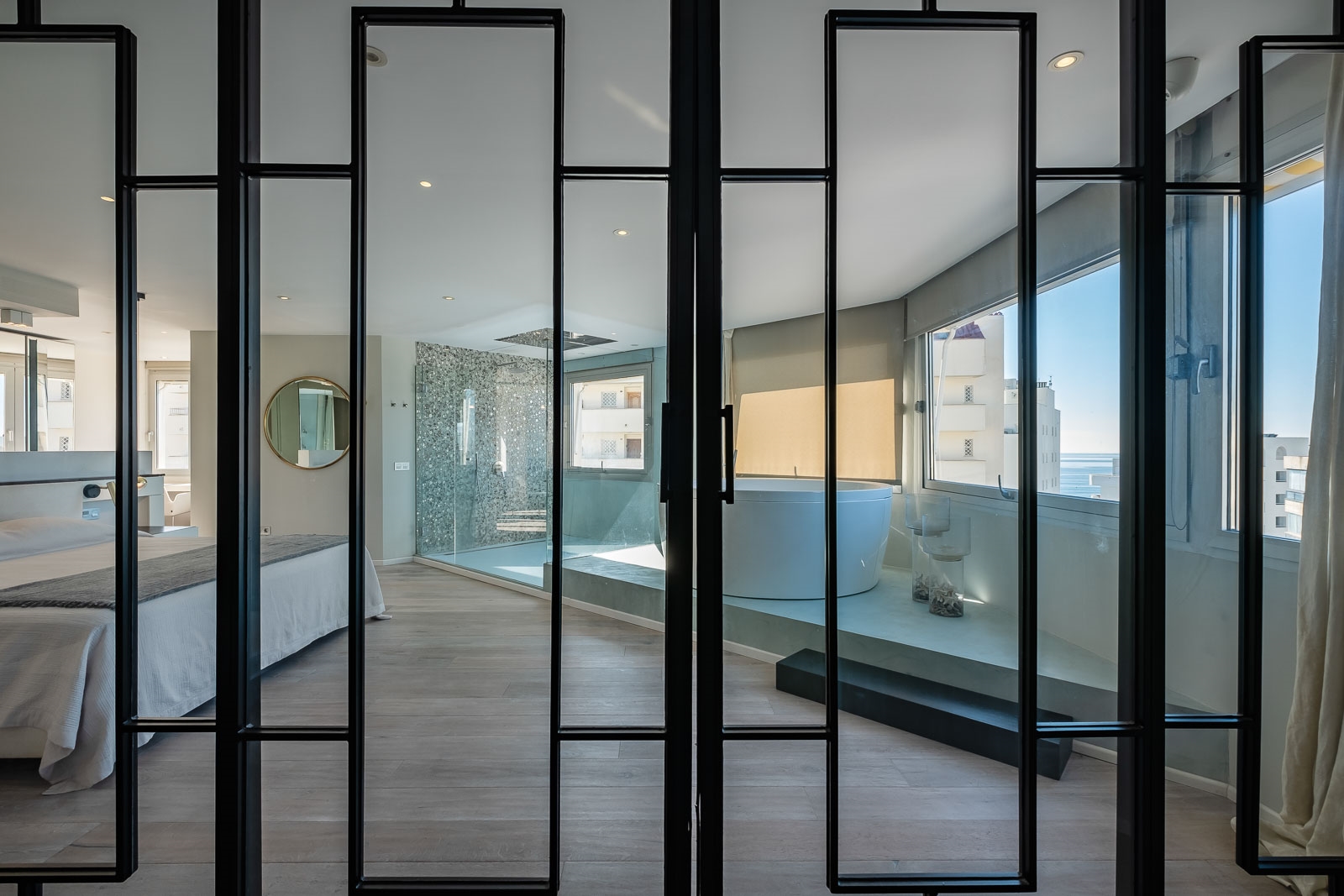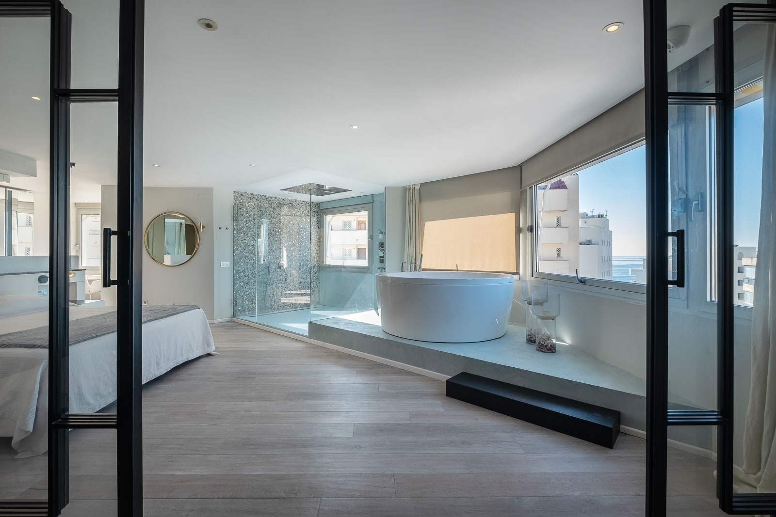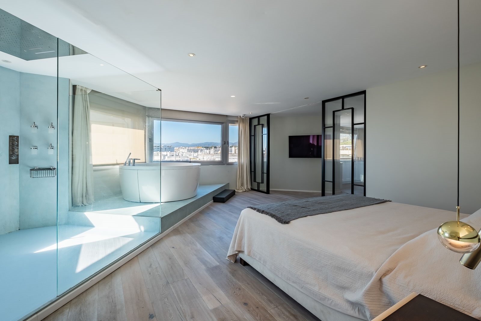 Op de benedenverdieping is ook de luxe en zeer ruime master suite gesitueerd met een zeer ruime regendouche en een groot vrijstaand bad.