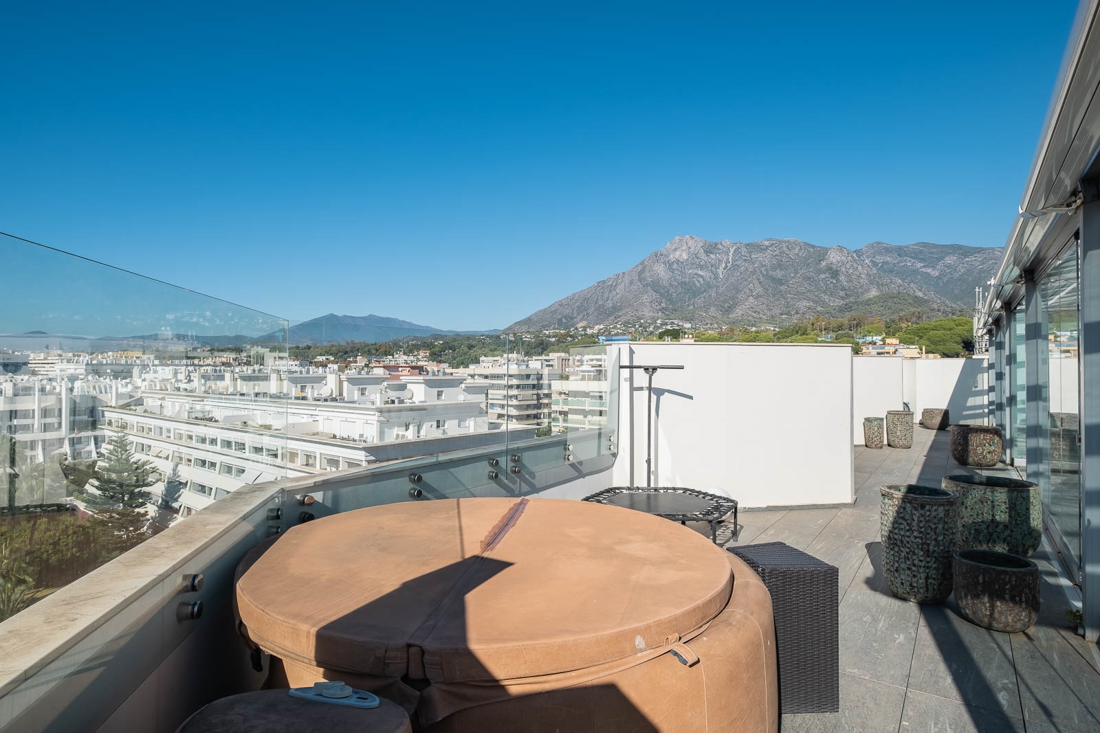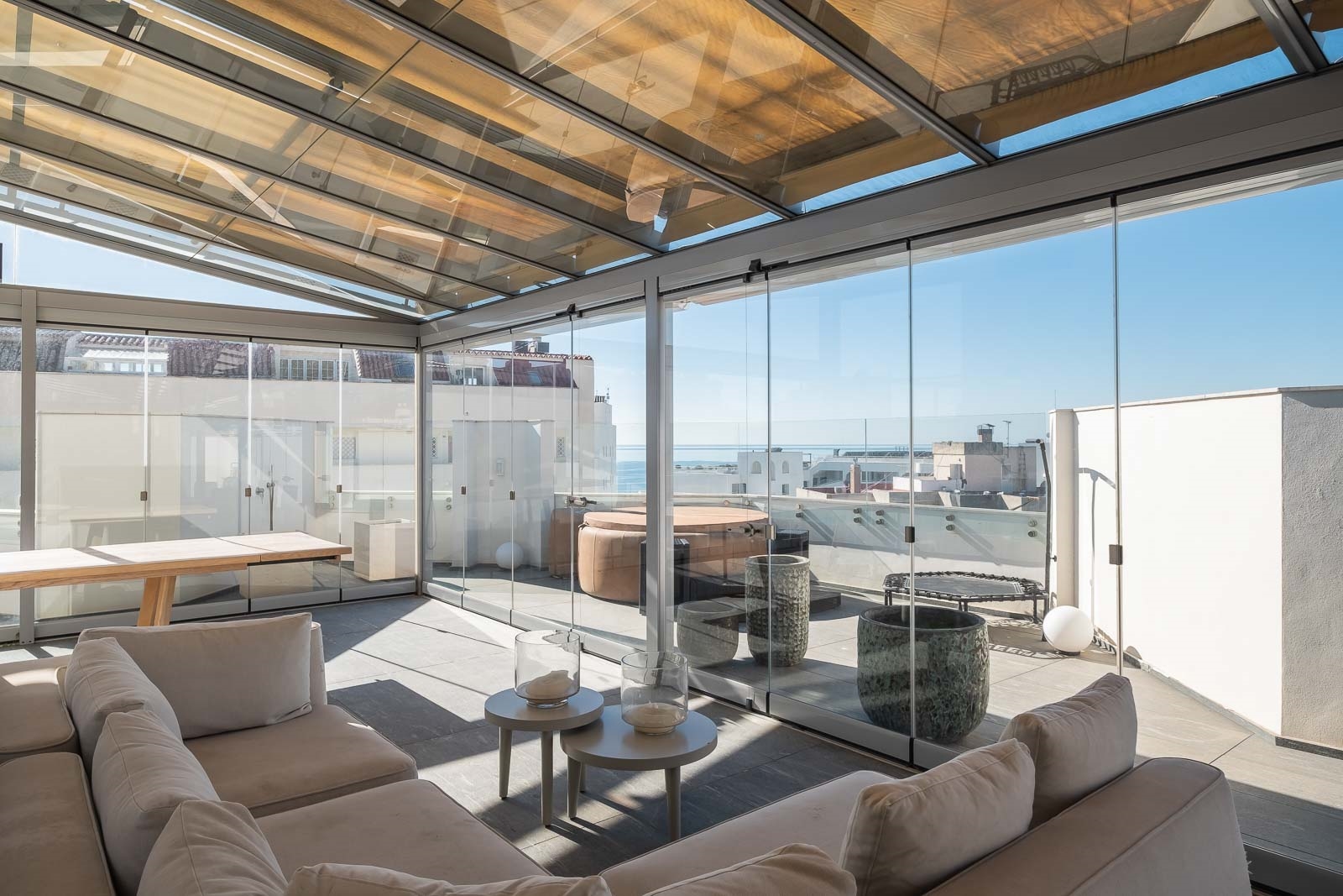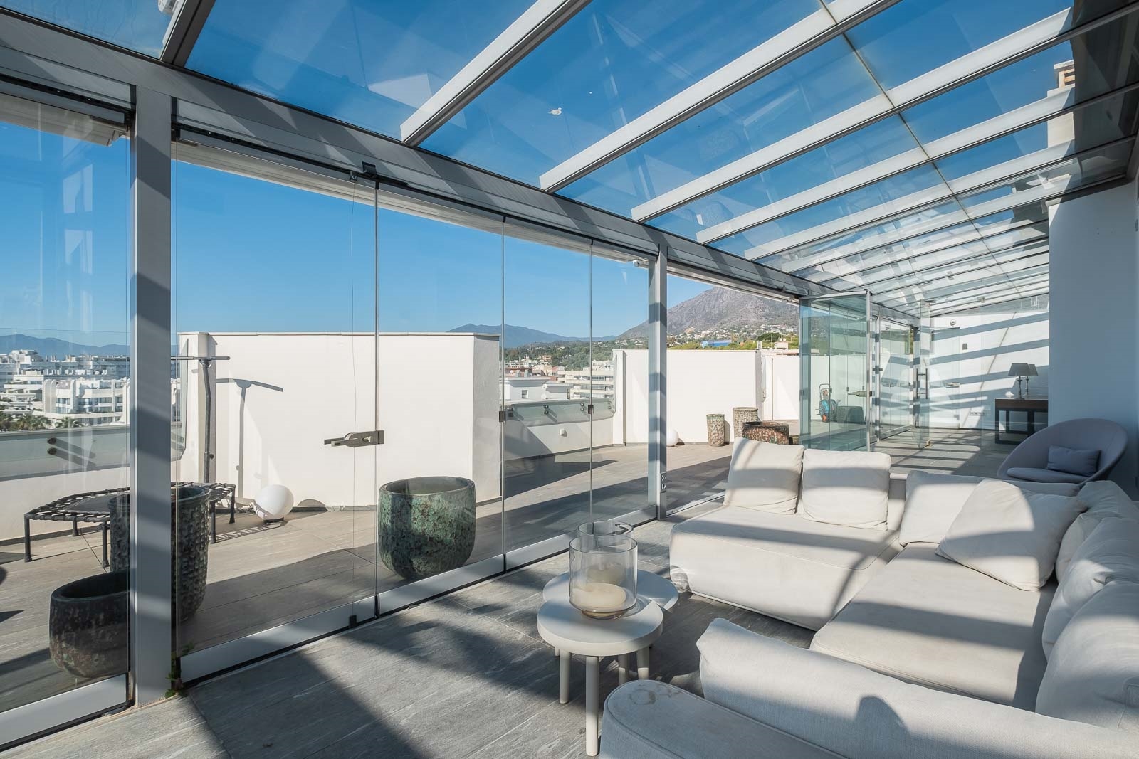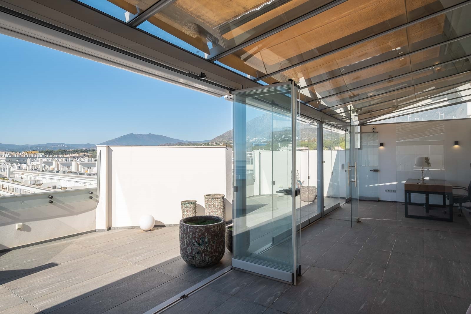 Het solarium heeft verschillende overdekte en niet overdekte gedeelten, evenals een afgesloten keuken, een kantoor en een badkamer, waardoor het de perfecte omgeving is om heerlijke avonden door te brengen en te genieten van het uitzicht op de Middellandse Zee en de berg La Concha.