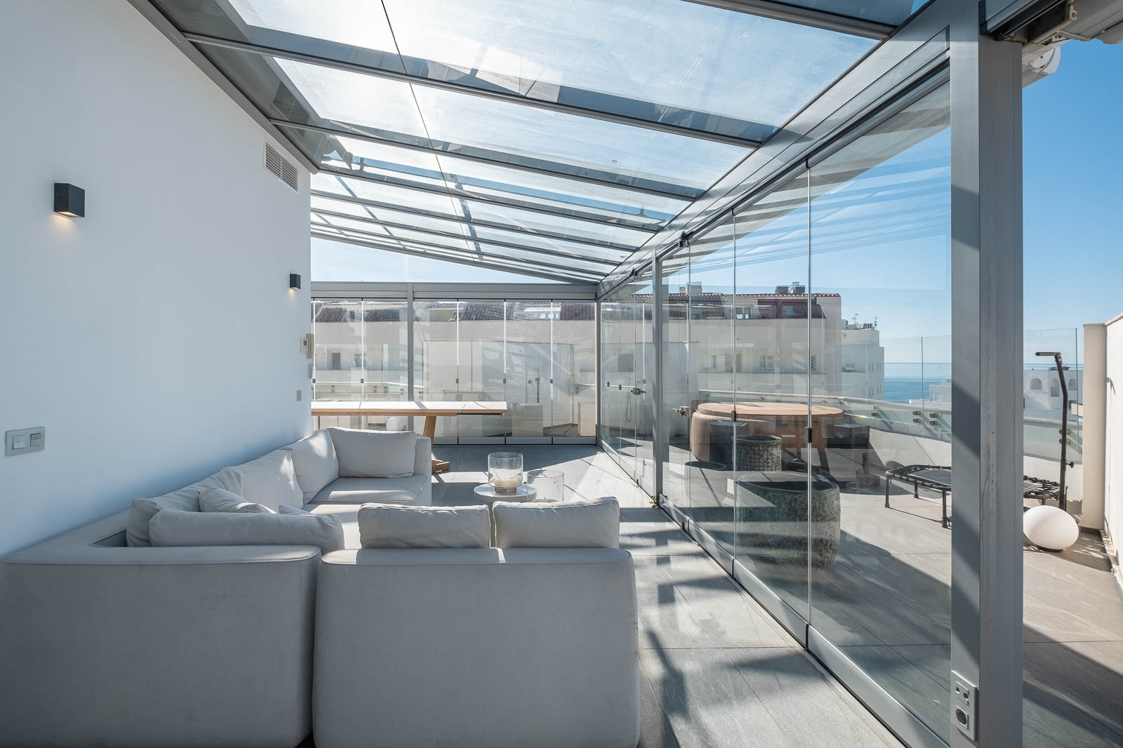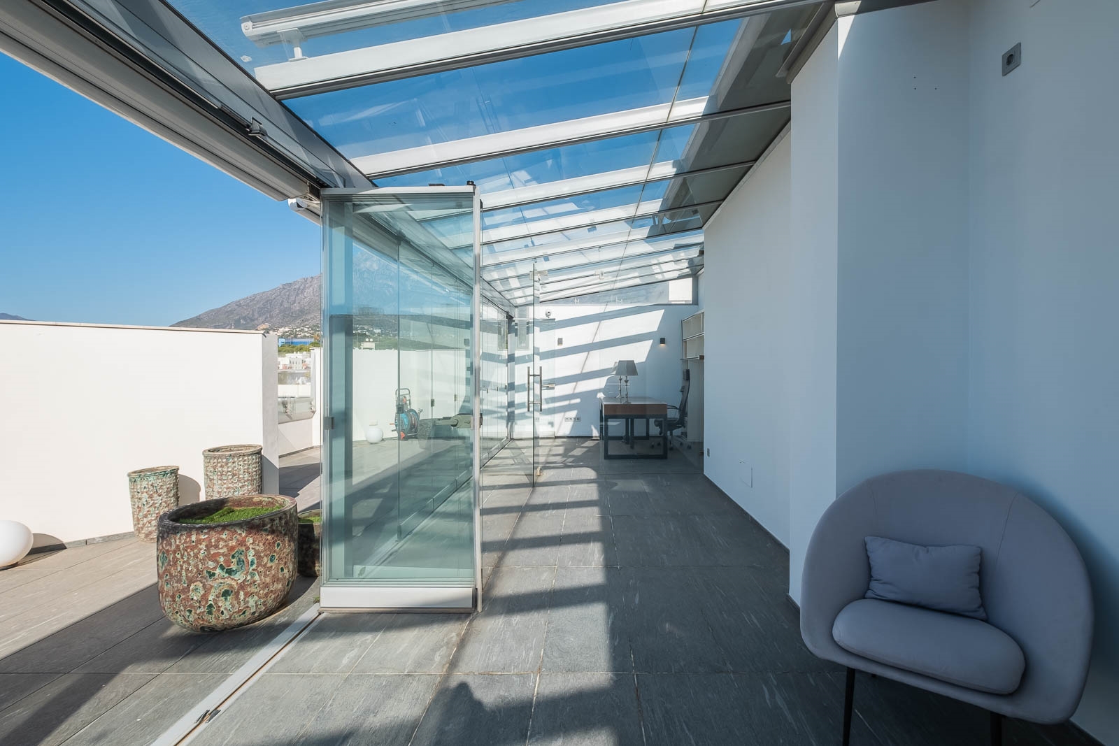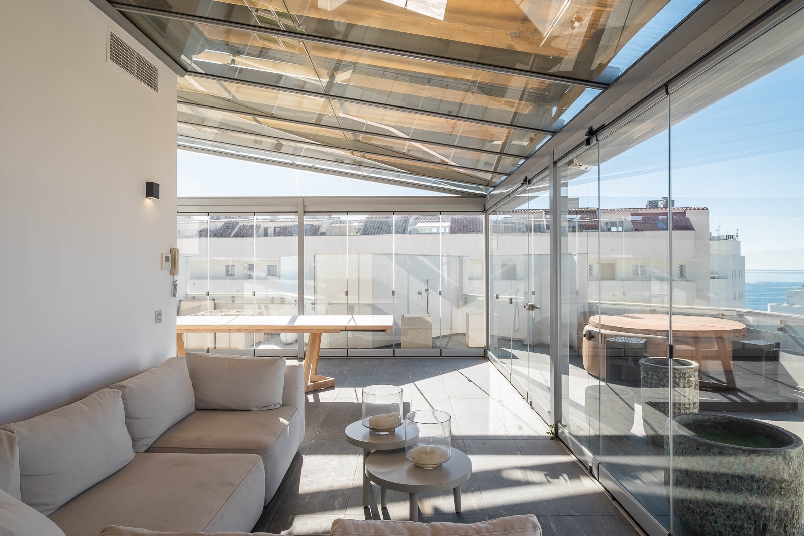 Het solarium heeft verschillende overdekte en niet overdekte gedeelten, evenals een afgesloten keuken, een kantoor en een badkamer, waardoor het de perfecte omgeving is om heerlijke avonden door te brengen en te genieten van het uitzicht op de Middellandse Zee en de berg La Concha.