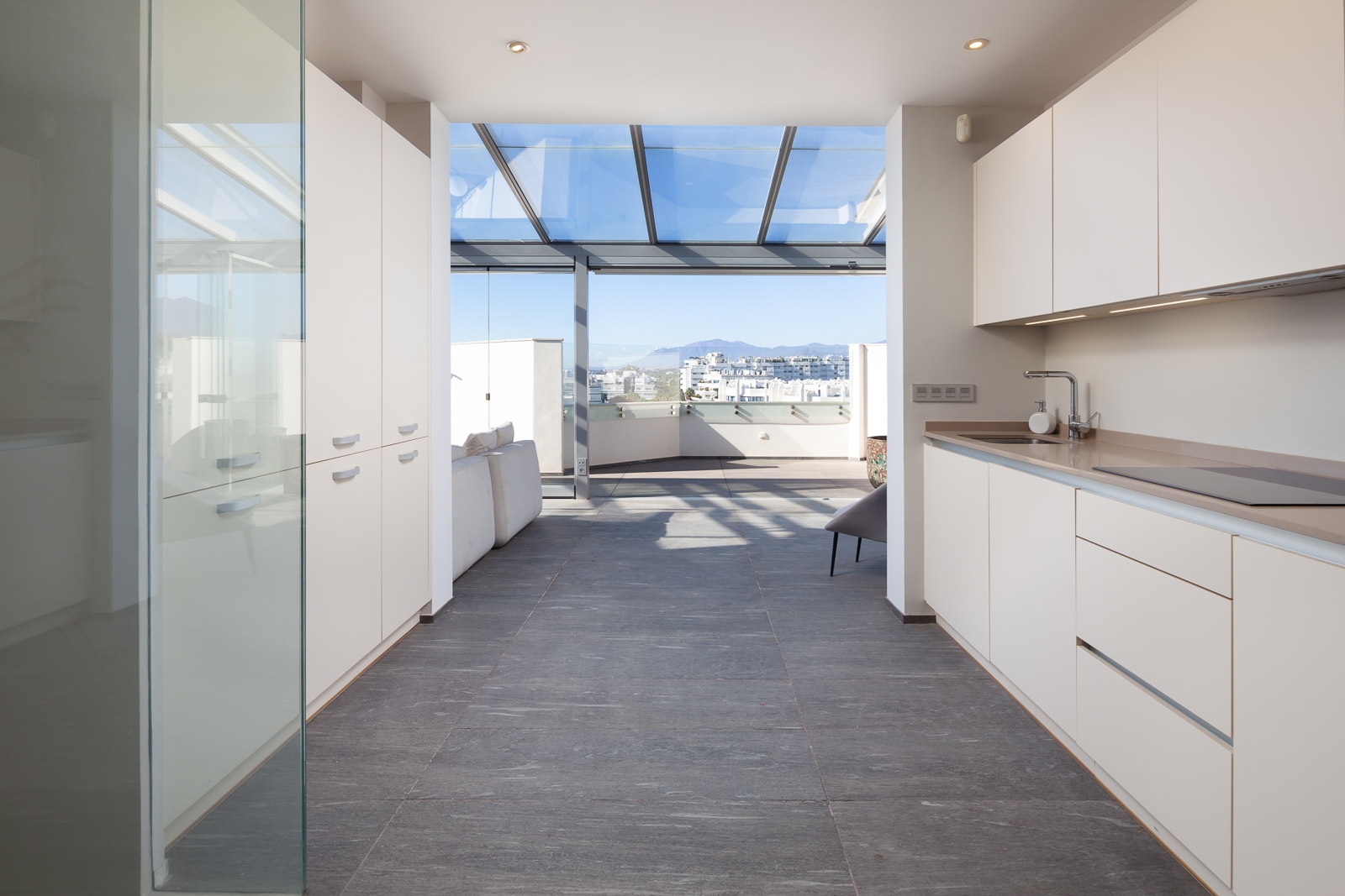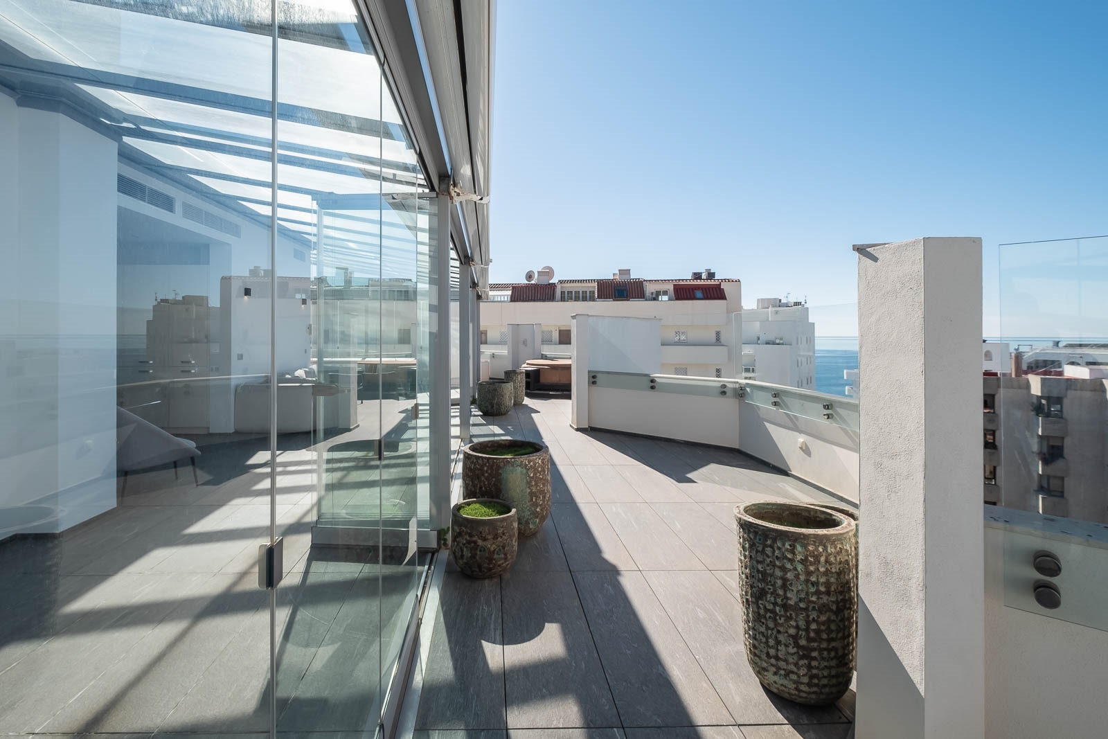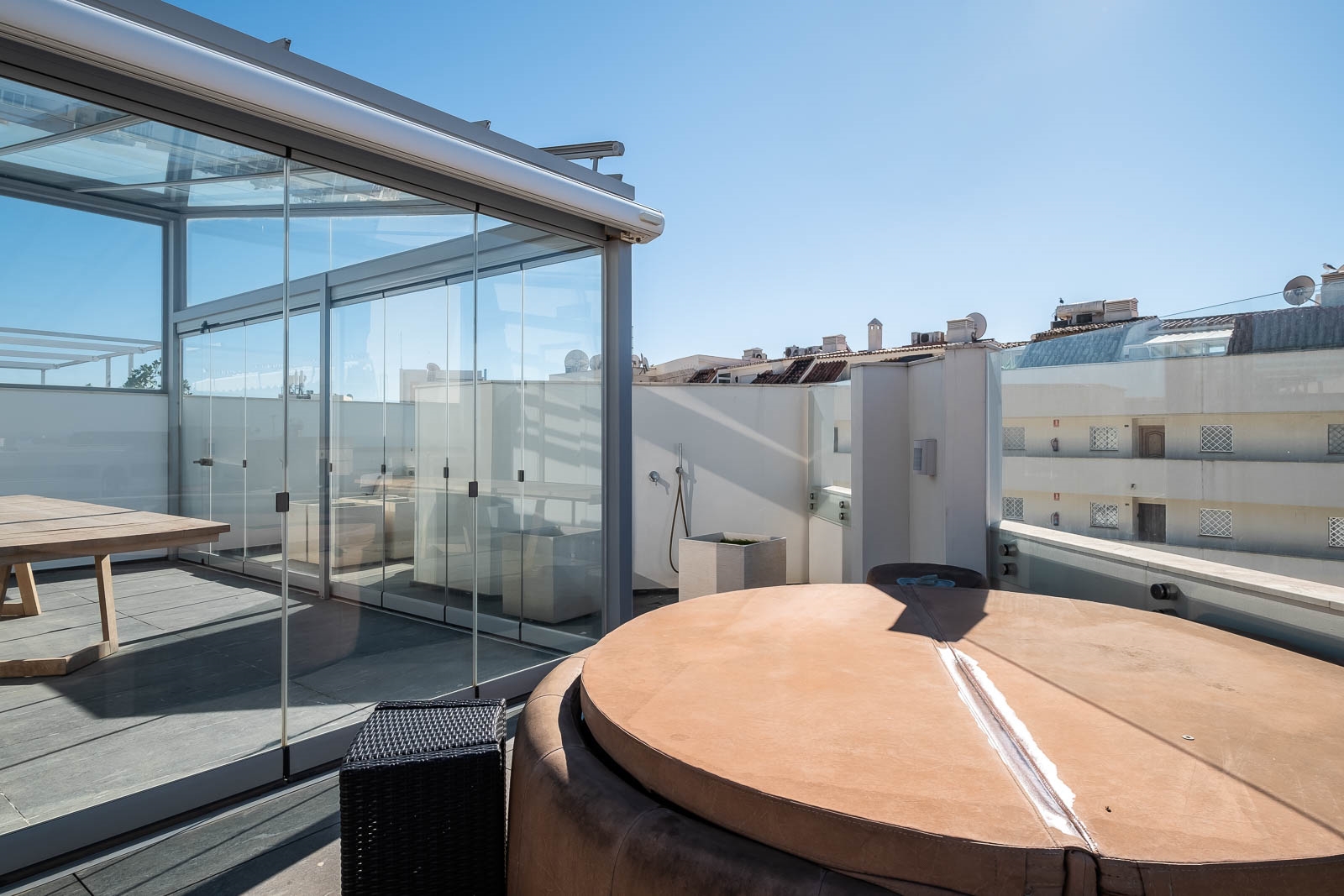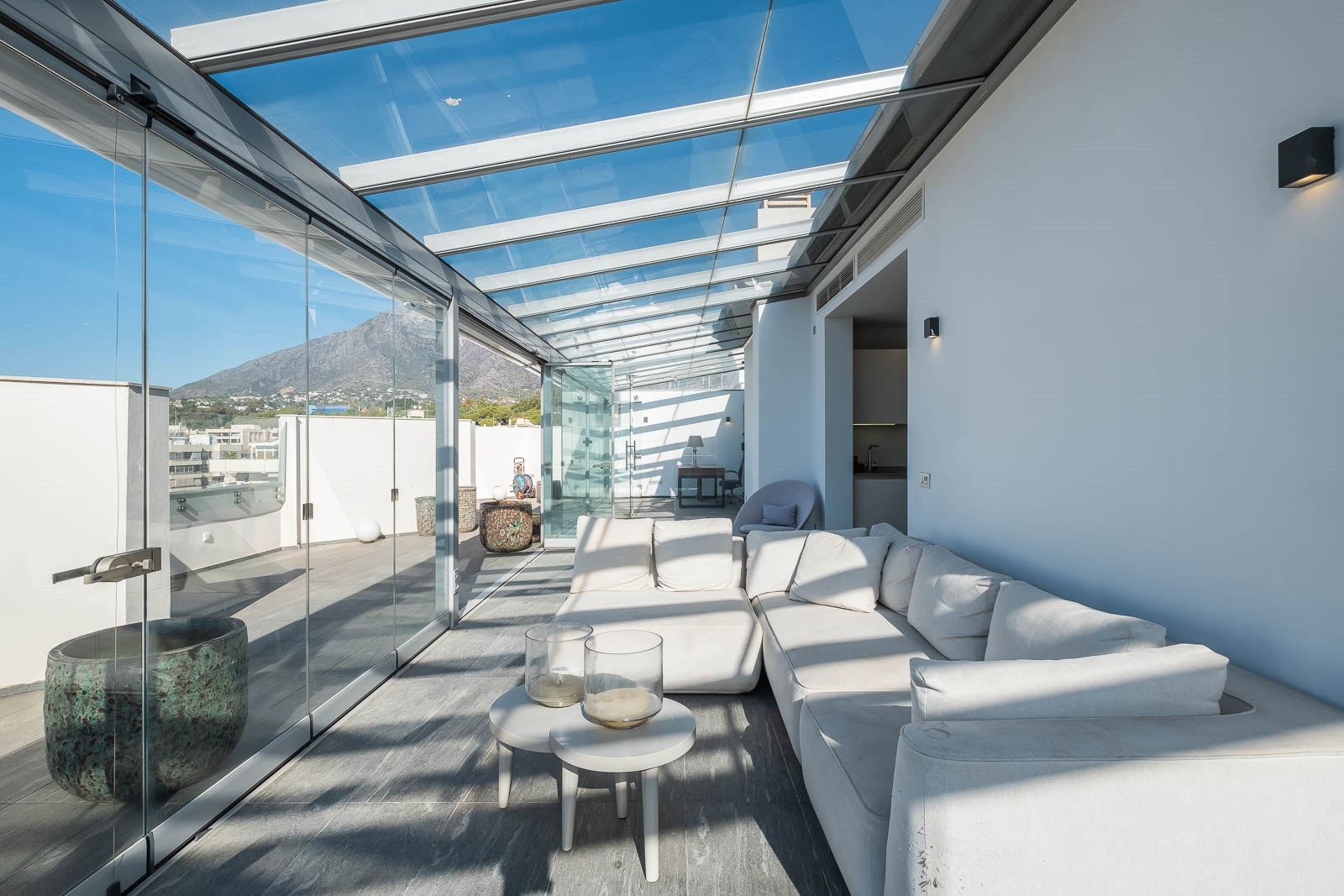 Het solarium heeft verschillende overdekte en niet overdekte gedeelten, evenals een afgesloten keuken, een kantoor en een badkamer, waardoor het de perfecte omgeving is om heerlijke avonden door te brengen en te genieten van het uitzicht op de Middellandse Zee en de berg La Concha.