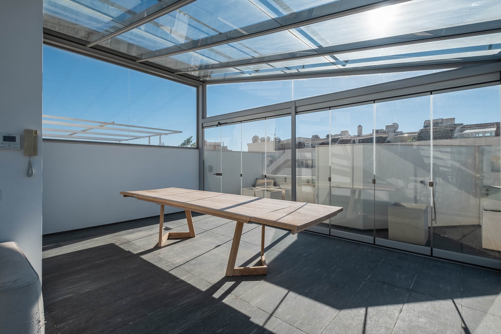 Op de eerste verdieping bevindt zich het glazen terras van Lumon dat volledig kan worden geopend voor een totale retraite voor ontspanning en/of vrije tijd, met een groot solarium dat net zo ruim is als de hoofdverdieping, perfect voor het organiseren van bijeenkomsten met familie of vrienden.