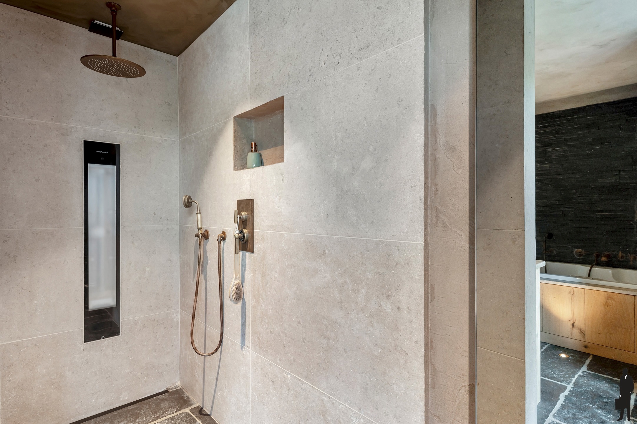 Een tweede badkamer, eveneens hoogwaardig afgewerkt, bevindt zich in de nachthal en doet dienst voor de overige slaapvertrekken.