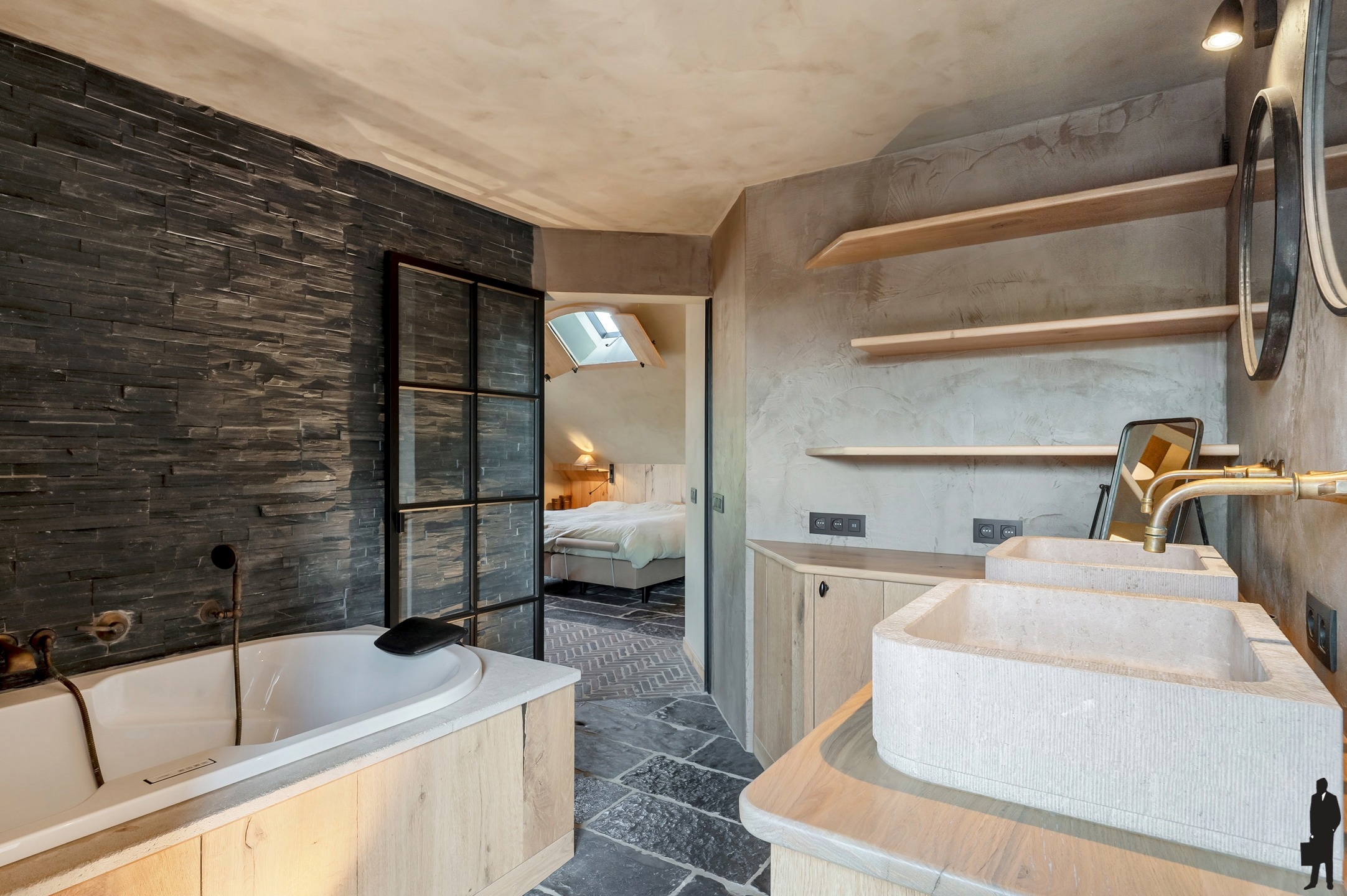 Op het eerste verdiep bevindt zich een ruime hoofdslaapkamer met een uiterst kwaliteits- en sfeervol ingerichte ensuite badkamer.