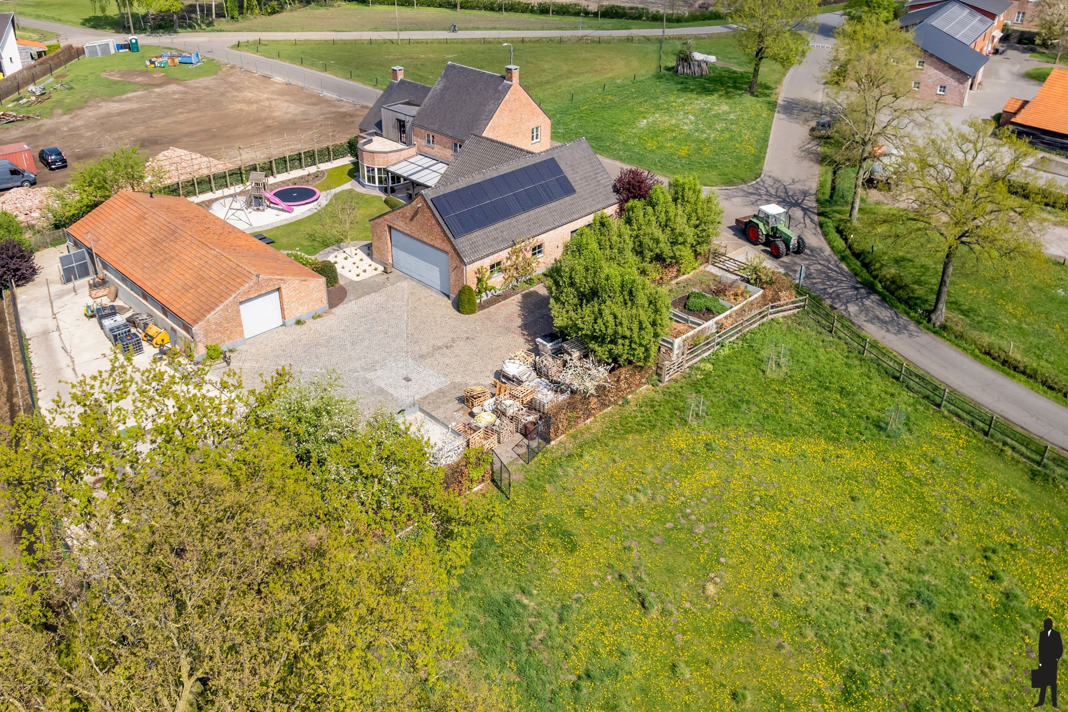 Het eigendom beschikt over een groot garagegebouw met twee brede sectionale poorten.