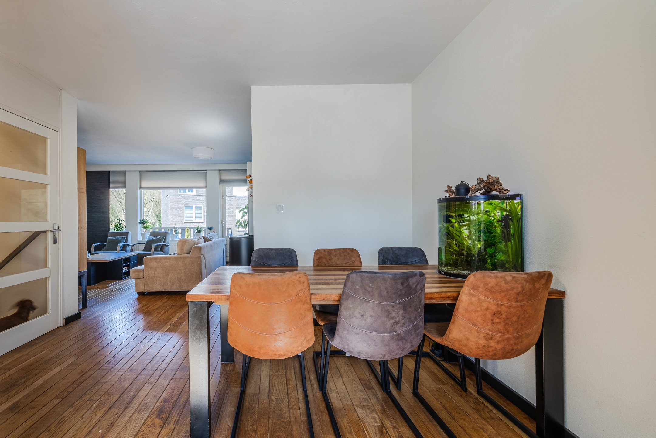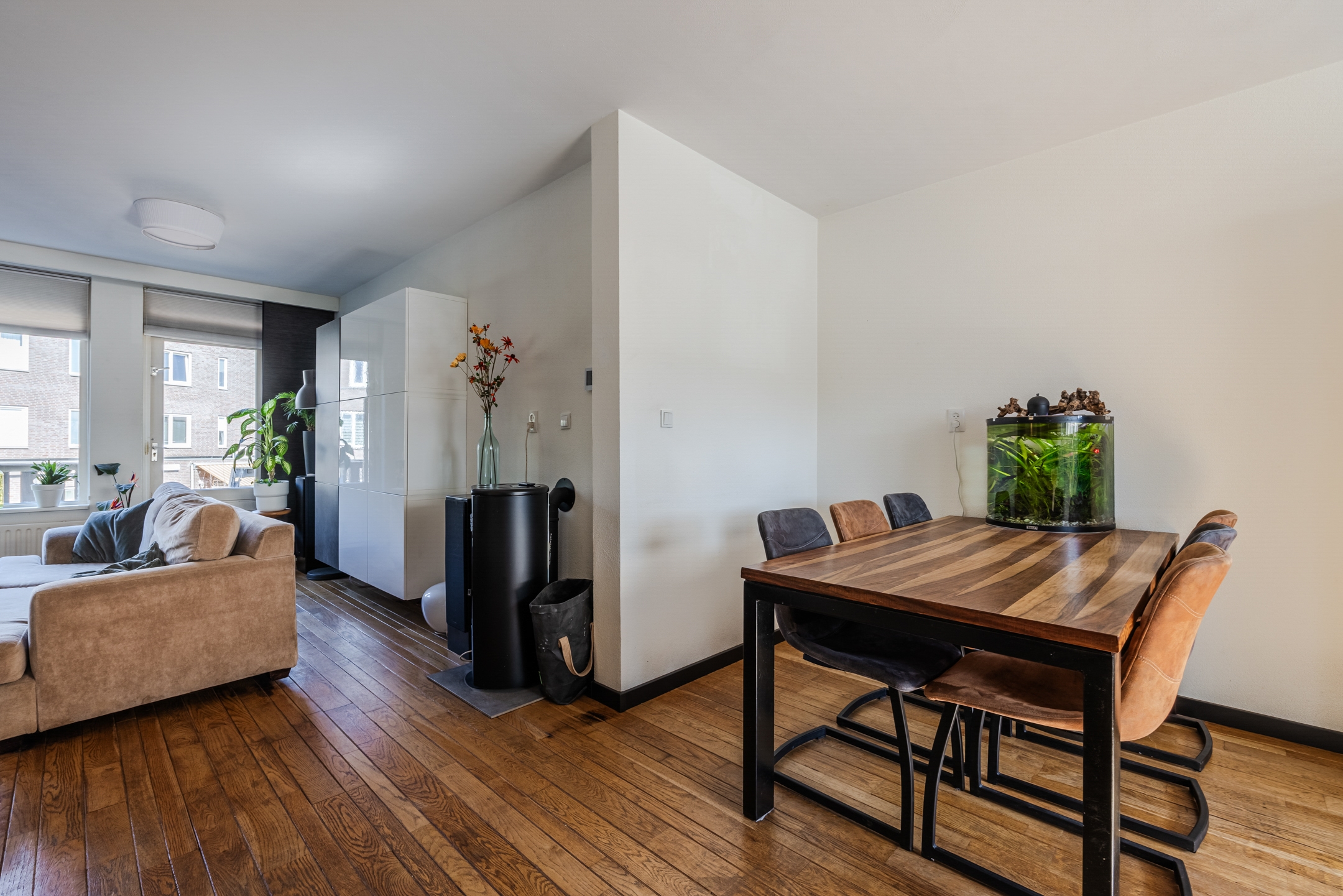Op de eerste verdieping wacht een grote, lichte woonkamer op je, perfect voor gezellige avonden met vrienden of om lekker onderuit te zakken na een drukke dag. Er is plaats voor een flinke hoekbank én een grote eettafel.