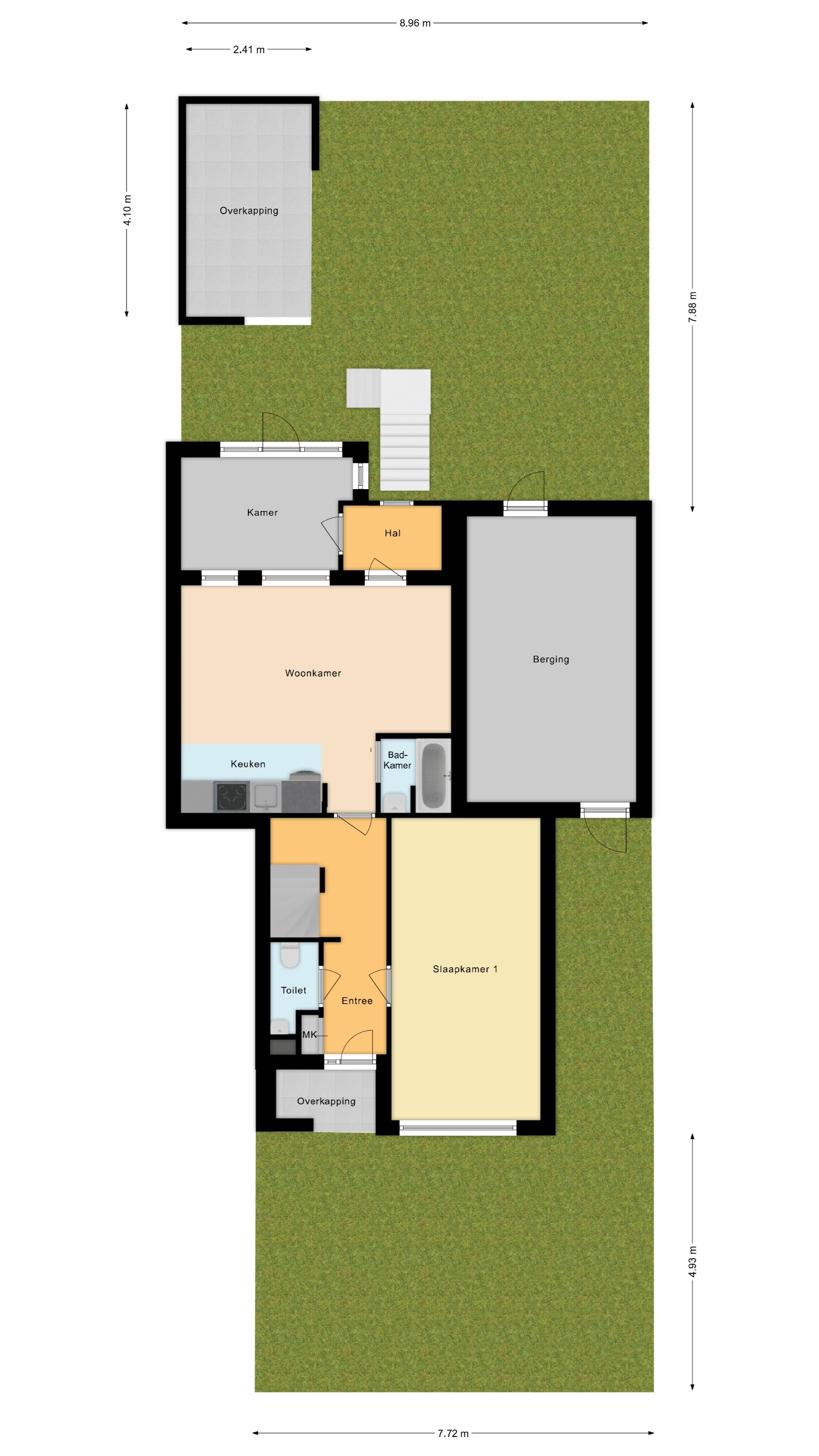 Op de begane grond vind je een volledig zelfstandig appartement met eigen woonkamer, moderne keuken, ruime slaapkamer én badkamer.