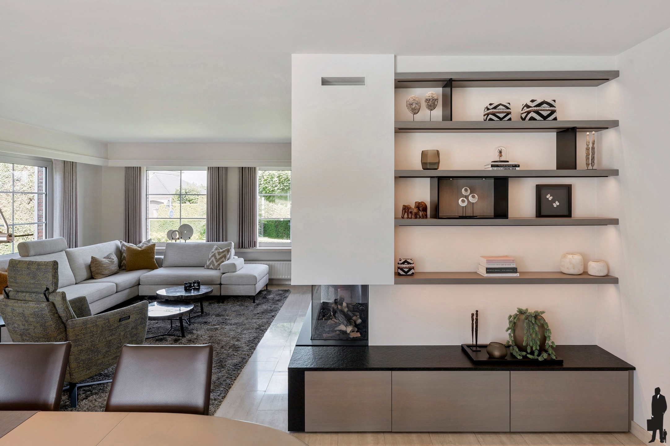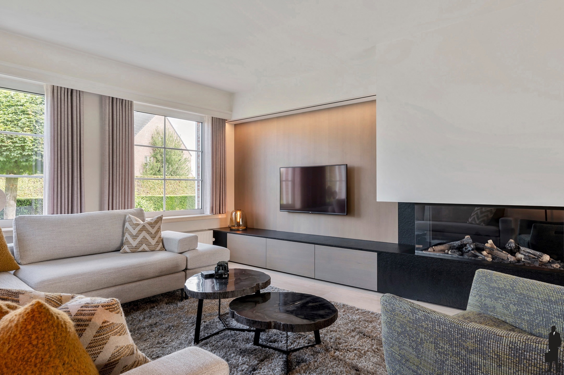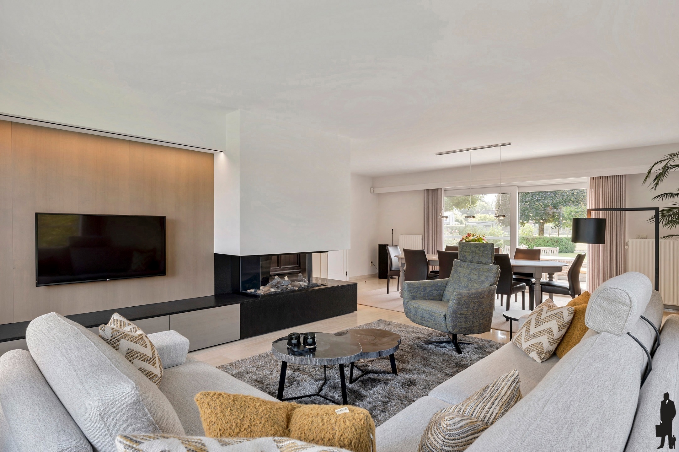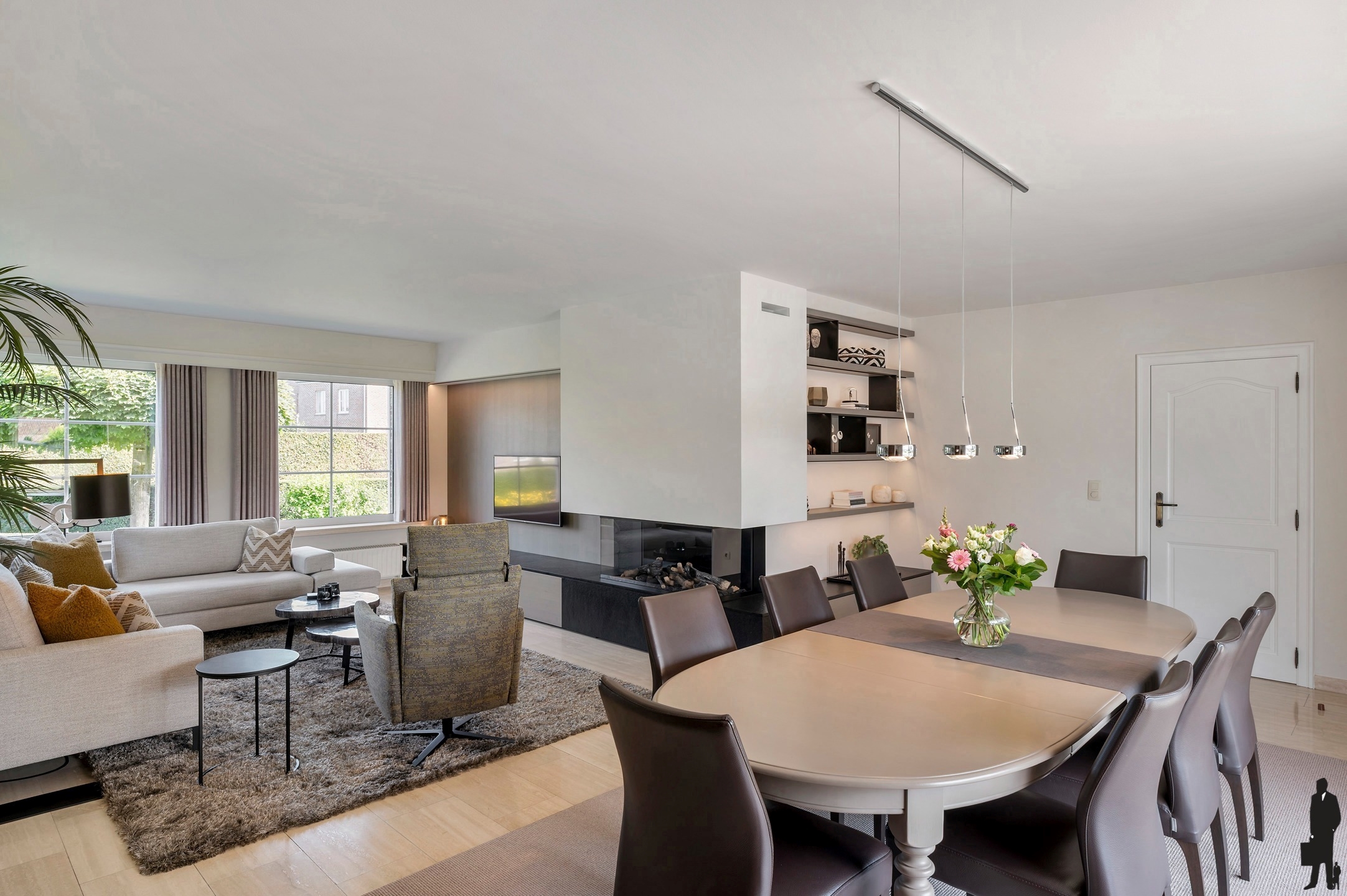 U wordt verwelkomd in een stijlvolle inkomhal die toegang biedt tot een ruime, volledig gerenoveerde woonkamer met gashaard.