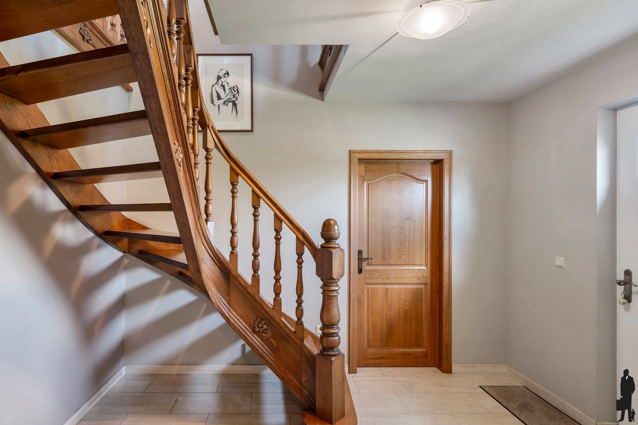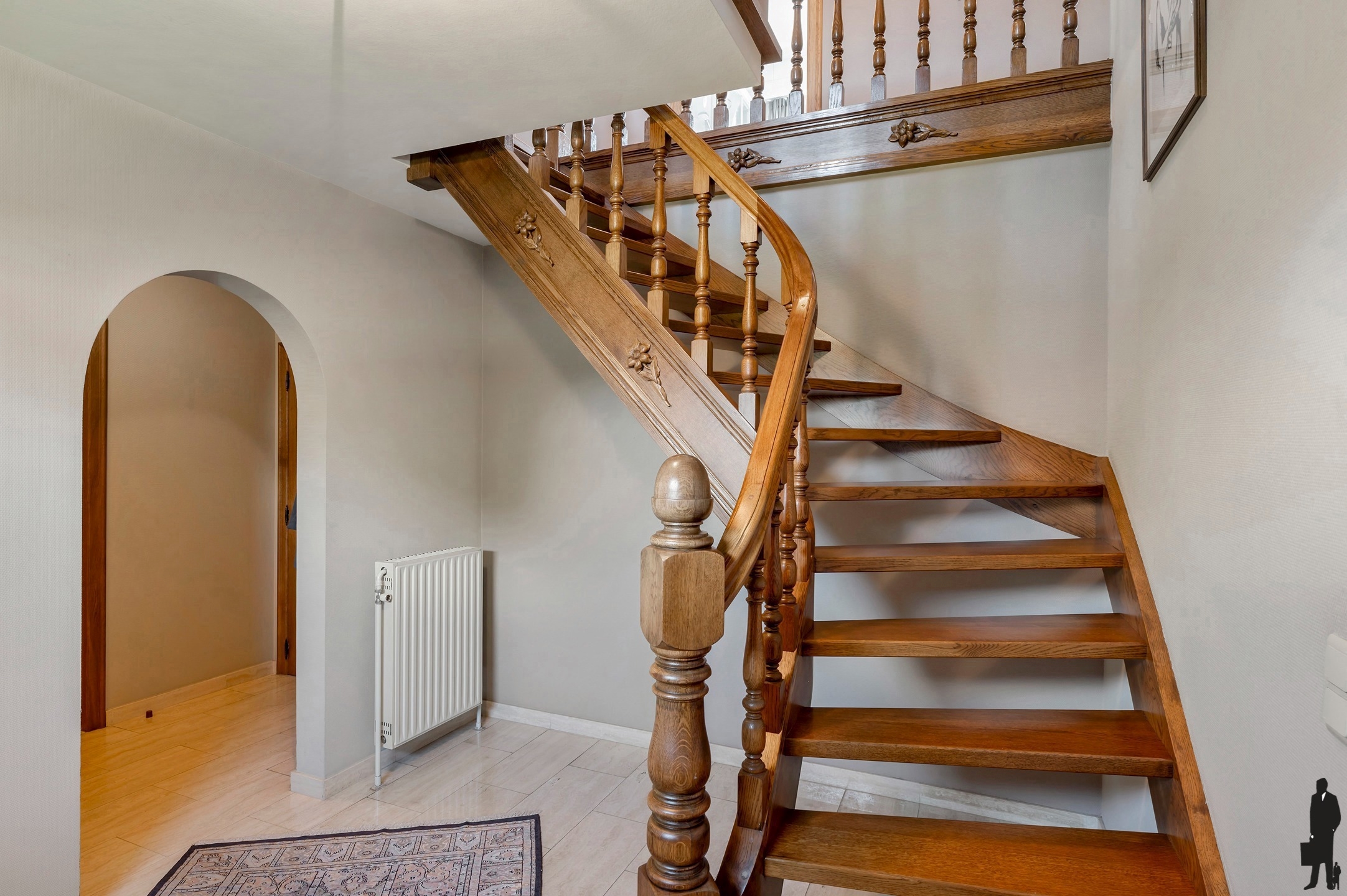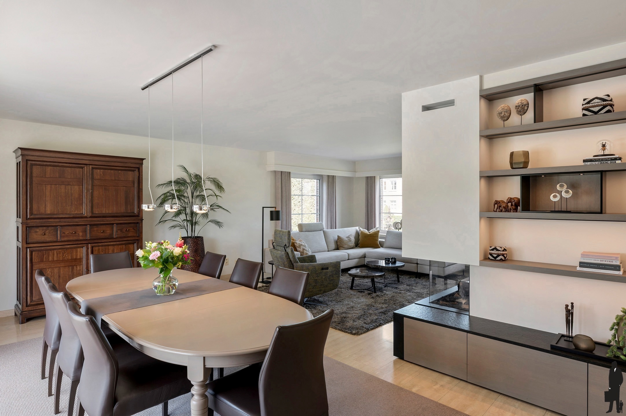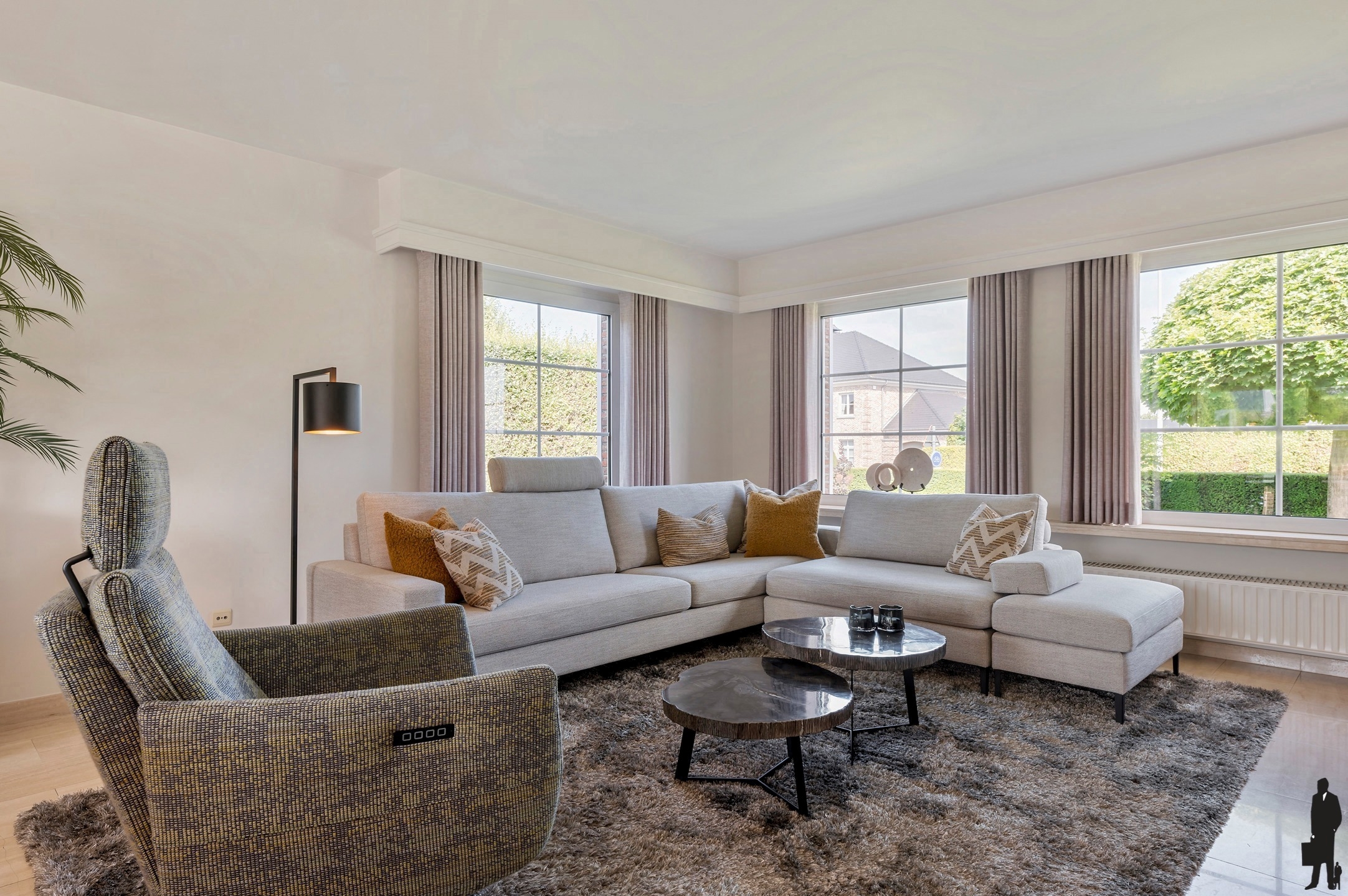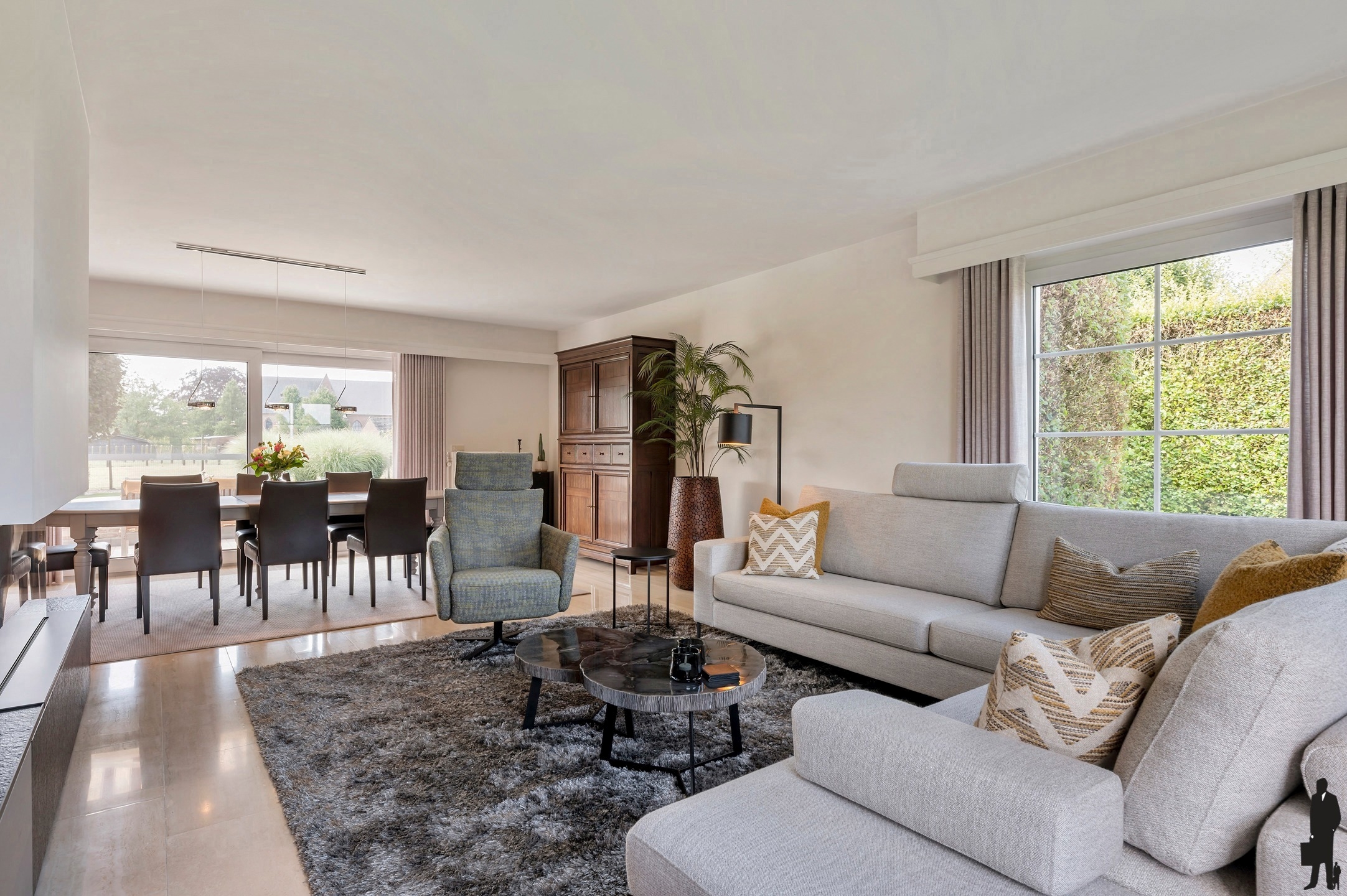 U wordt verwelkomd in een stijlvolle inkomhal die toegang biedt tot een ruime, volledig gerenoveerde woonkamer met gashaard.