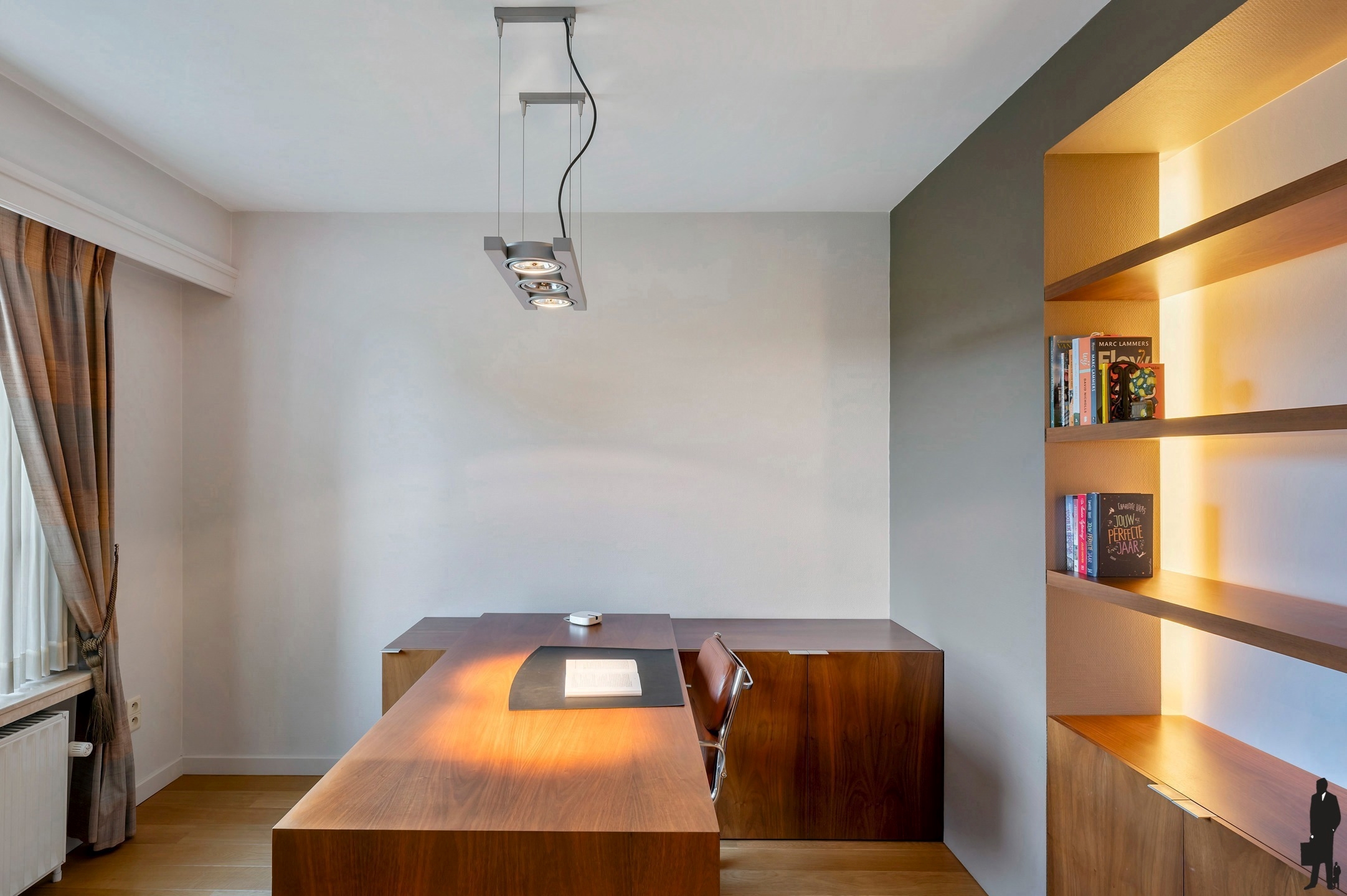 Verder vindt u op deze verdieping een kantoor met maatwerkkasten, een volledig uitgeruste keuken met zicht op de tuin, en een praktische bijkeuken met ruimte voor wasmachine, droger en directe toegang tot het terras. Hier is plaats om de was te drogen.
