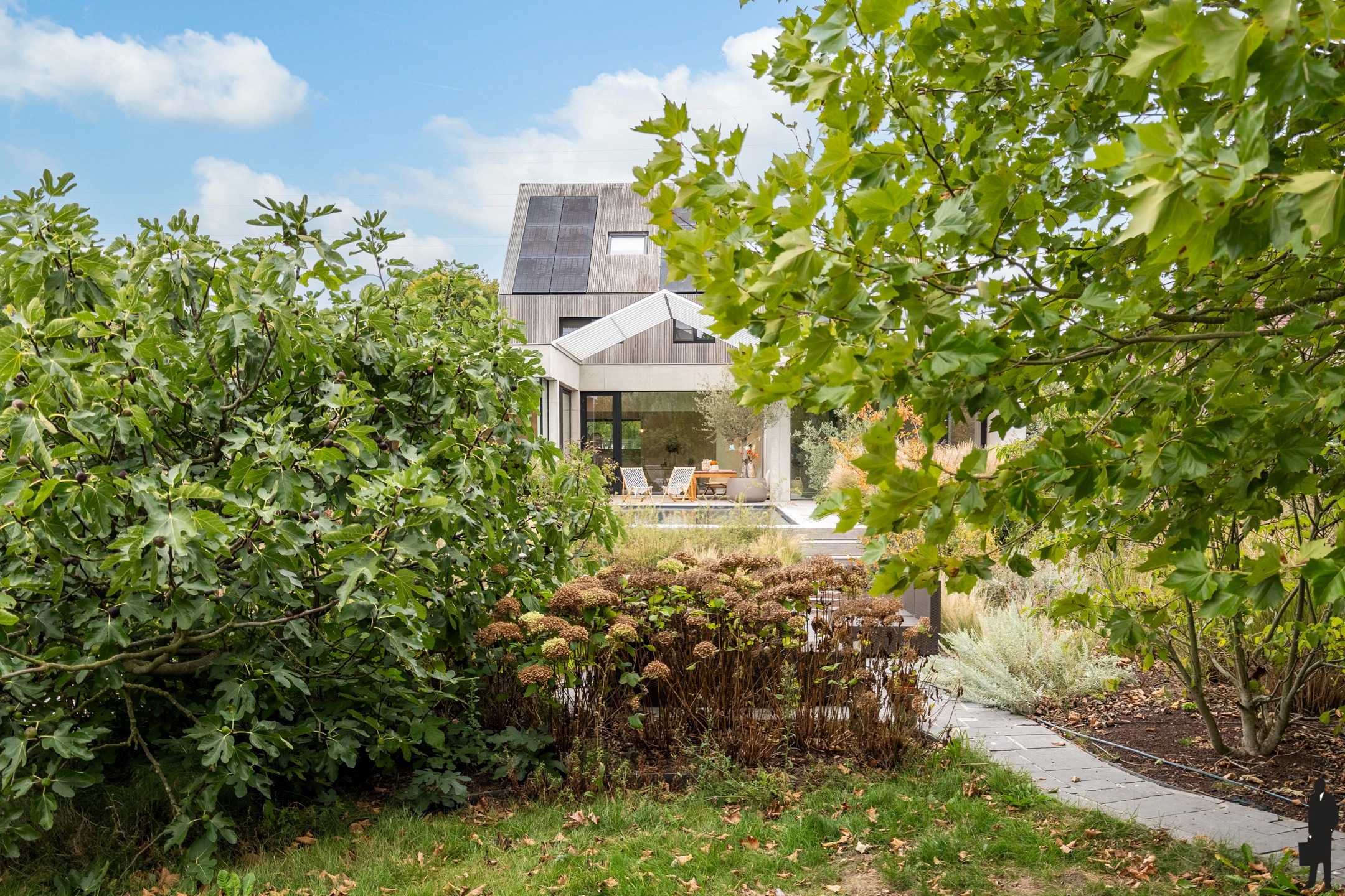 De villa biedt o.a. 4 à 6 ruime slaapkamers, 2 badkamers, een uiterst lichtrijke, open leefruimte en een diepe, organisch ingerichte natuurtuin (met zonneterrassen en infinity-zwembad).