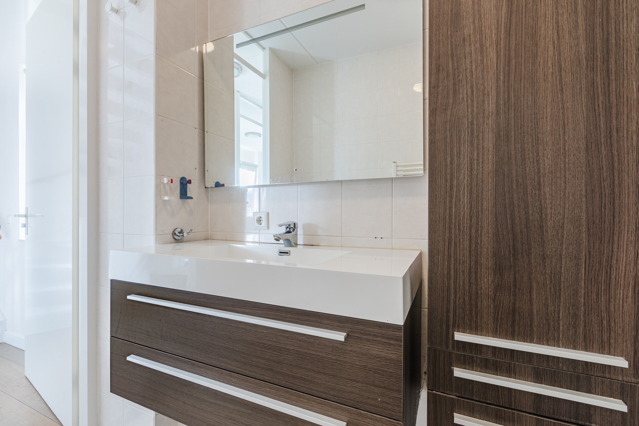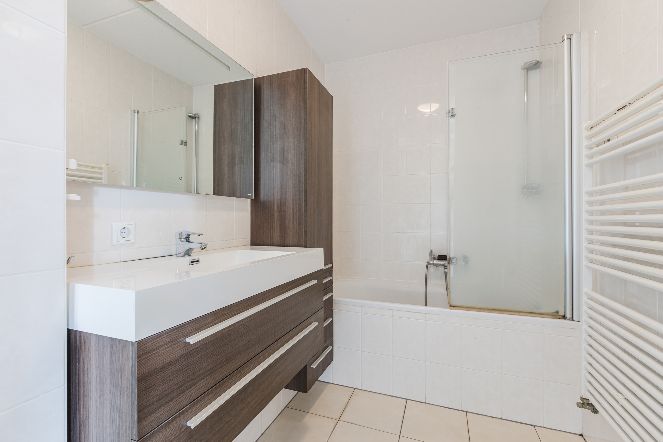 De badkamer is uitgerust met een ligbad met daarin een geïntrigeerde douche, toilet, een badkamermeubel met wastafel en een kast.