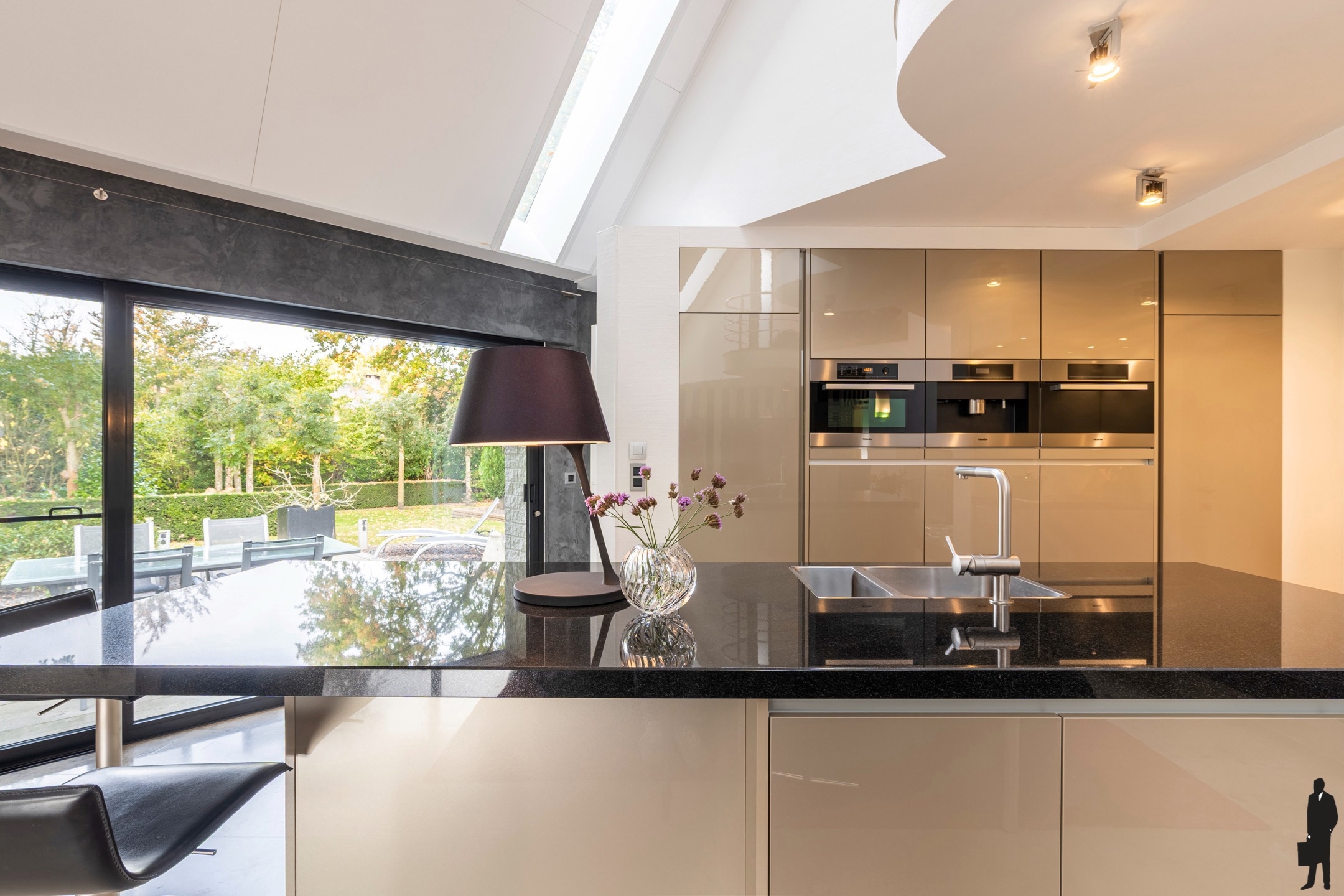 De keuken - met aansluitende wasplaats / koele berging - bevat een kookeiland met ontbijthoek op hoogte en is volledig voorzien van alle nodige kwaliteitsapparatuur: vaatwasmachine, indcutiekookplaat, stoomoven, combi-oven, inbouwkoffiezet (allen Miele-toestellen).
