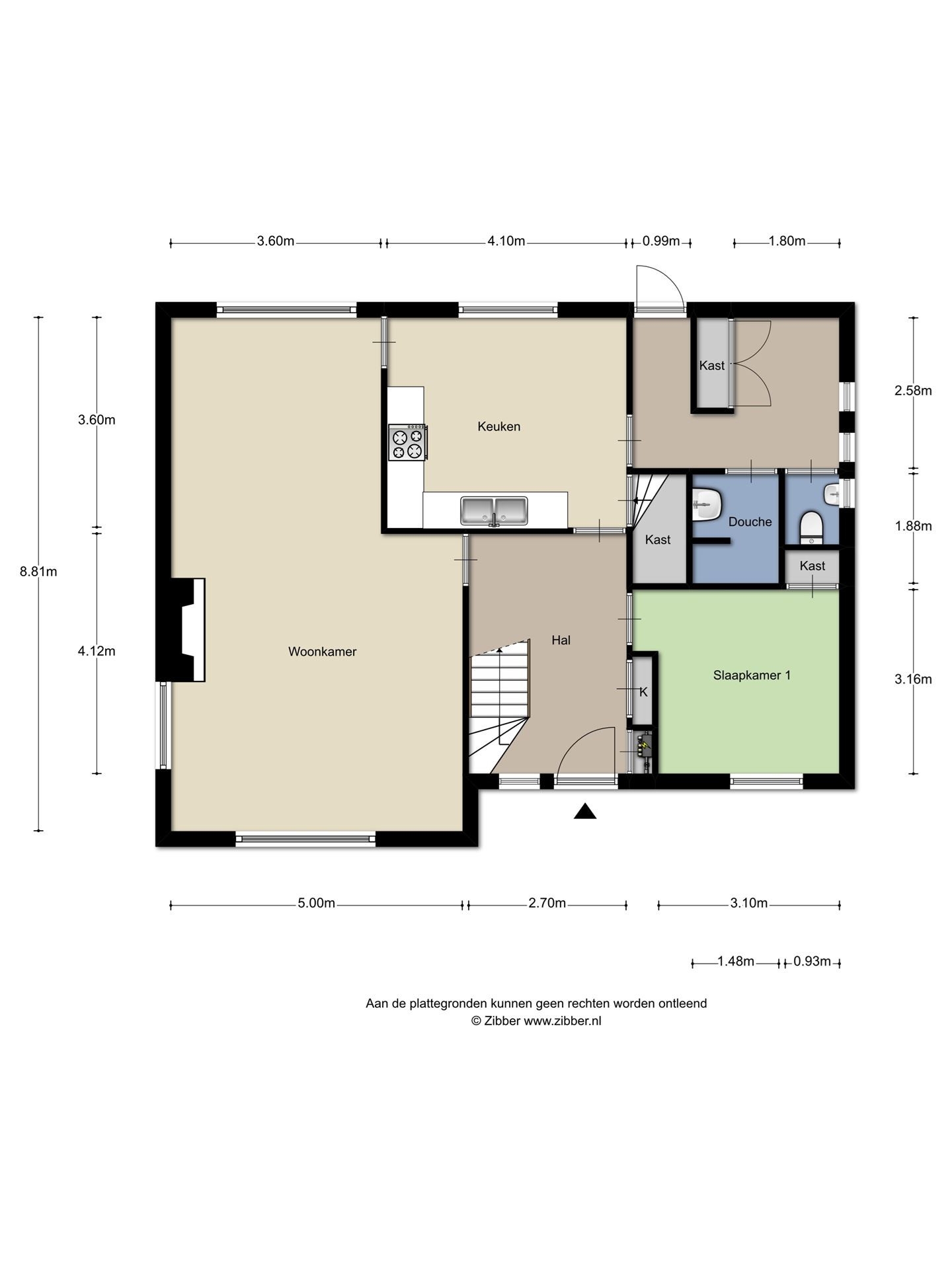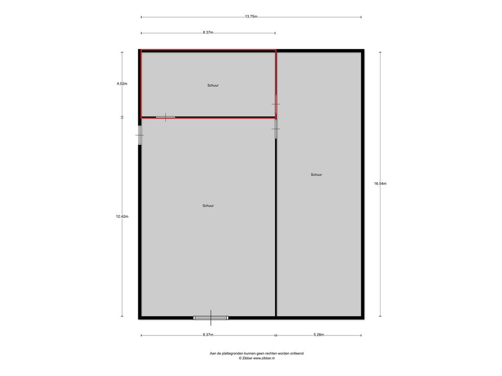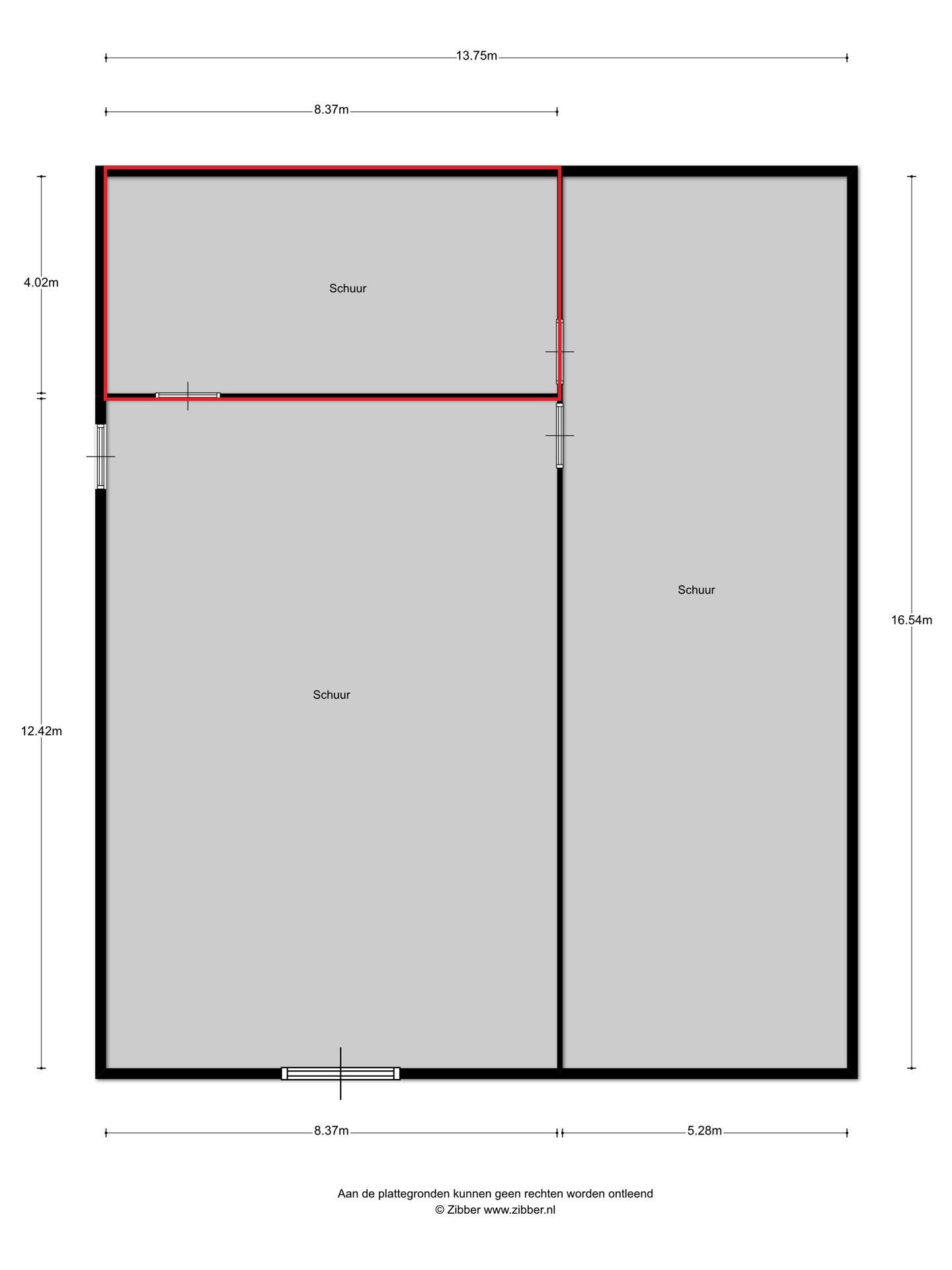 De bedrijfsruimte betreft het rode deel op de plattegrond 8.37 x 4.02.