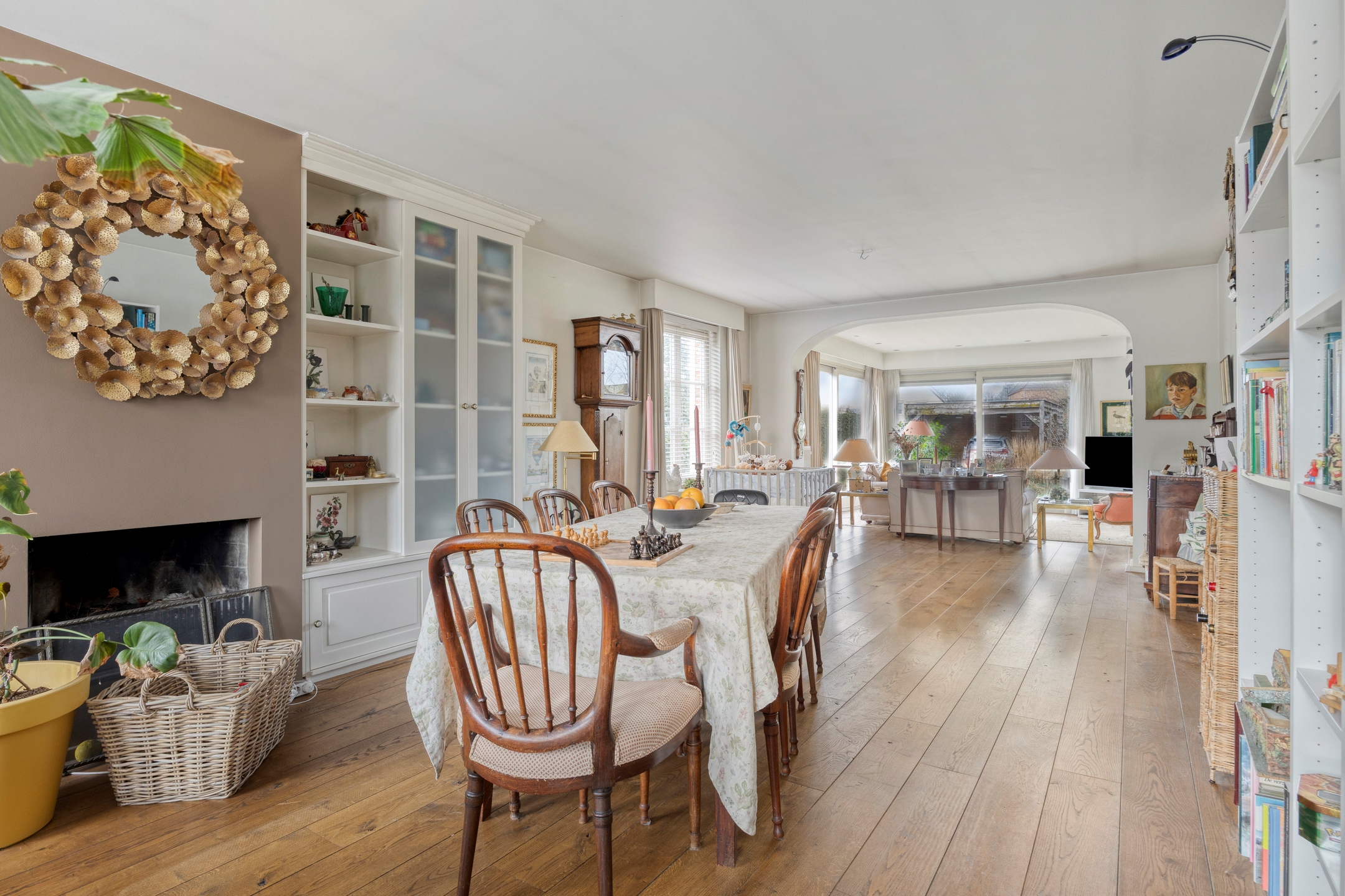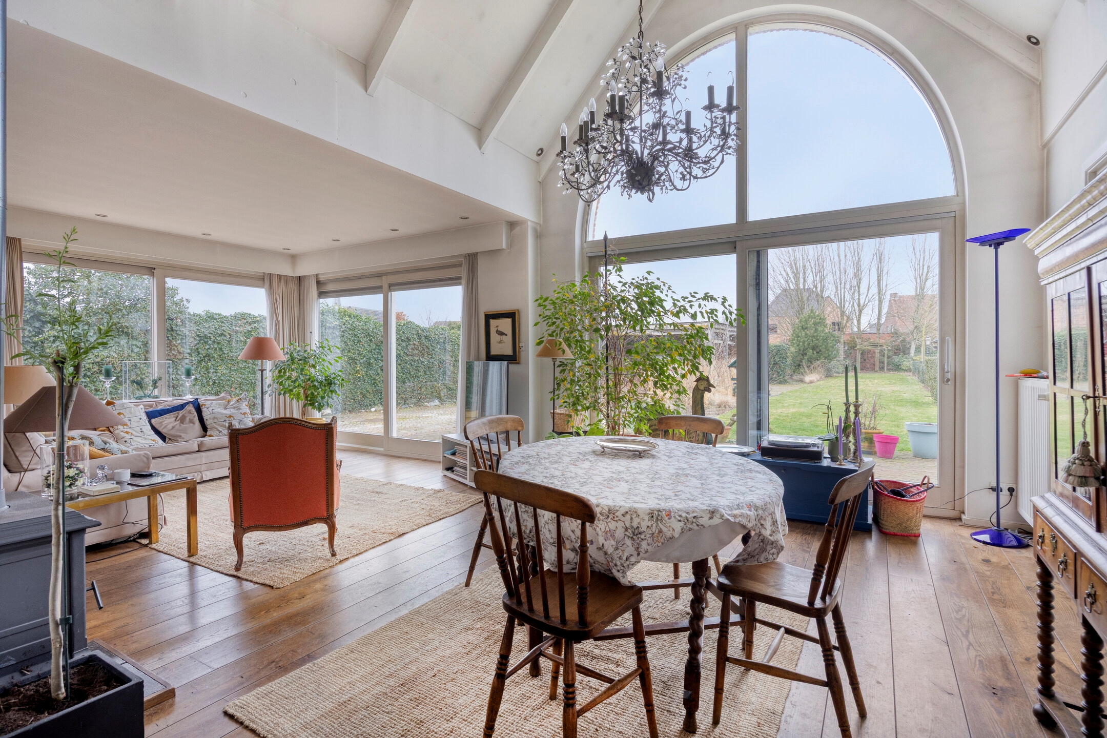 De gezellige leefruimte is afgewerkt met een warme parketvloer en beschikt over een prachtig hoog puntplafond en zeer grote raampartijen, die zorgen voor een fantastisch licht en ruimtelijk gevoel en een prachtig uitzicht op de ruime tuin.