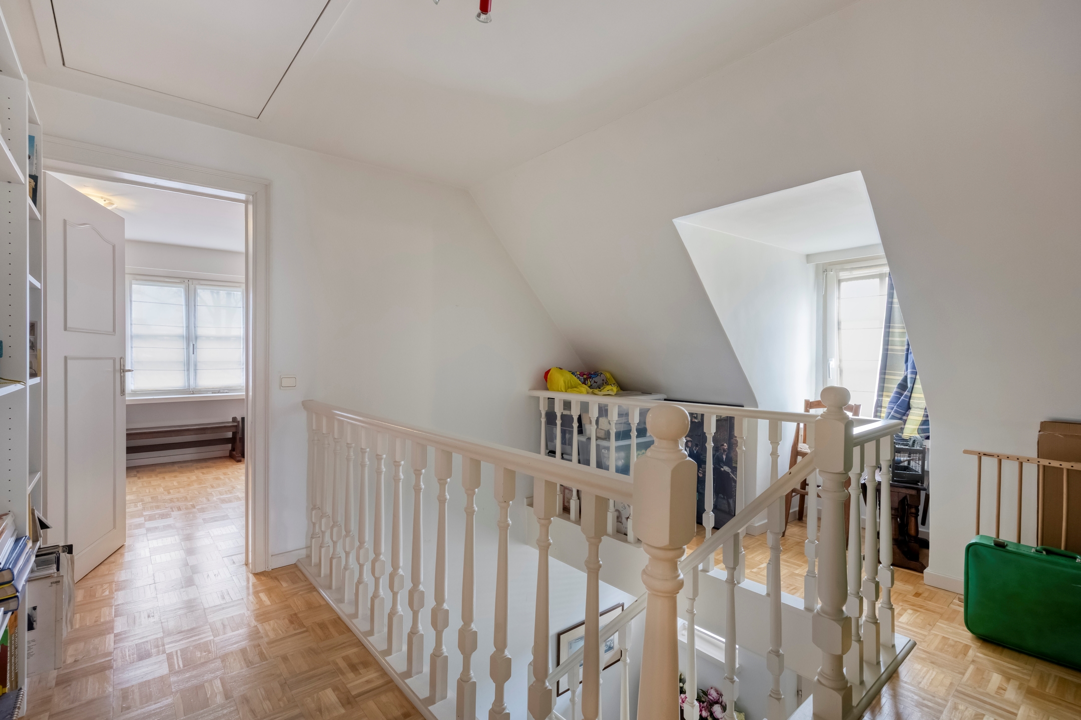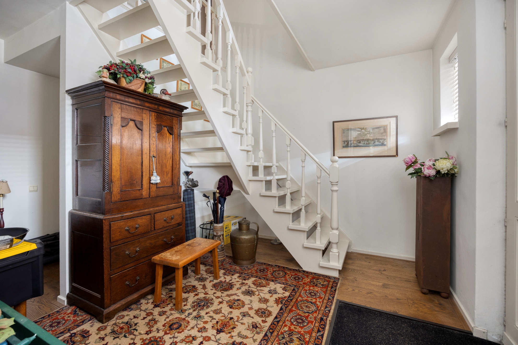 Via de vaste houten trap bereikt u de eerste verdieping, afgewerkt met een mooie houten vloer.