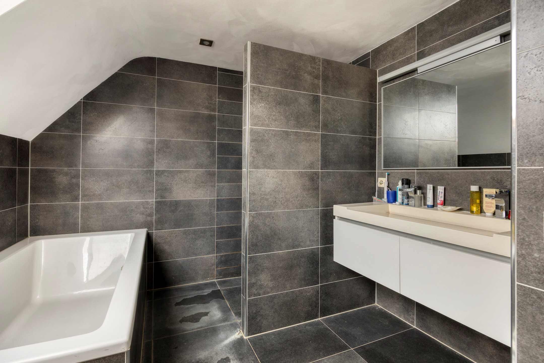 De badkamer op deze verdieping is volledig uitgerust met een ligbad, inloopdouche, toilet en dubbele wastafel.