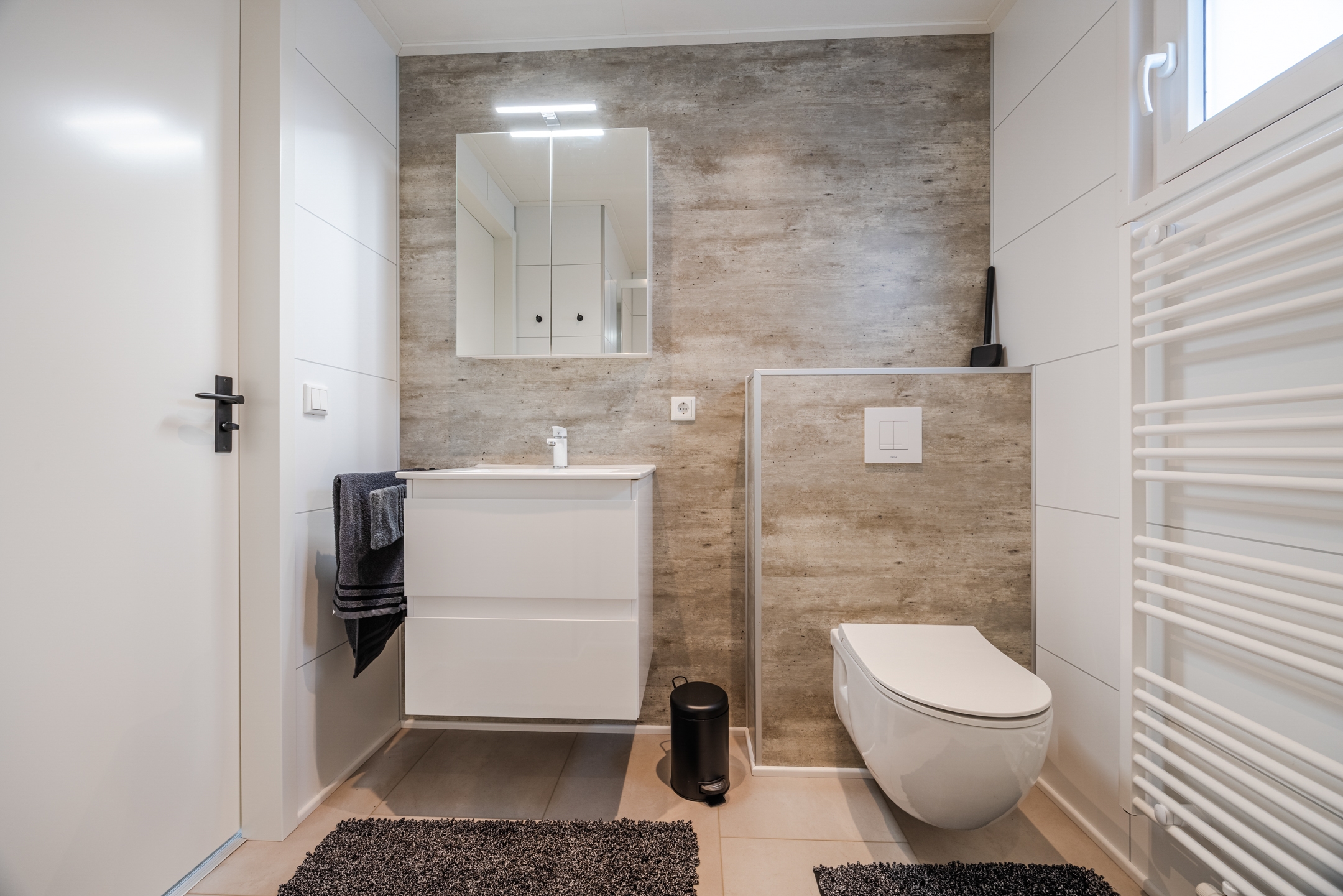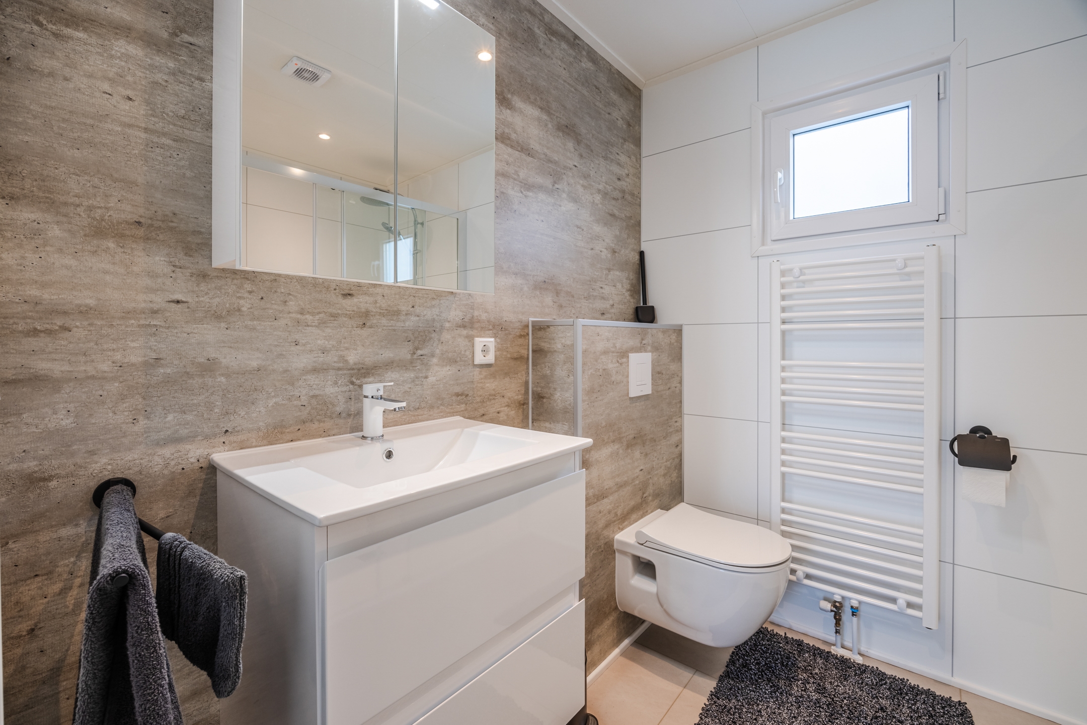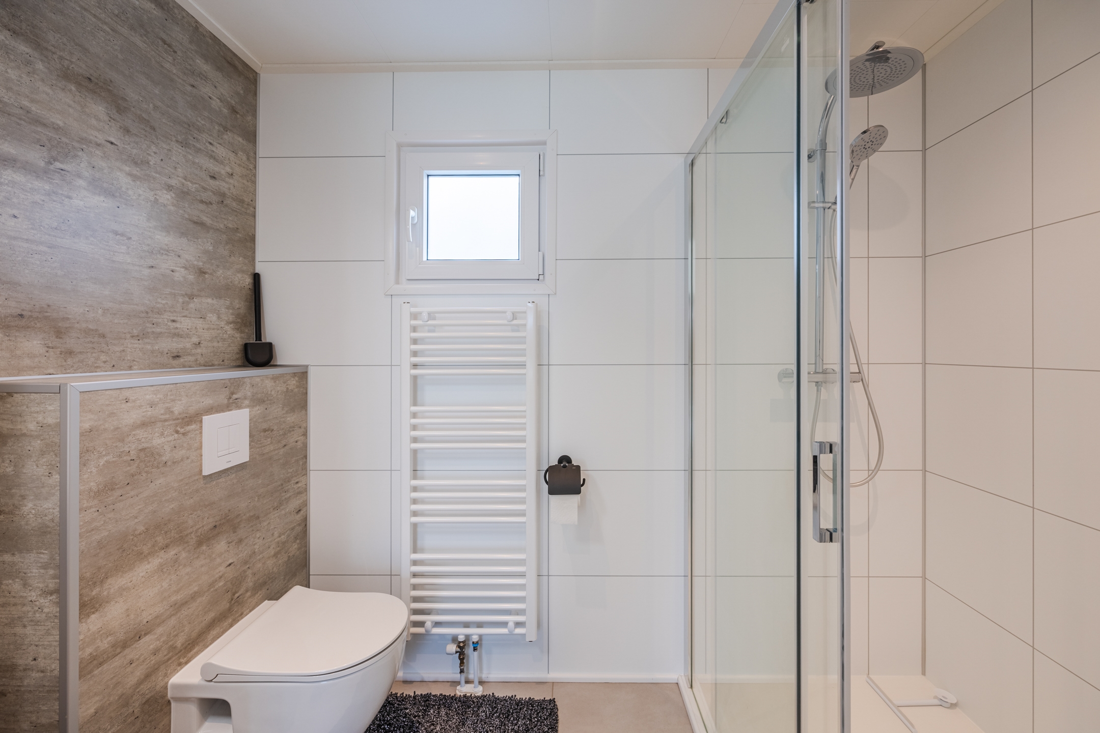 De badkamer is modern en praktisch ingericht, voorzien van een douche, wastafel en toilet.