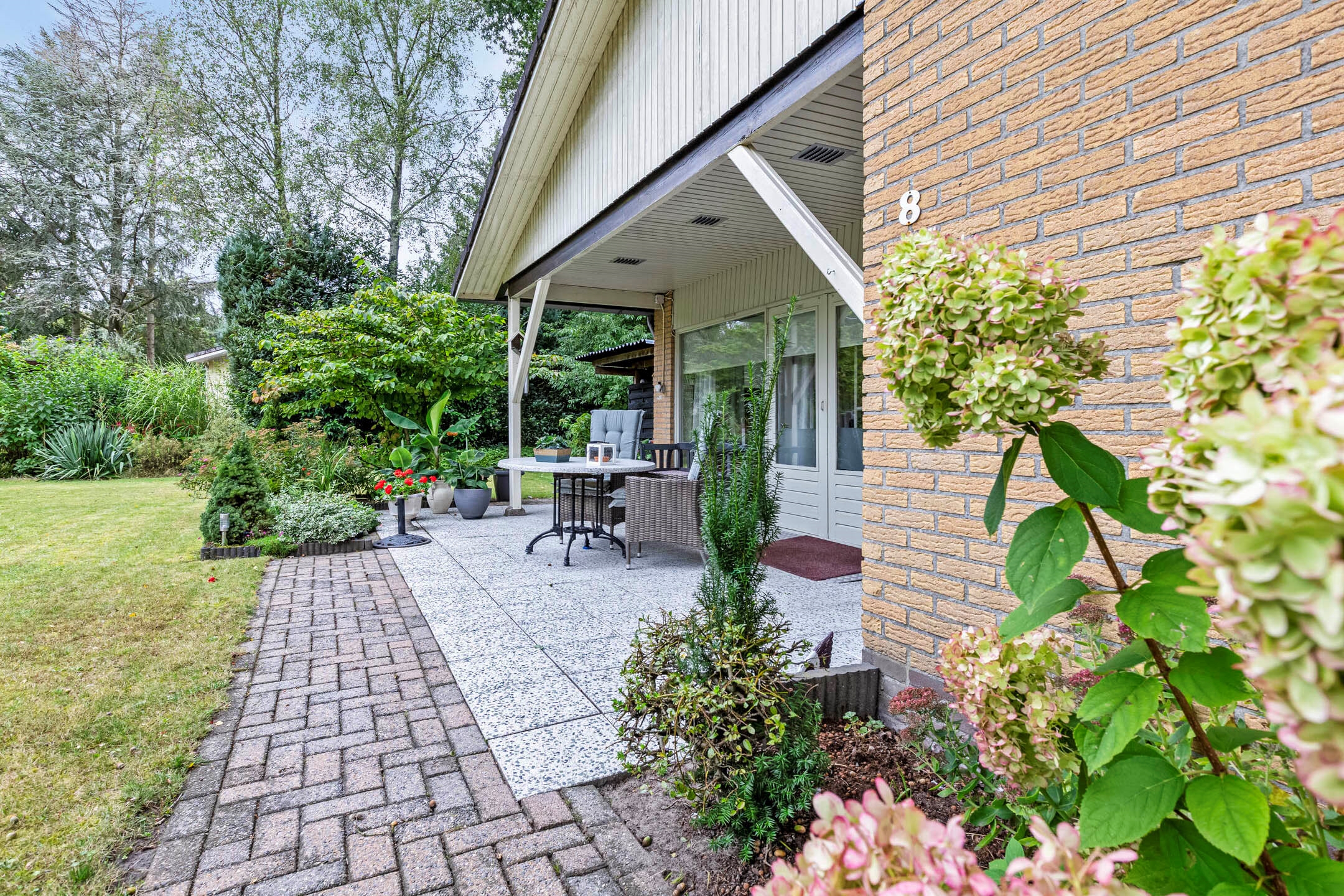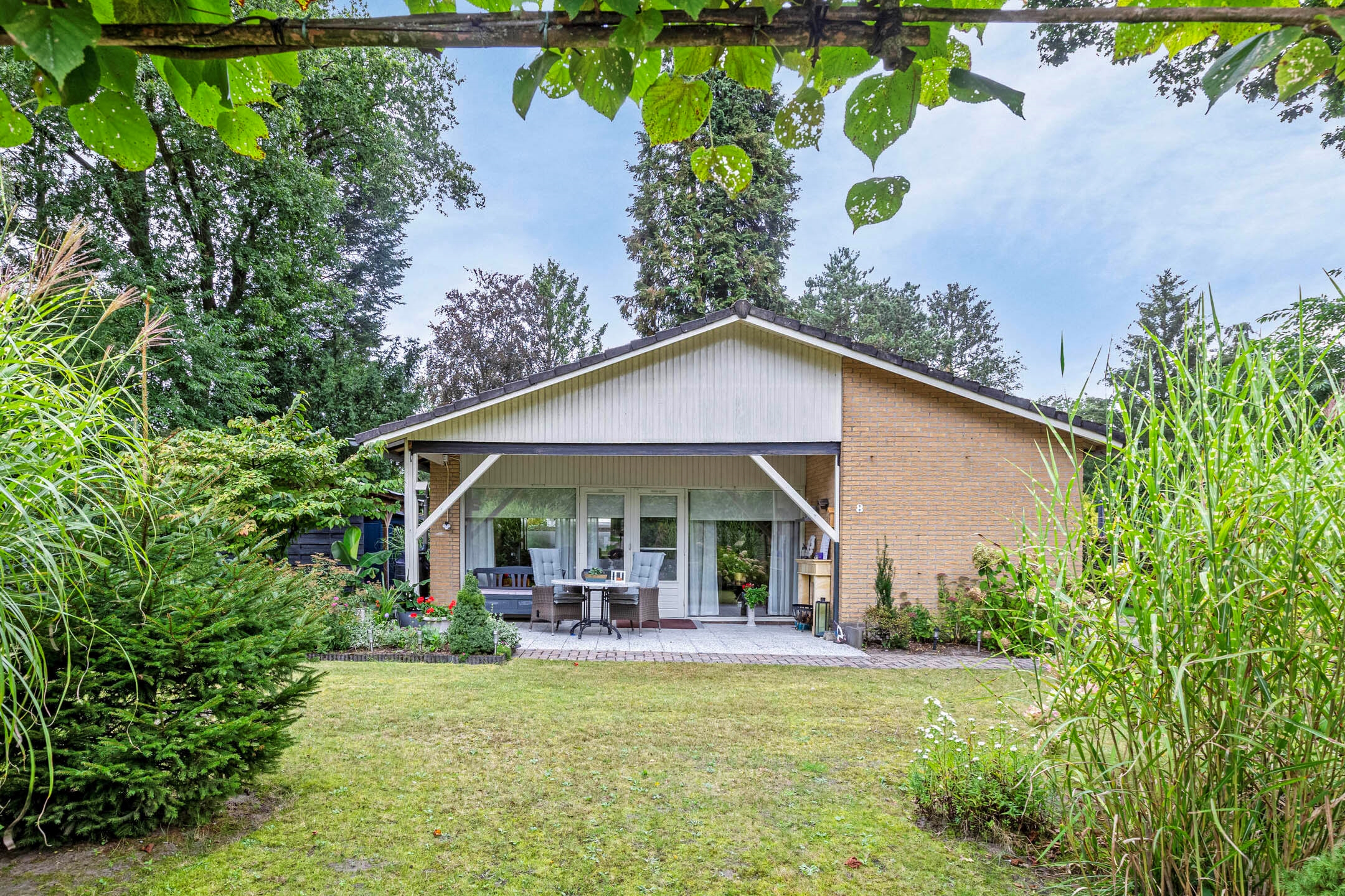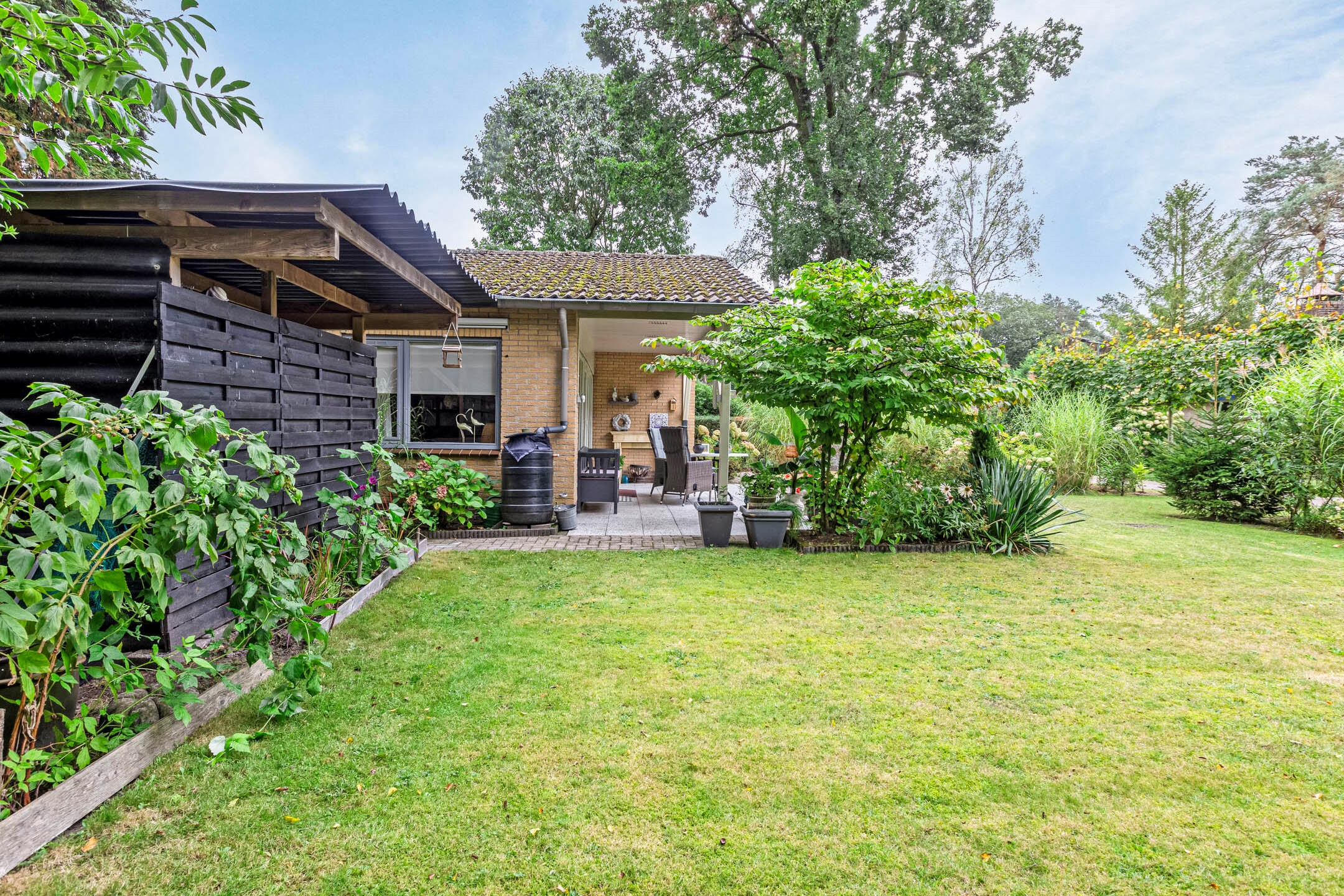 De recreatiewoning staat op een perceel van 569 m² eigen grond. De tuin is gelegen rondom de woning. De privacy biedende tuin is voorzien van gazon, terras, bomen, struiken en plantenborders.