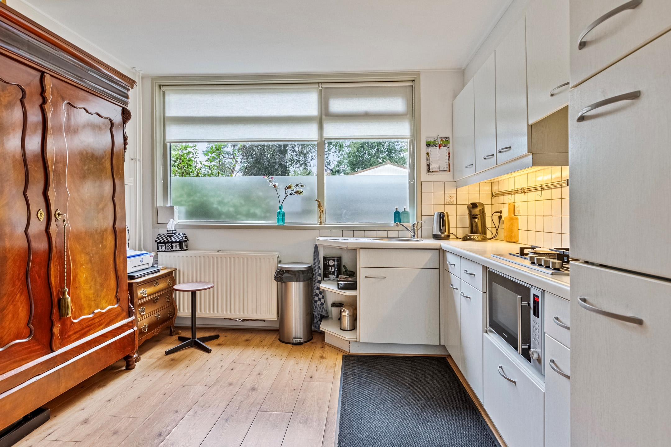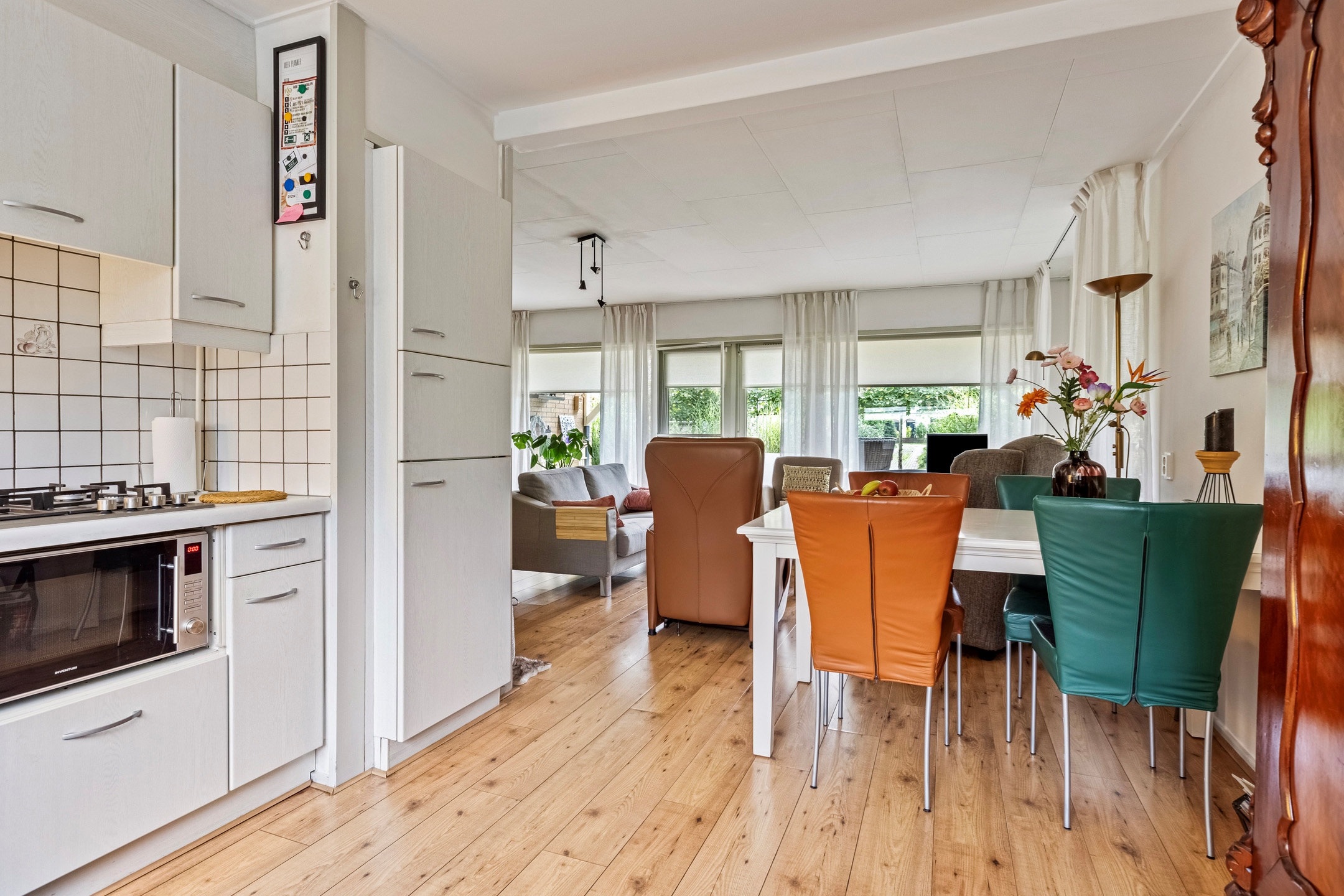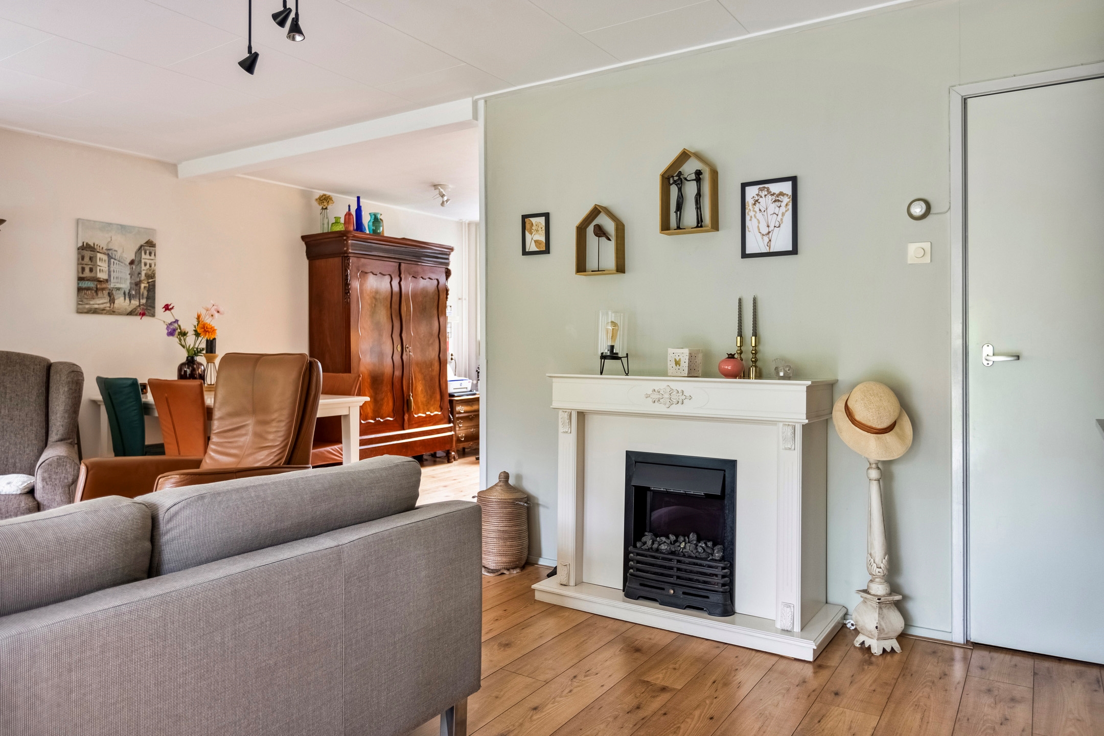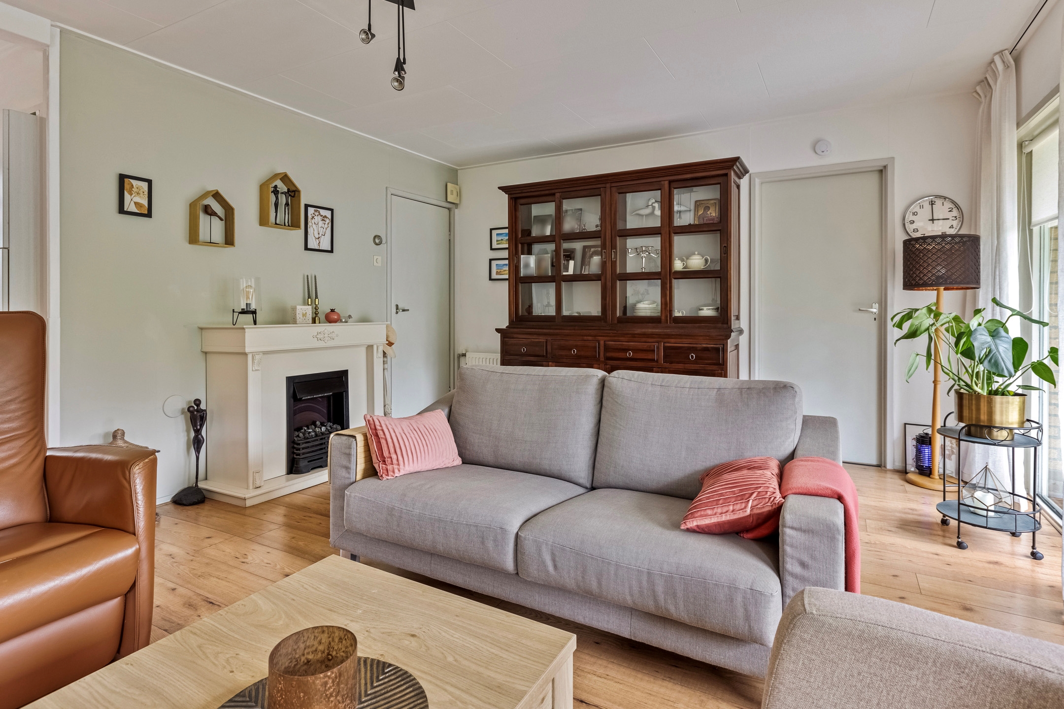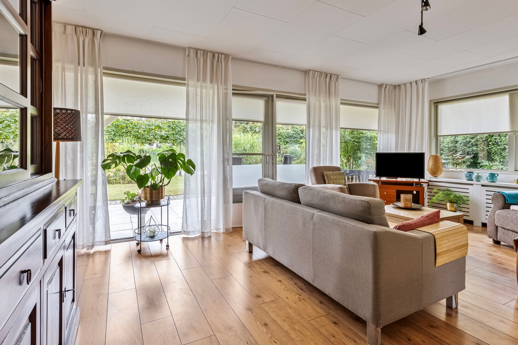 Ruime en lichte woonkamer van circa 36m² (inclusief open keuken) voorzien van inbouwkasten, een houtkachel, lichtkoepel en een schuifpui met toegang tot de tuin. De woonkamer is voorzien van een tegelvloer met vloerverwarming.
