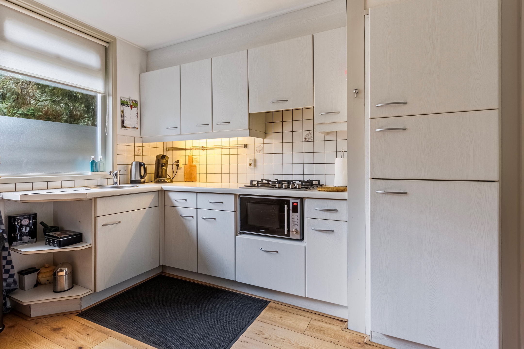 Open keuken met een keukenblok in hoekopstelling voorzien van een keramische kookplaat, afzuigkap, combimagnetron en een koelkast met vriezer.
