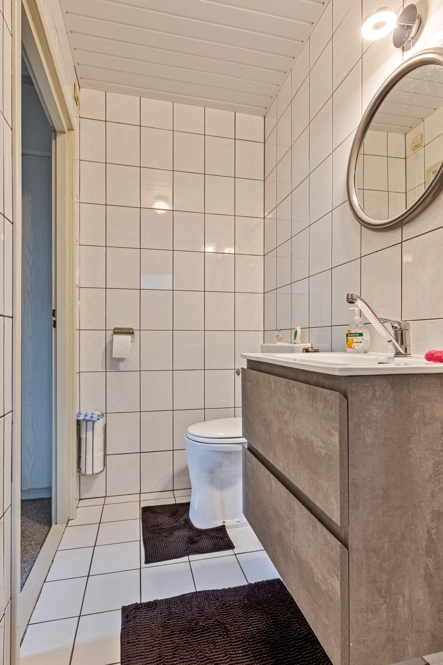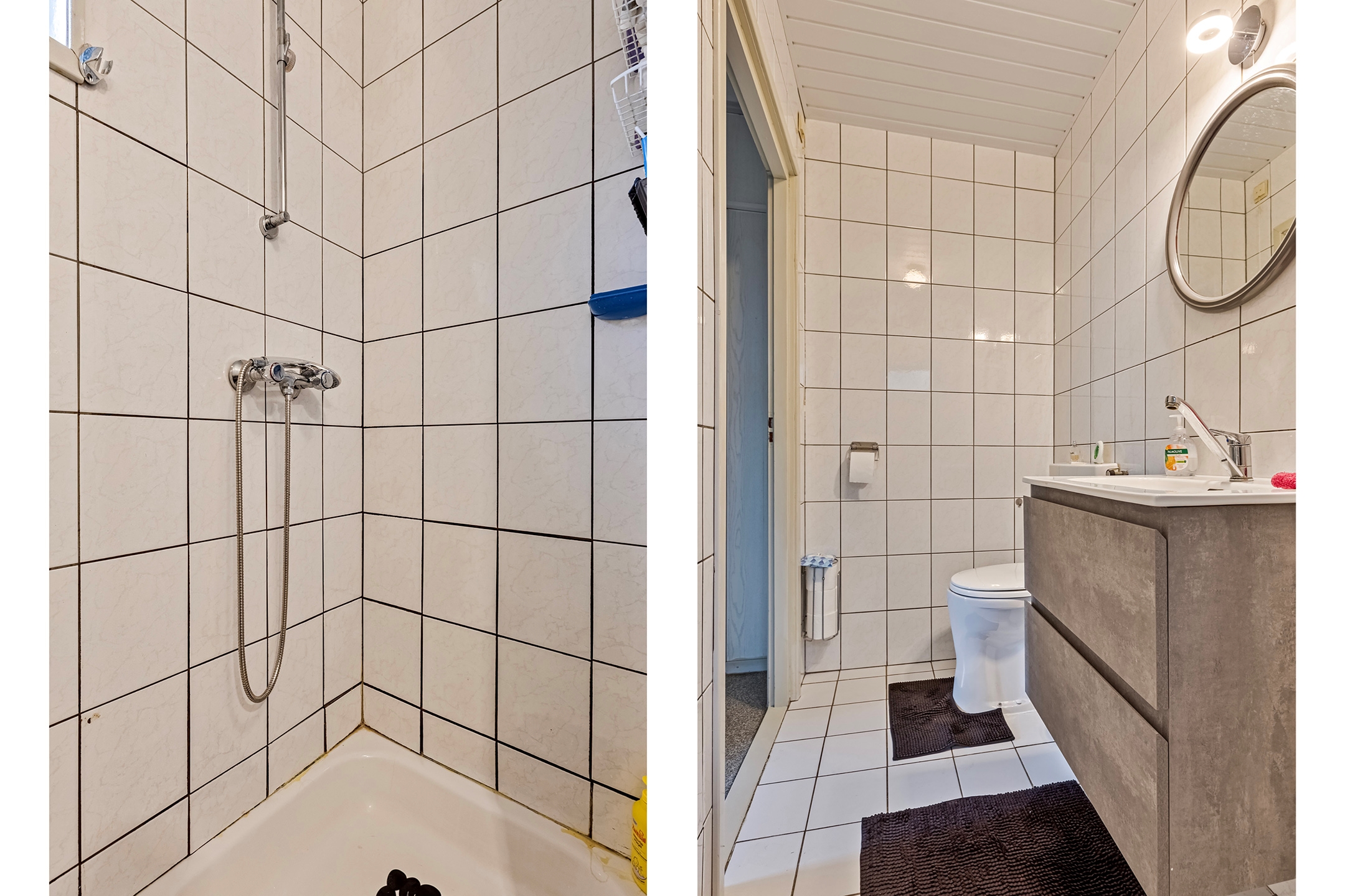 Betegelde badkamer voorzien van toilet, wastafelmeubel, douchecabine.