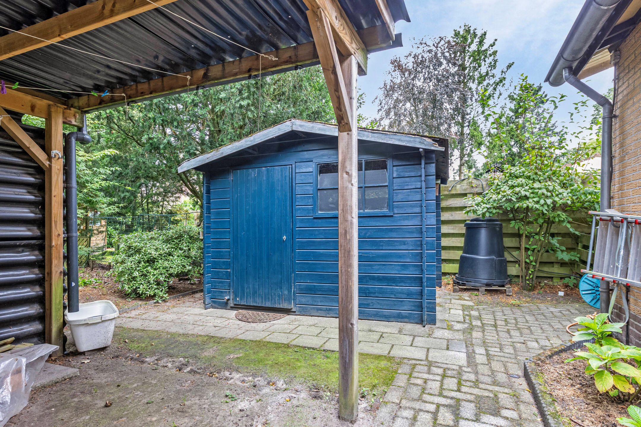 Er staat een houten berging en een overkapping voor opslag welke ook kan fungeren als carport.