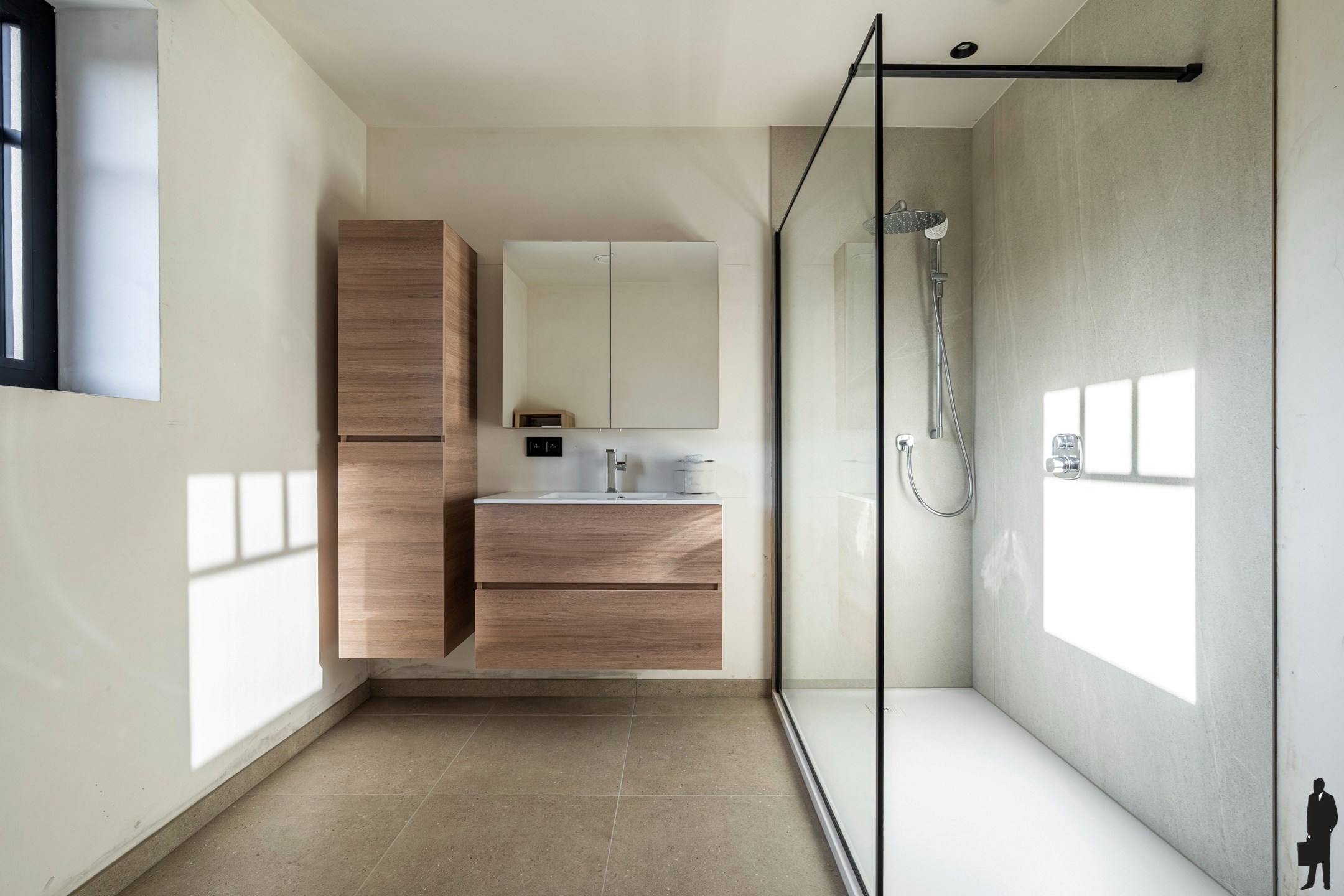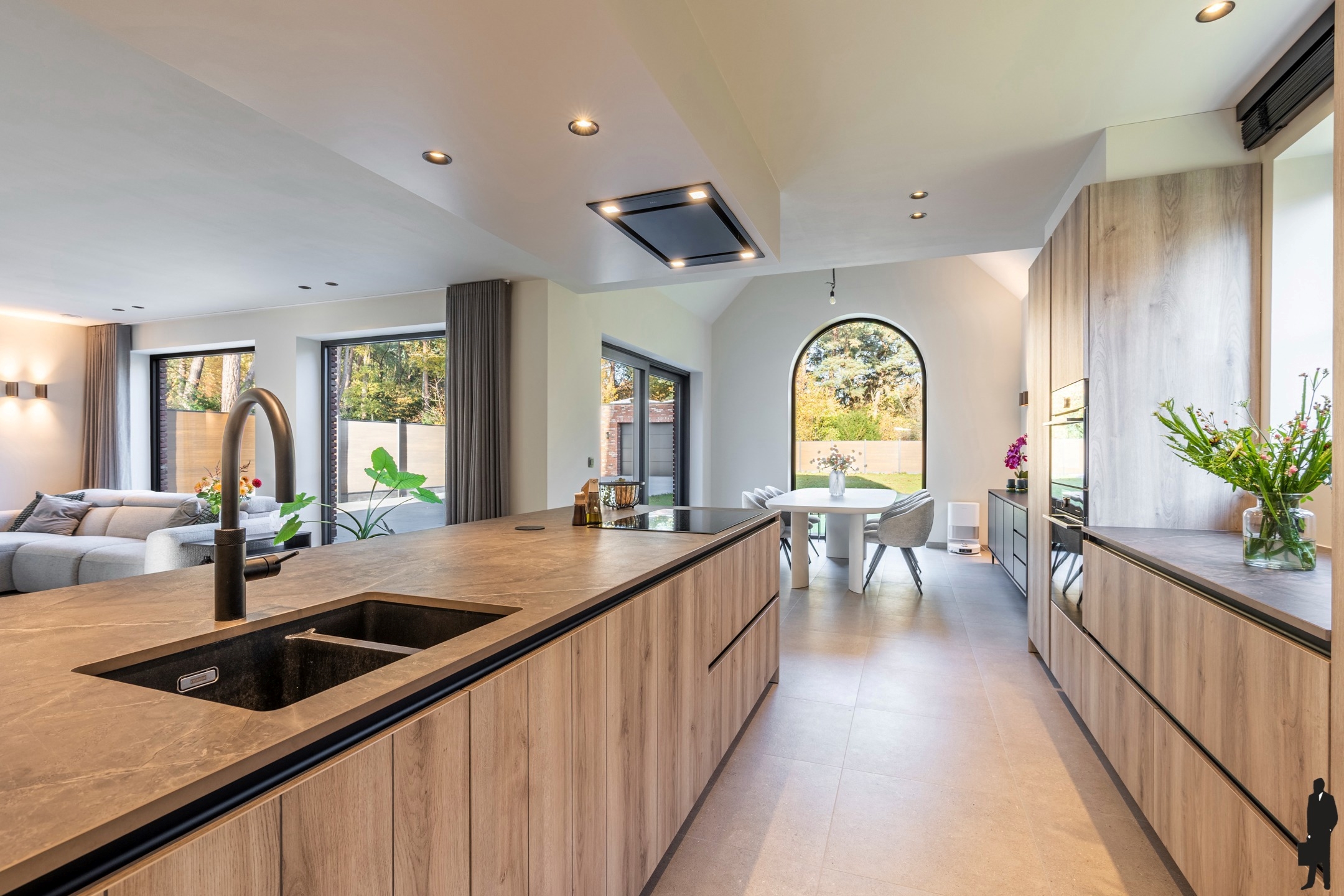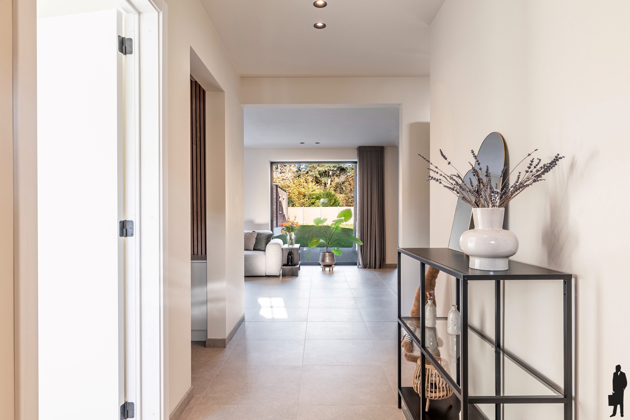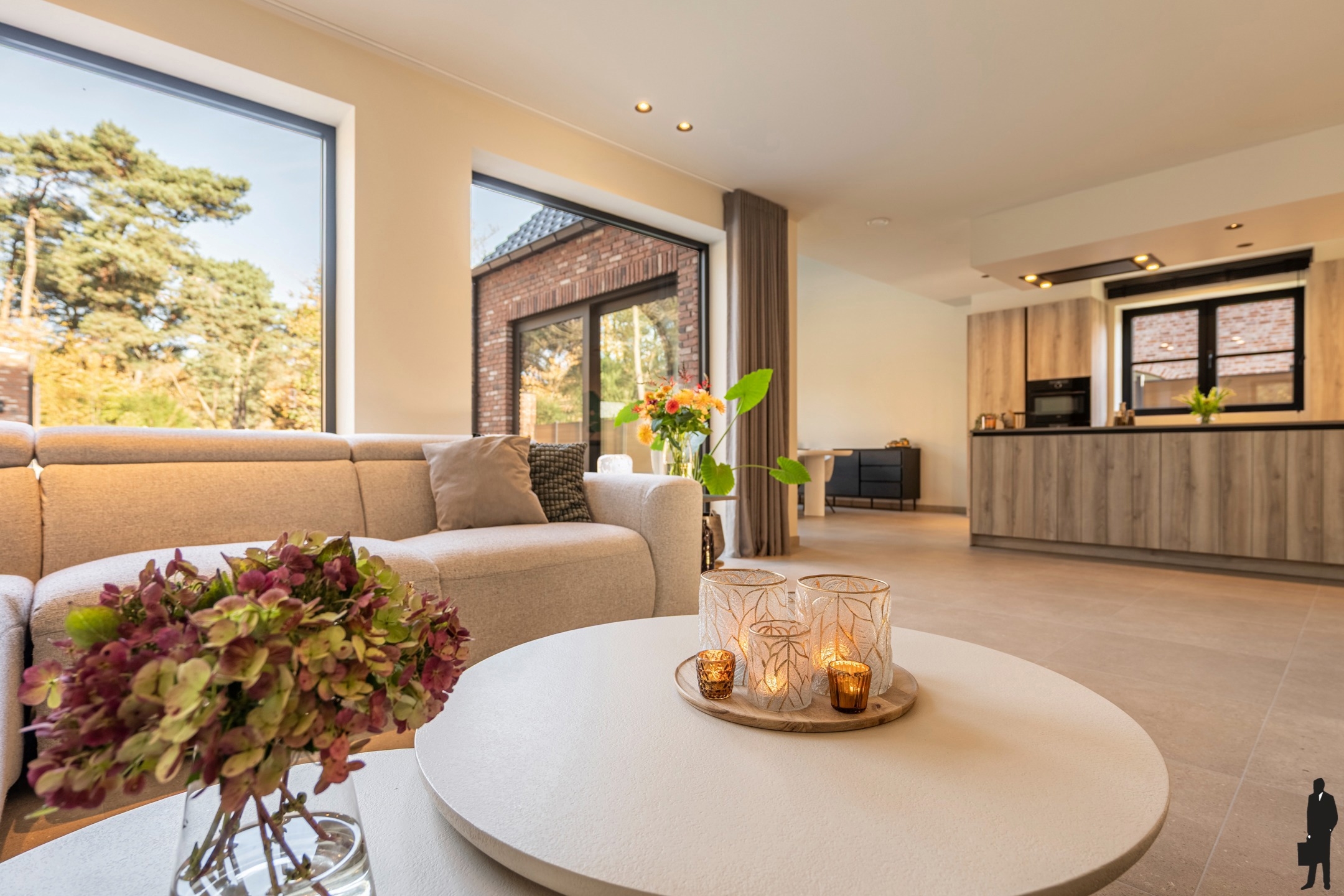 De leefruimte op meerlagige kwaliteitstegel is voorzien van vloerverwarming, inbouwspots en wandverlichting.