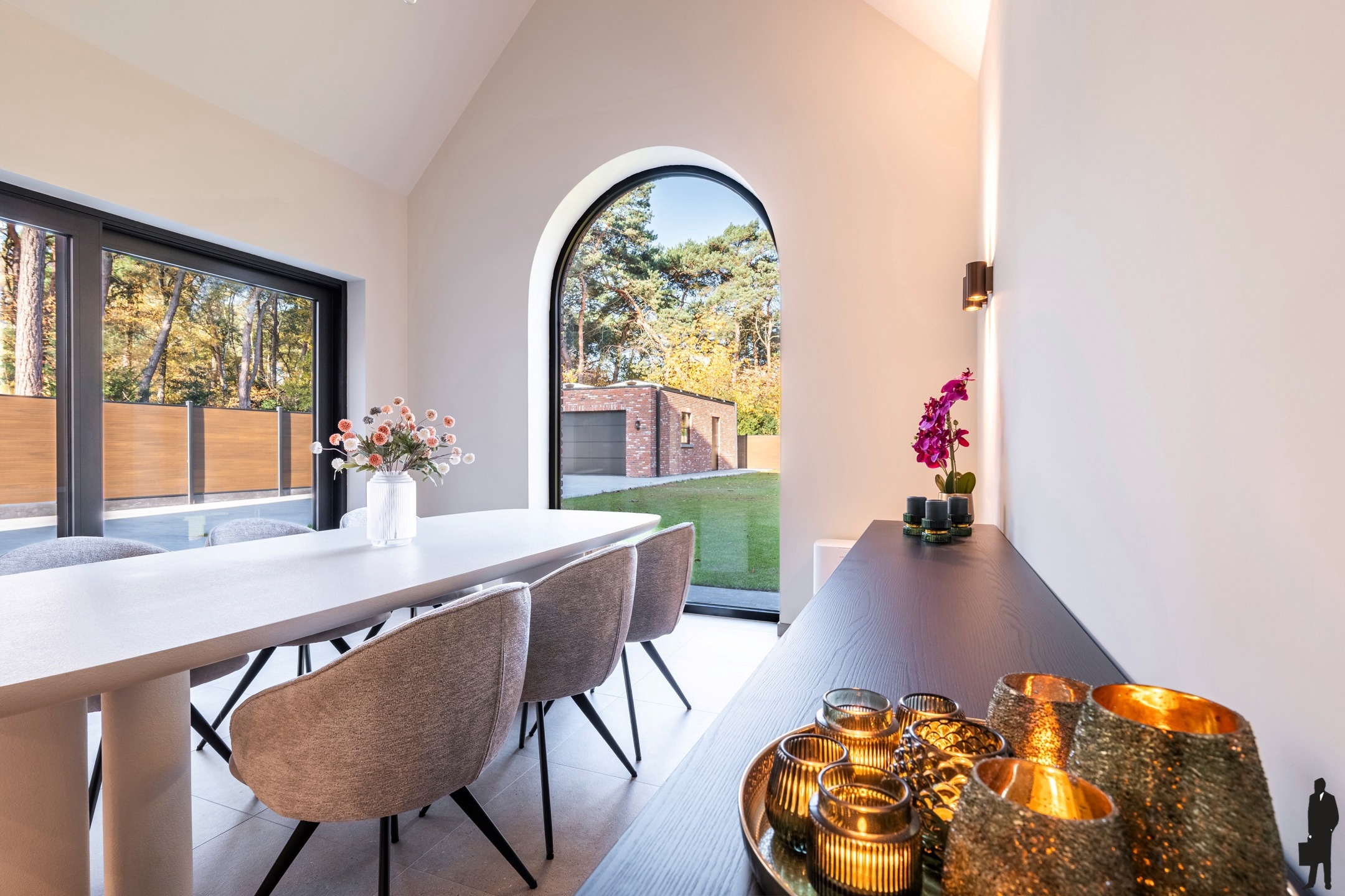 Aan de keuken bevindt zich een open eetkamerlounge met hoge raampartijen en schuifraam met toegang tot het buitenterras.