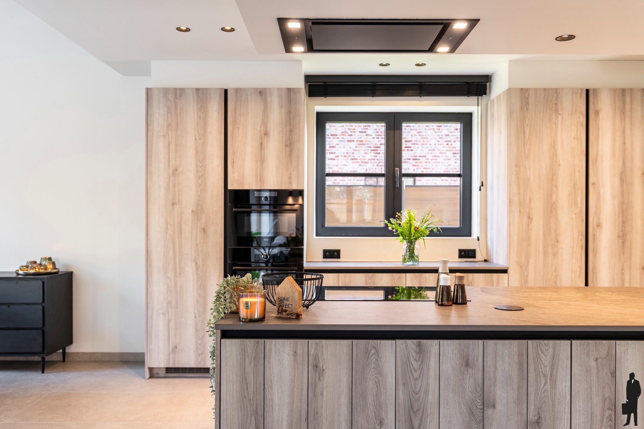 De keuken zelf is luxueus afgewerkt en geïnstalleerd met volgende kwaliteitstoestellen (allen AEG): inductiekookplaat, vaatwas, combi-(microgolf)oven en combi-stoomoven, legio kastruimte en een ruime ijskast.