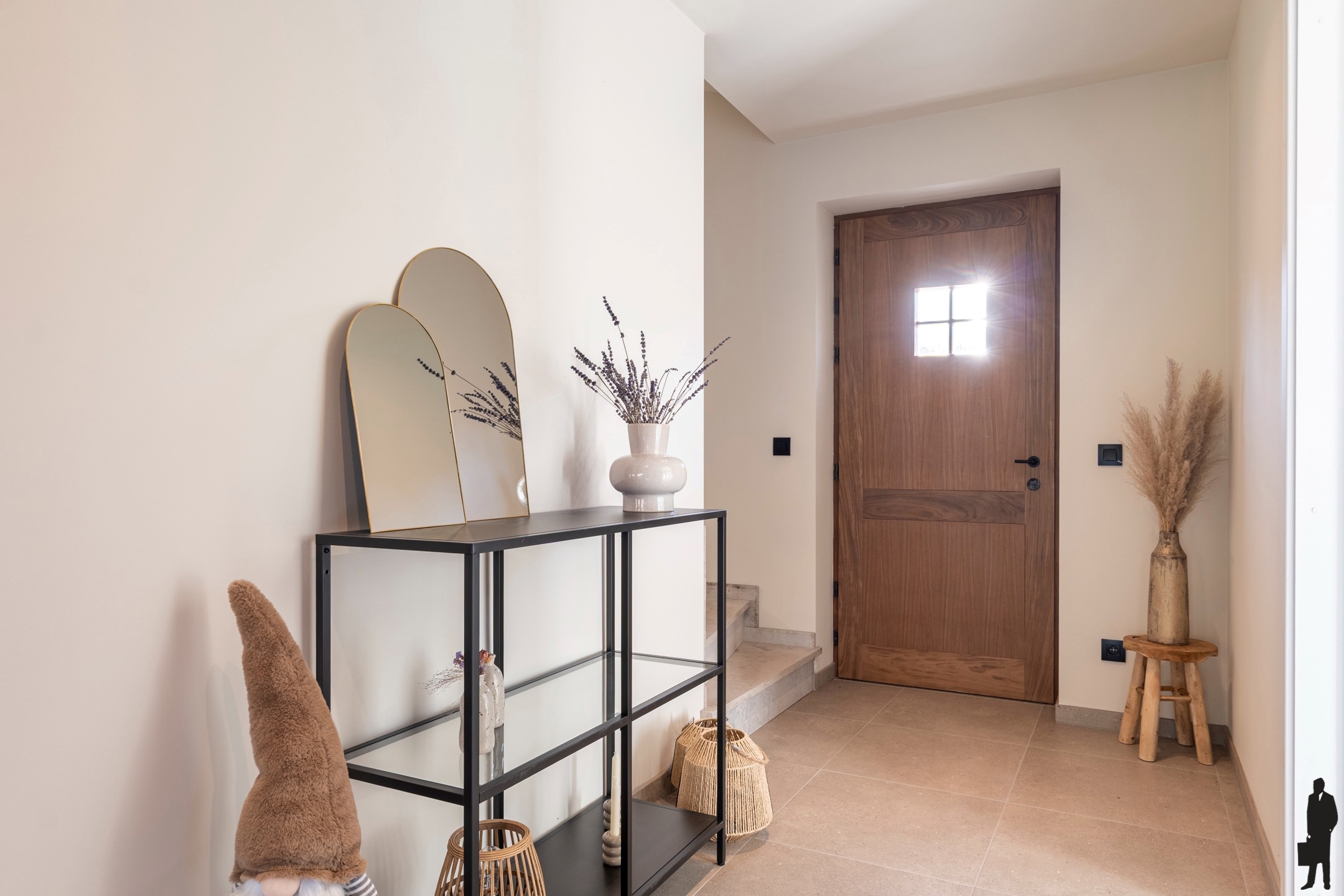 Via de inkomhal met gastentoilet en vestiairegedeelte (inbouwkasten), heeft u toegang tot de afzonderlijke bureauruimte (werk- of studieruimte) en de woonkamer. De riante en lichtrijke woonkamer is verdeeld in een zitgedeelte (links), een open leefkeuken (rechts vooraan) en eetkamerdeel (rechts achteraan).