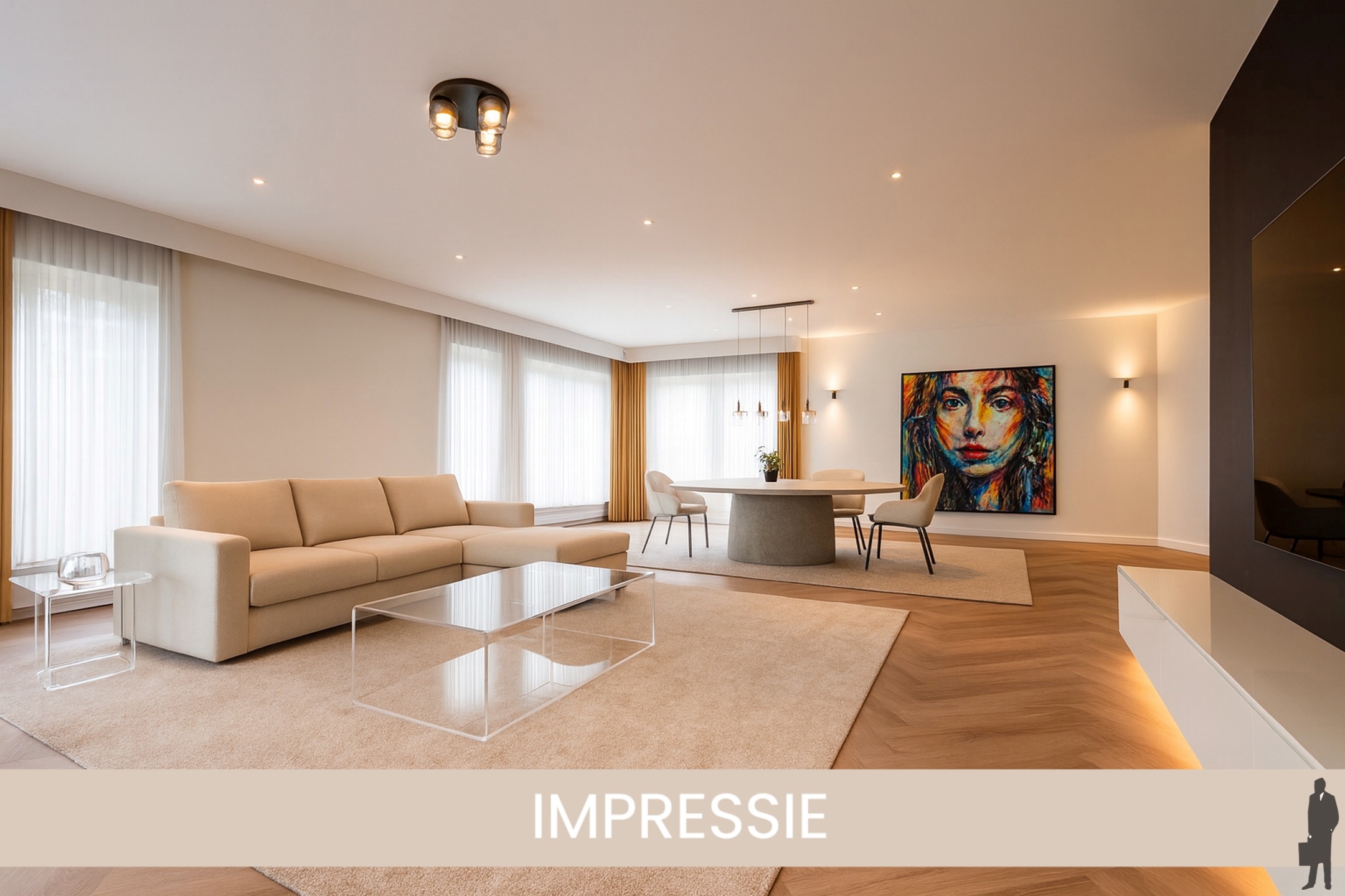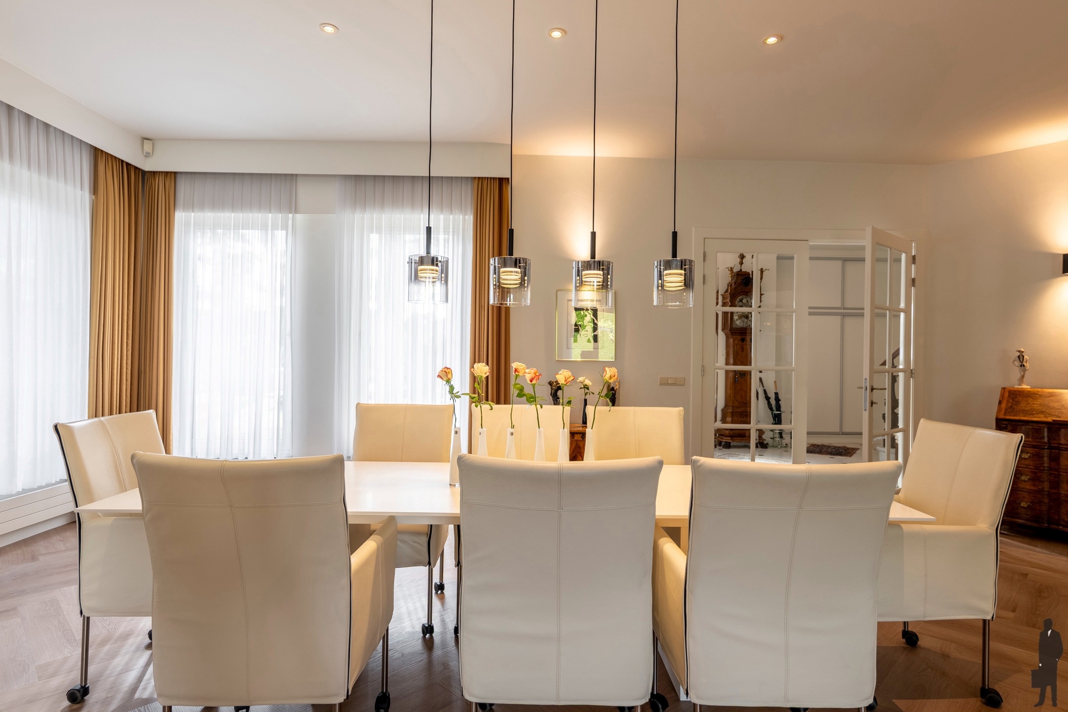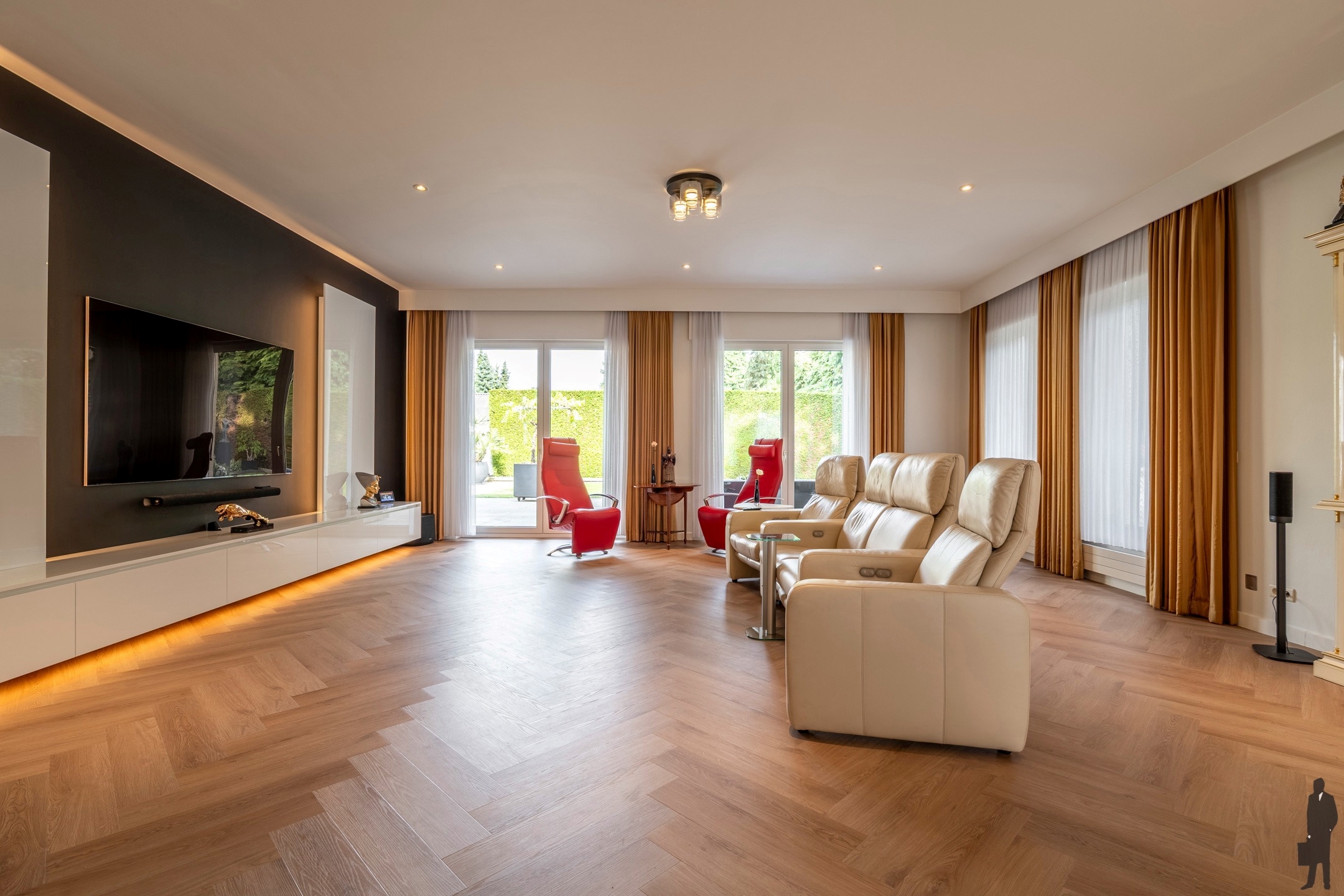 De leefruimte, met veel natuurlijk daglicht door de uitgesproken raampartijen en zicht op de voor-, zij- en achtertuin, is luxues afgewerkt (kwaliteitsparket) en stijlvol ingericht.