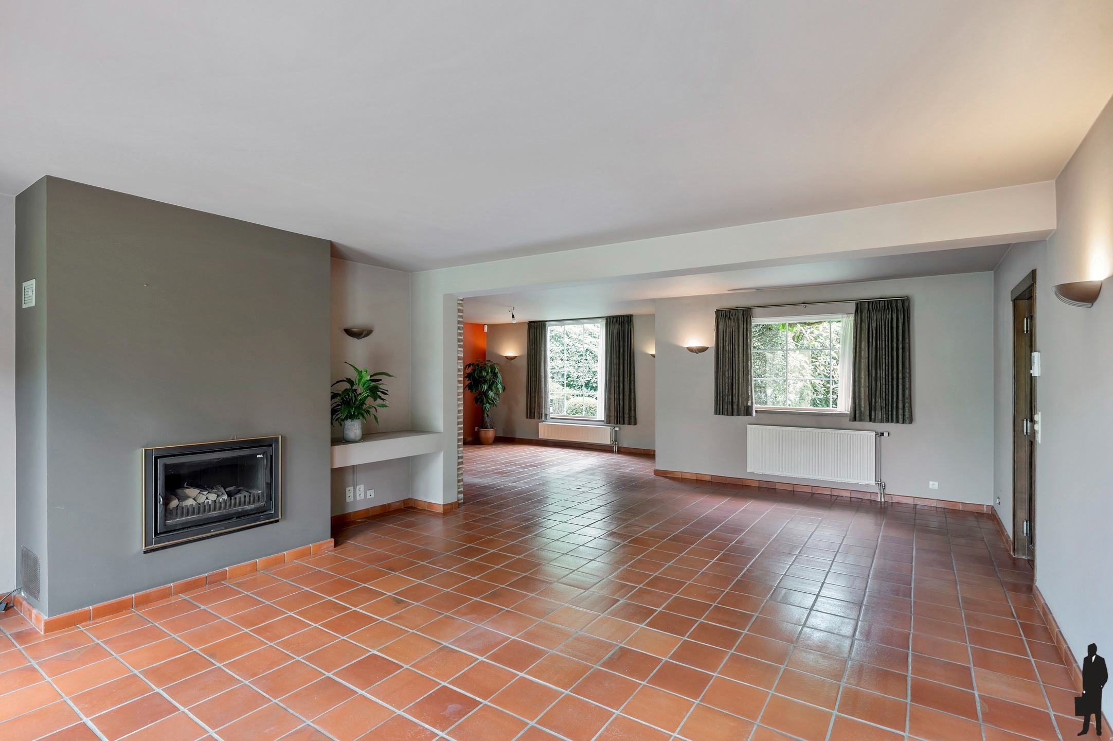De leefruimte is verdeeld in een eetkamer (vooraan) en een salongedeelte (achteraan) en geniet van veel natuurlijk daglicht door de grote raampartijen die uitgeven op de tuin.