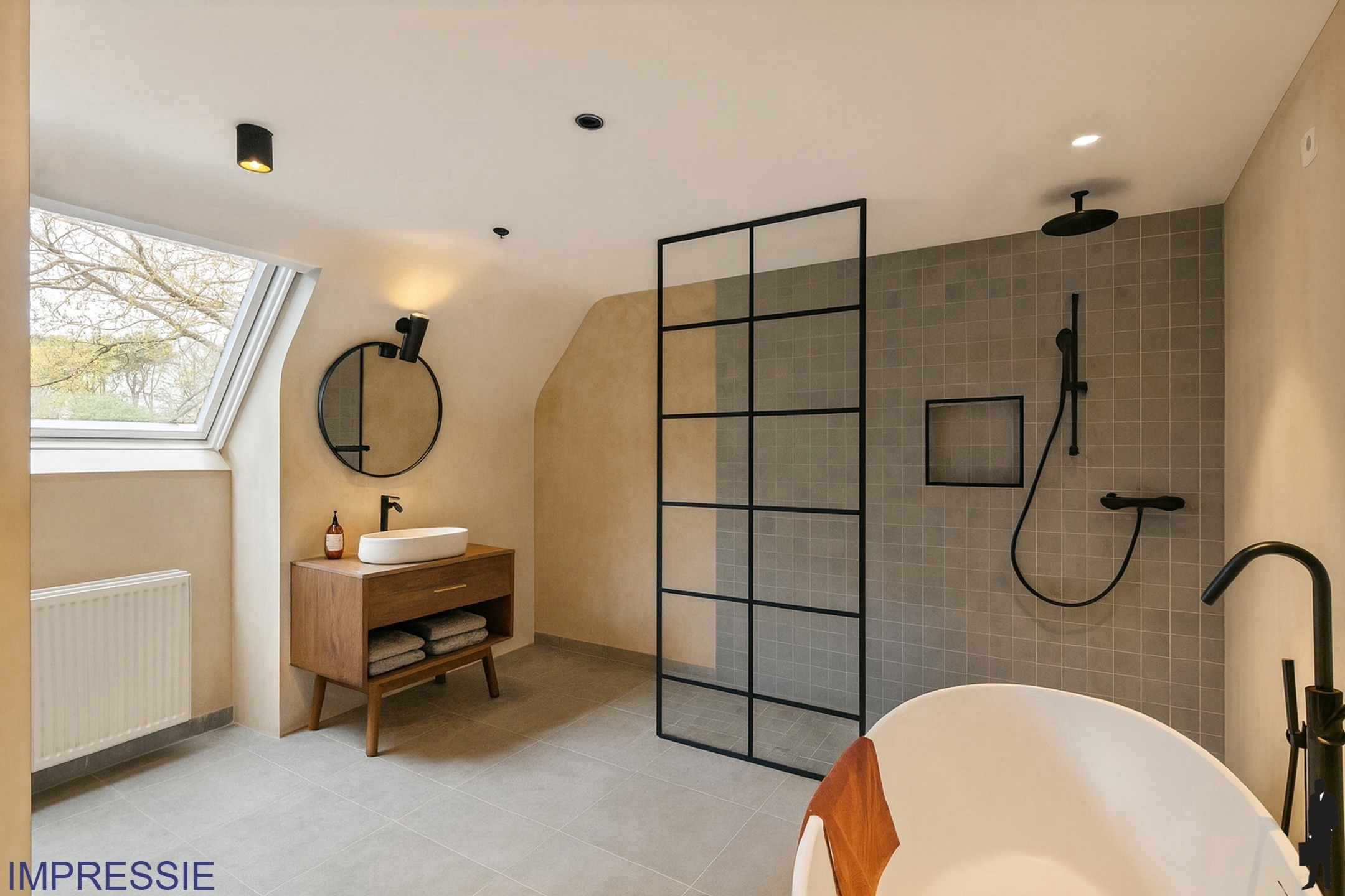 Op de bovenverdieping van de noordoostvleugel, bereikbaar via de inkomhal met vaste houten trap, bevinden zich 4 slaapkamers (3 ruime kamers en 1 kinderkamer), een dressing en 2 badkamers (waarvan 1 nog afgewerkt dient te worden).