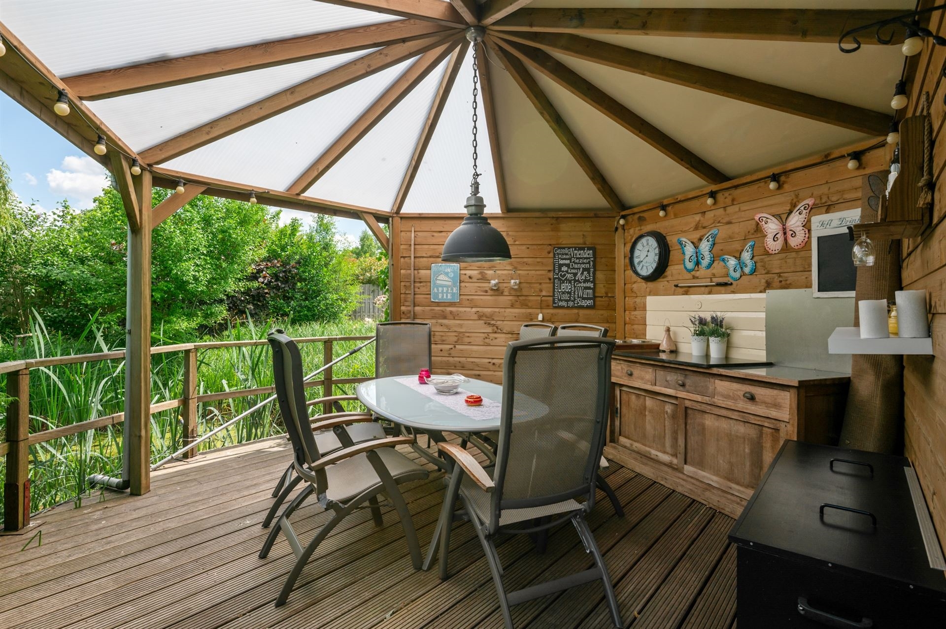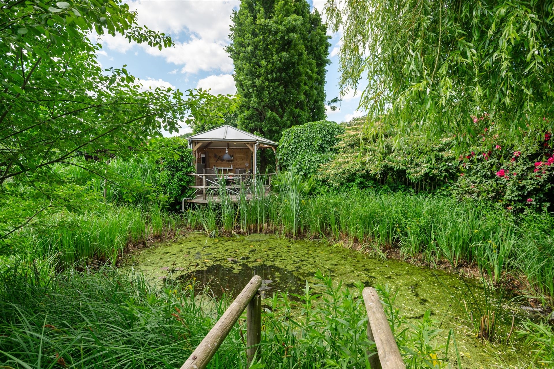 De woning wordt omringd door een prachtig aangelegde tuin met een rustgevende vijver, die uitnodigt tot ontspannen en genieten.