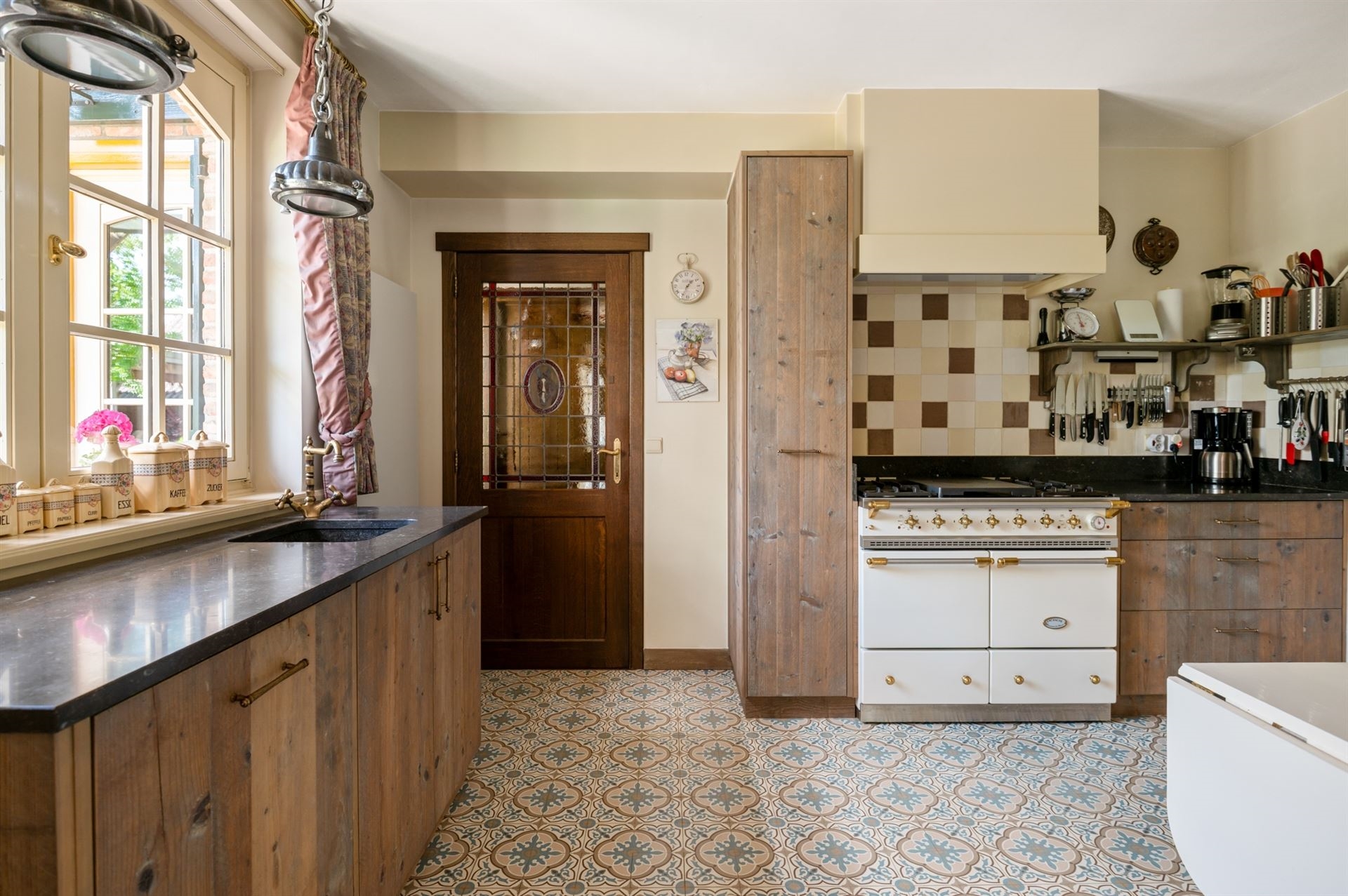 De keuken is volledig uitgerust met een luxueus gasfornuis, dampkap, vaatwasser en een stijlvol arduinen werkblad perfect voor de kookliefhebber.