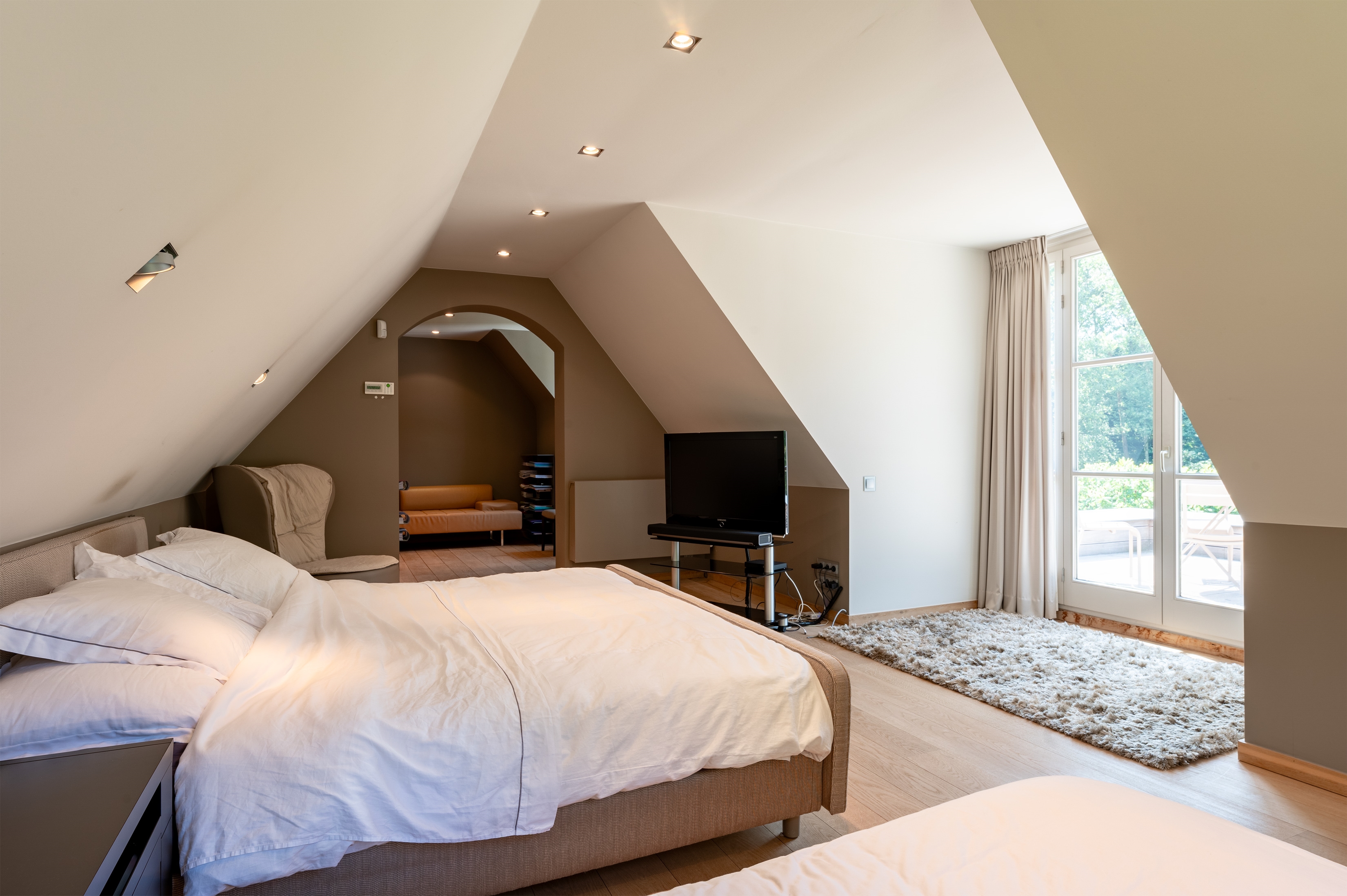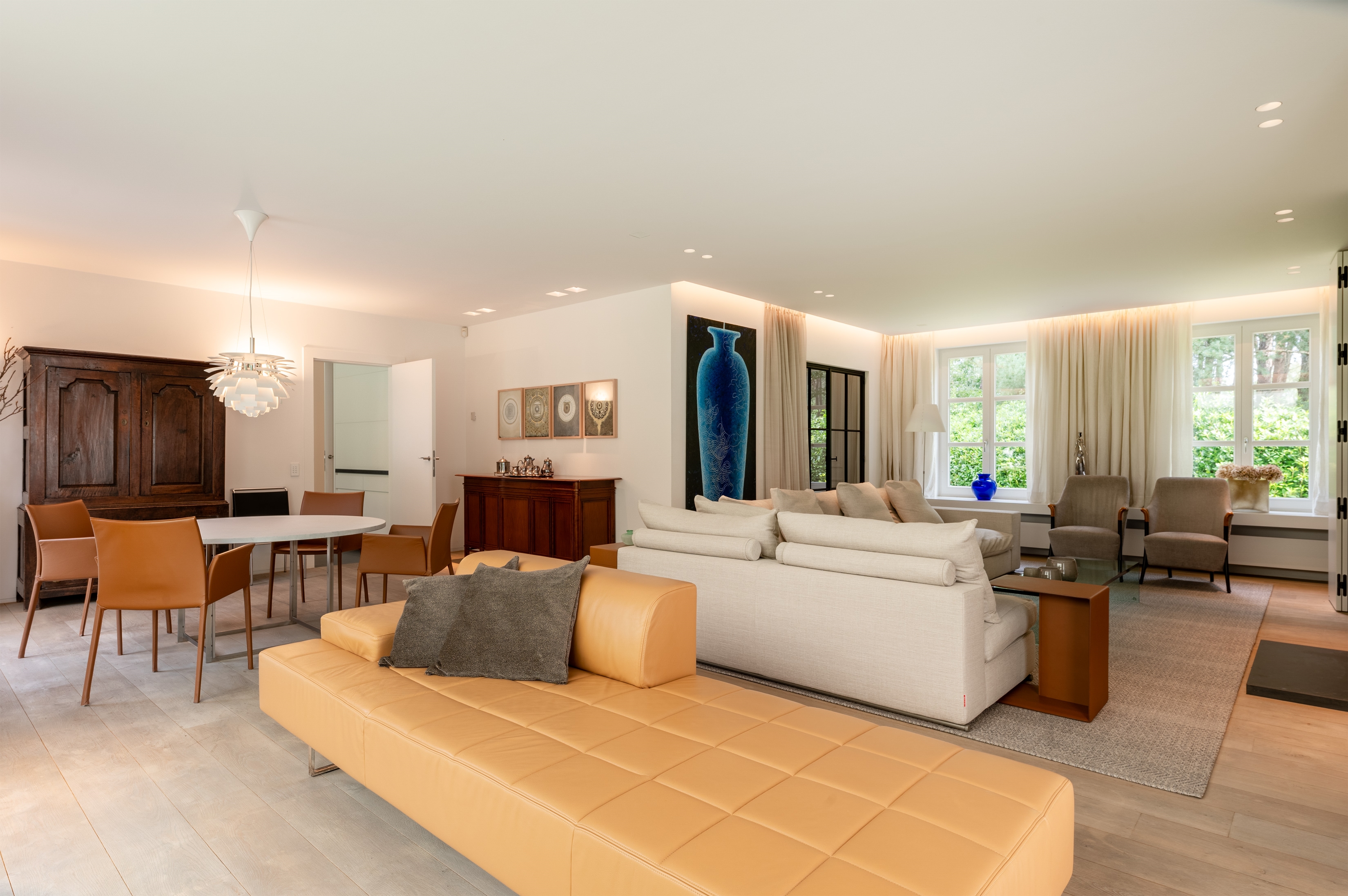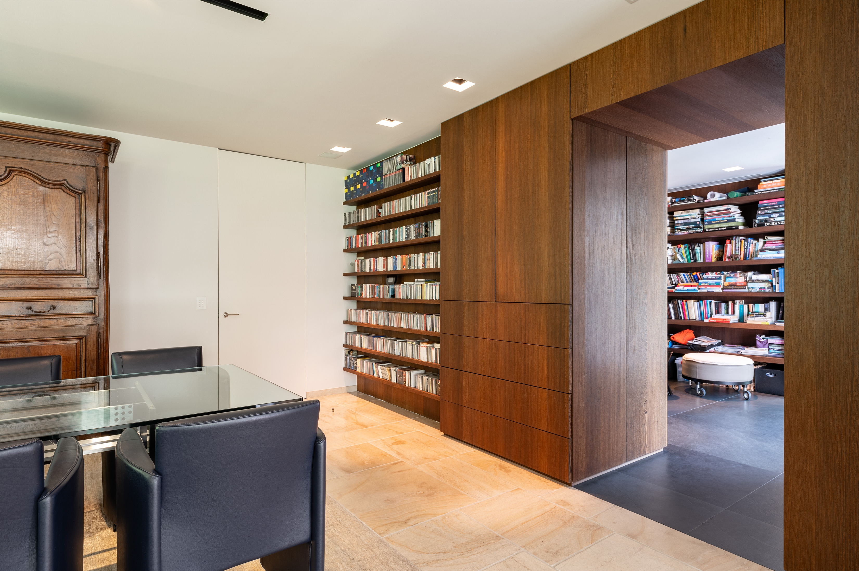 - Een TV-kamer (ca. 55 m²) met ingemaakte kasten en eveneens dubbel openslaande deuren en schuifraam naar terras