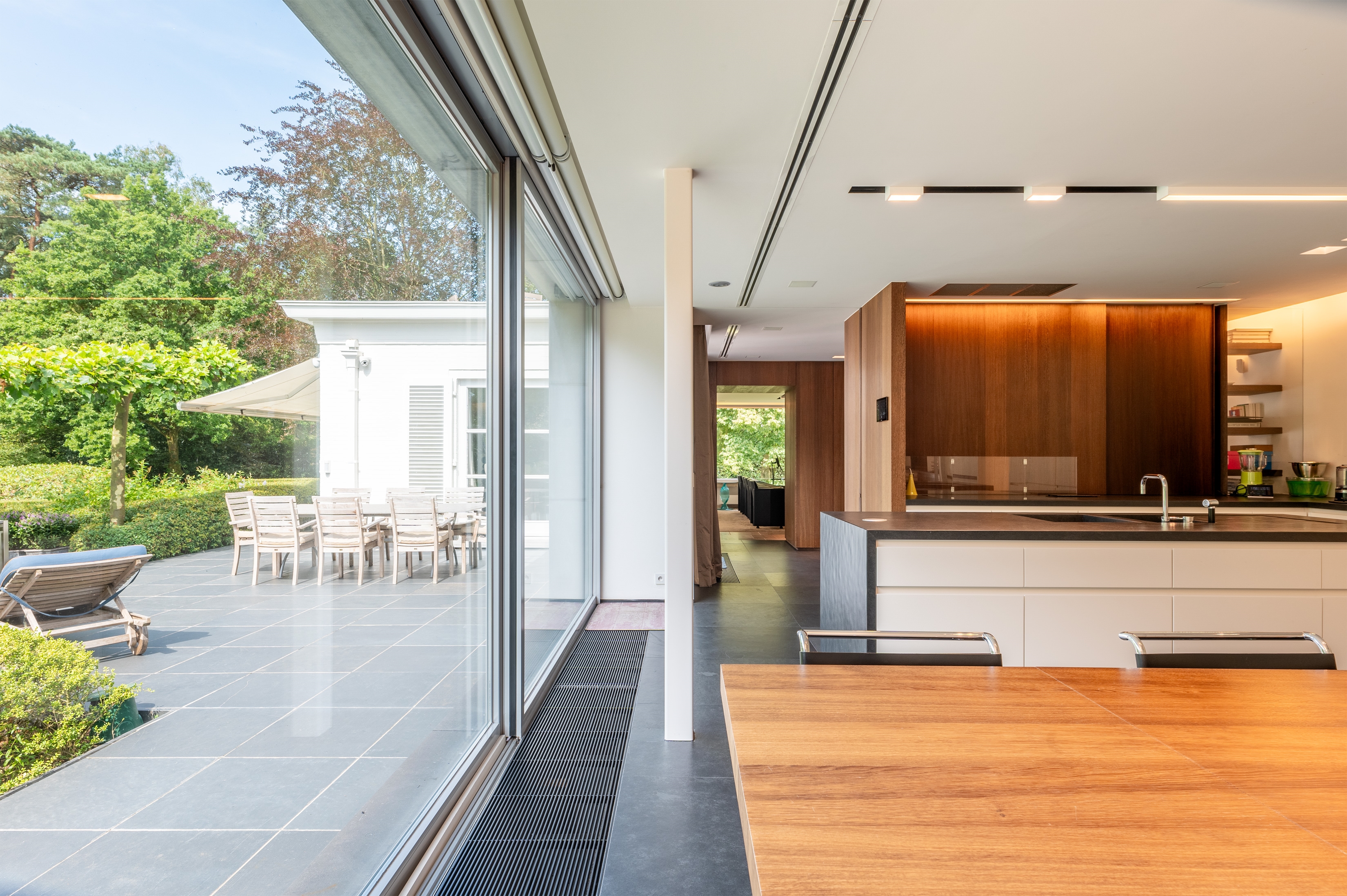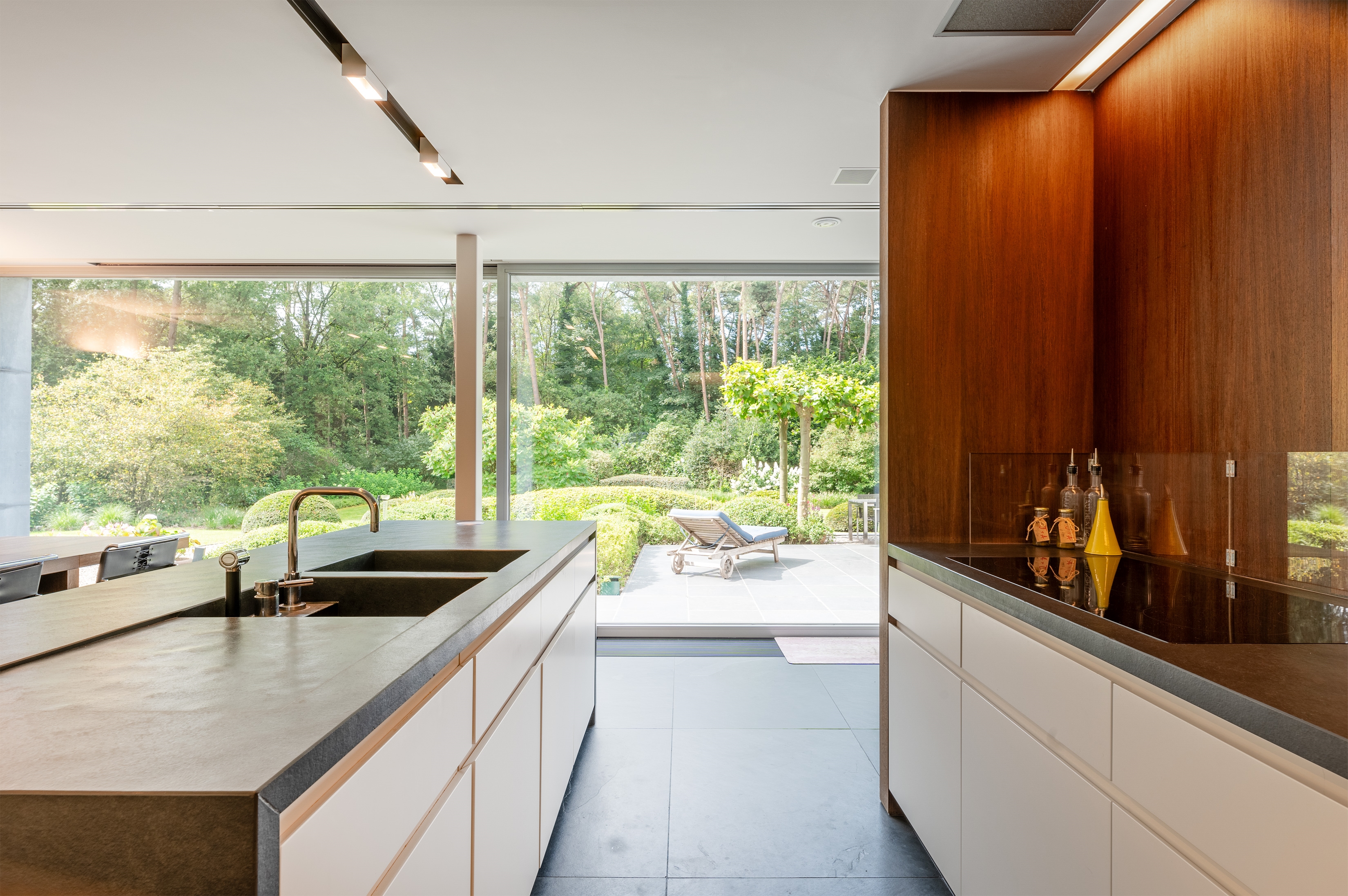 - Een royale leefkeuken (ca. 34 m²) met inbouwtoestellen waaronder o.a. Gaggenau oven, warmhoudlade, inductie, koelkast en vrieslade, alsook een eiland voorzien van dubbele gootsteen, Miele vaatwasser en ingemaakte kasten. Groot schuifraam naar de tuin