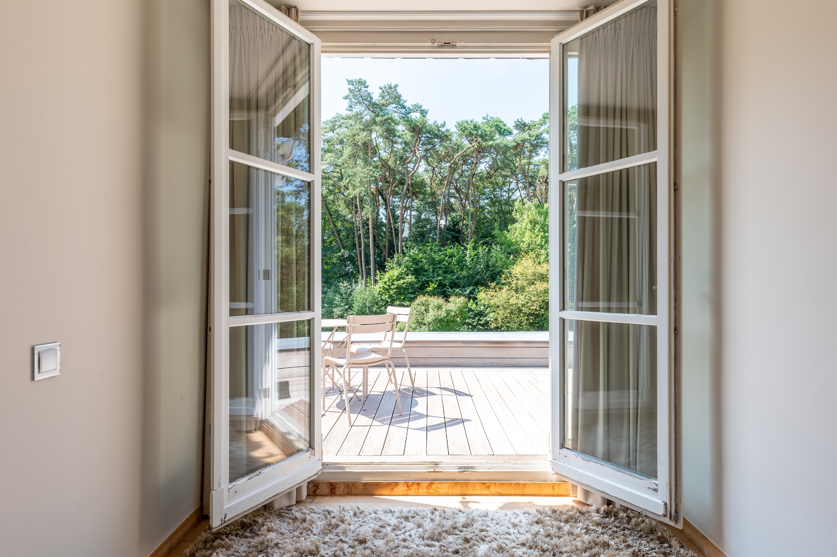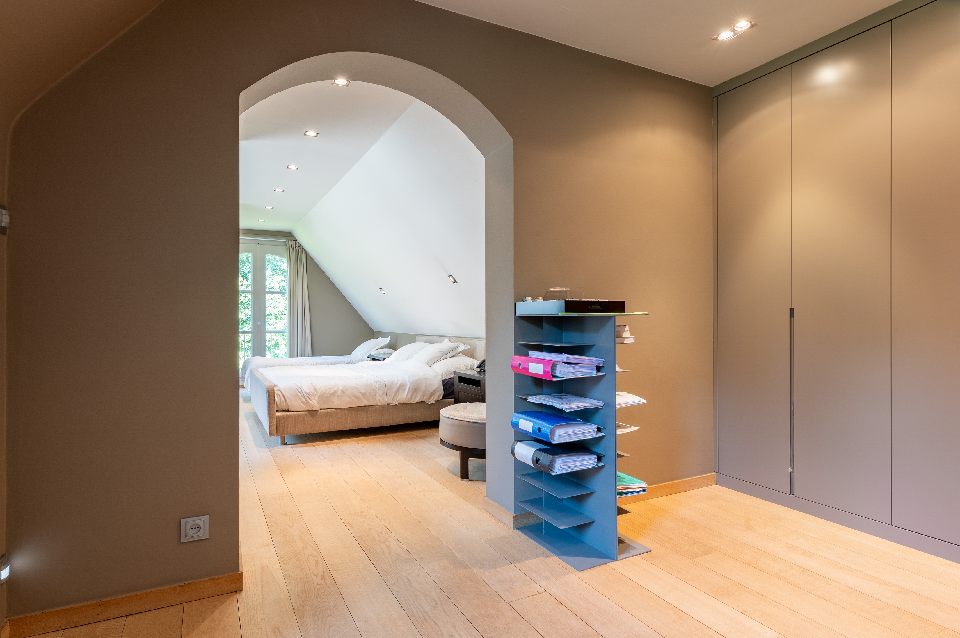 - Een bureau (ca. 18 m²) met ingemaakte kasten en dubbel openslaande deuren naar terras